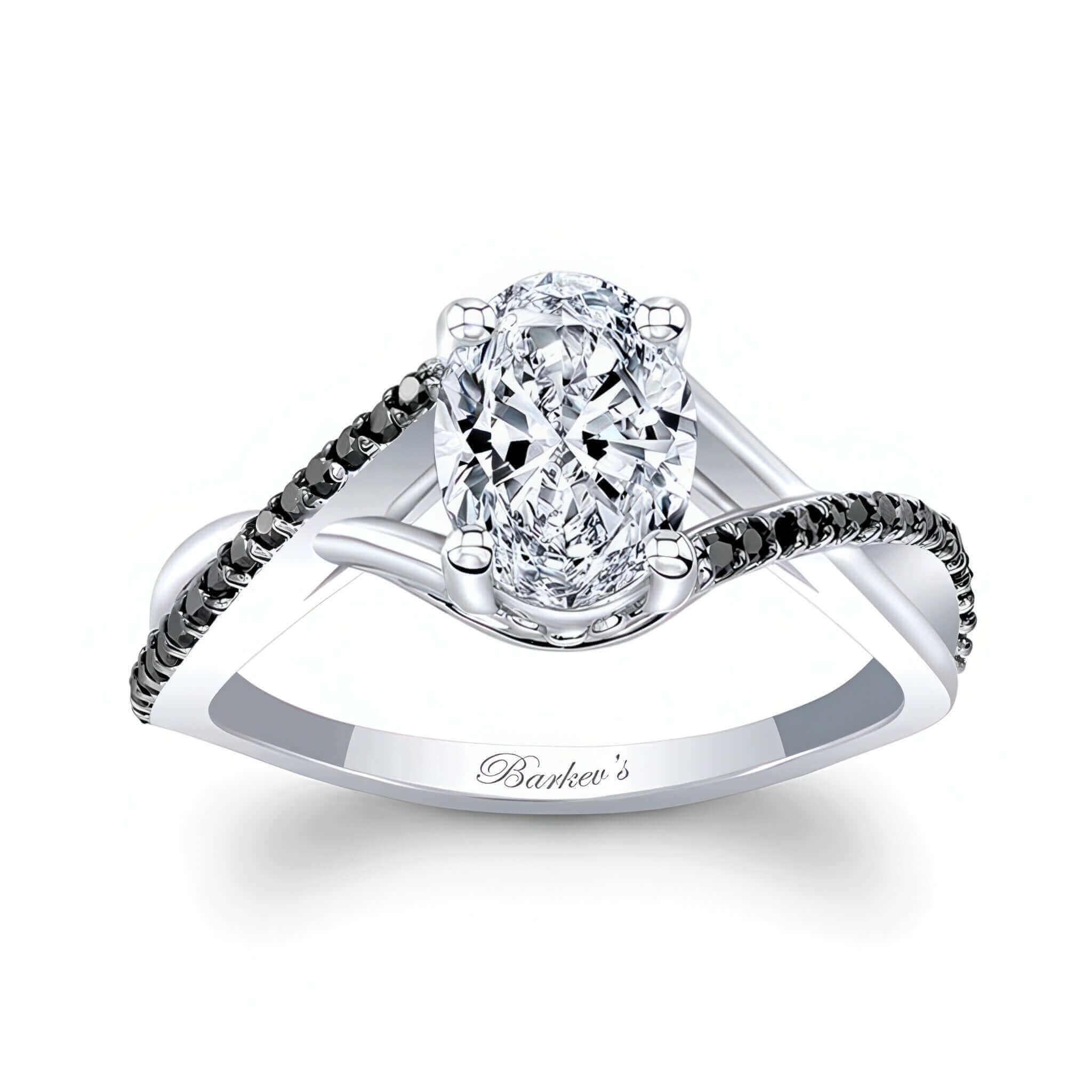 A simple one carat oval moissanite black diamond accent ring featuring an oval center, a criss crossing split shank and shared prong black diamonds on the sides.