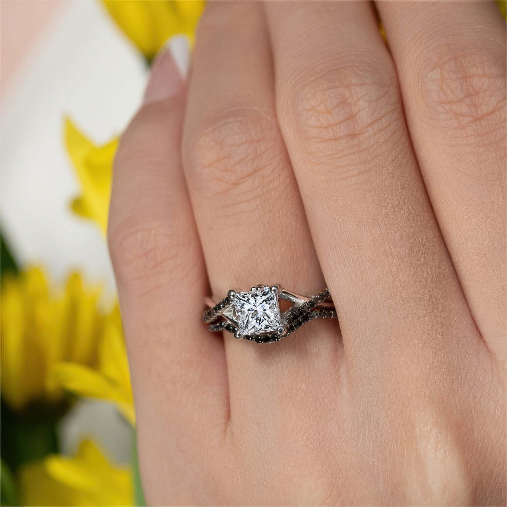 A simple one carat princess cut moissanite black diamond accent bridal set featuring a princess cut center, a criss crossing split shank and shared prong black diamonds on the sides. Comes with a matching wedding band.