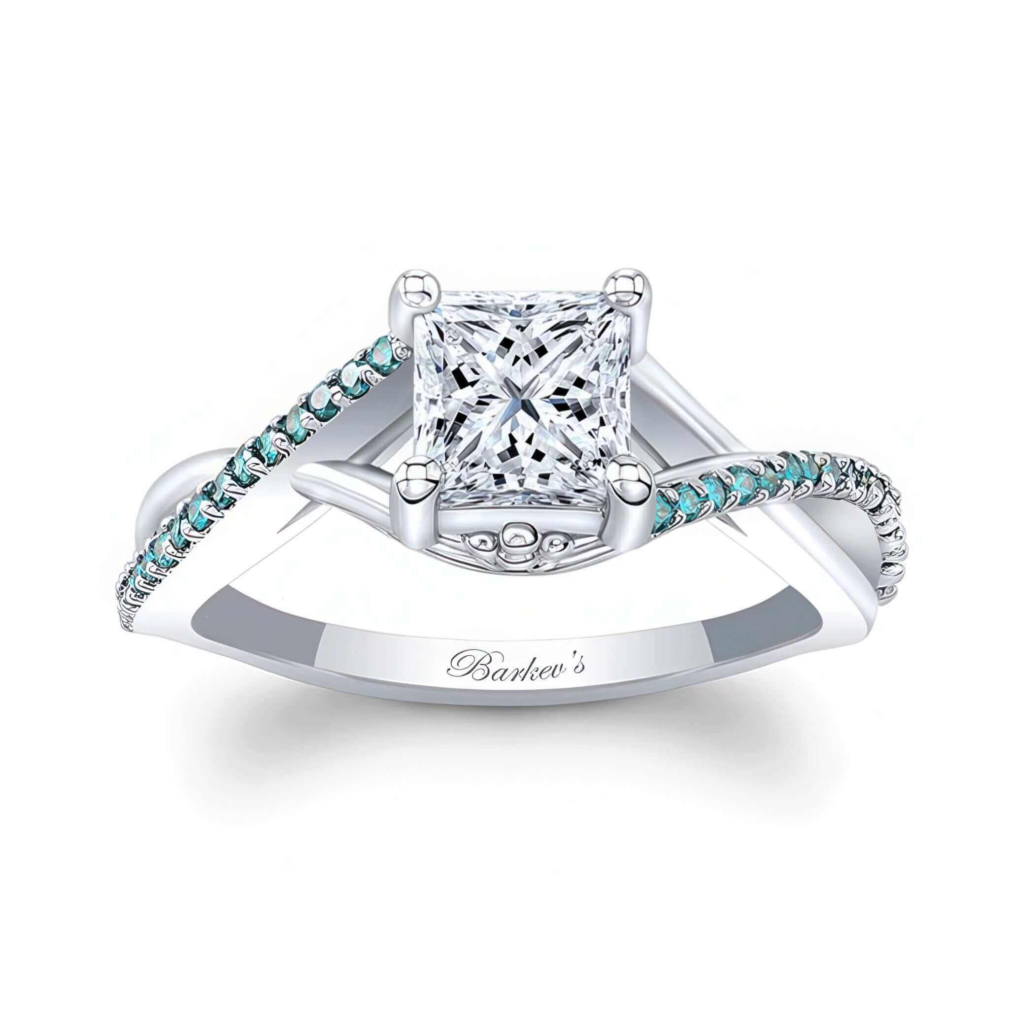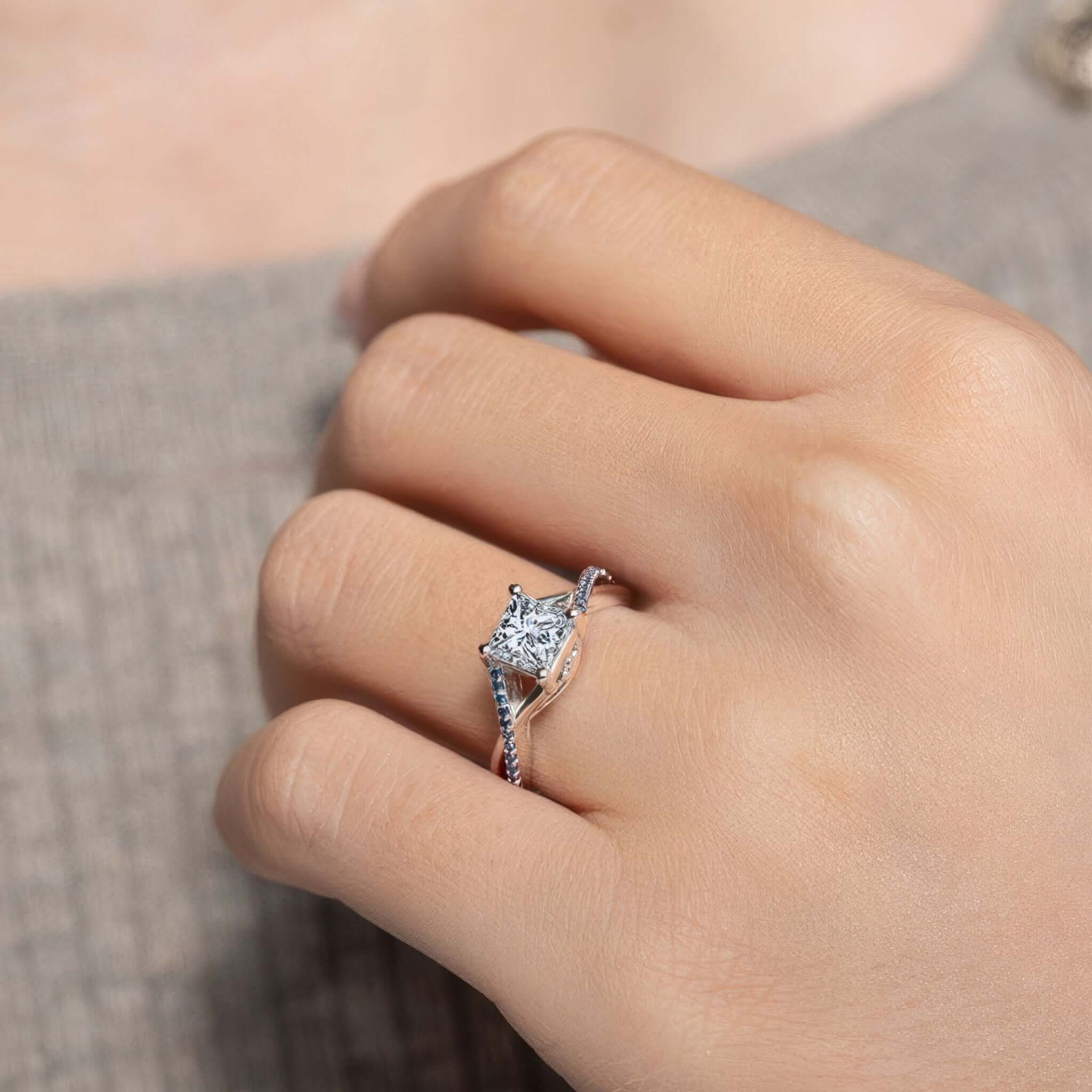 A simple one carat princess cut moissanite blue diamond accent ring featuring a princess cut center, a criss crossing split shank and shared prong blue diamonds on the sides.