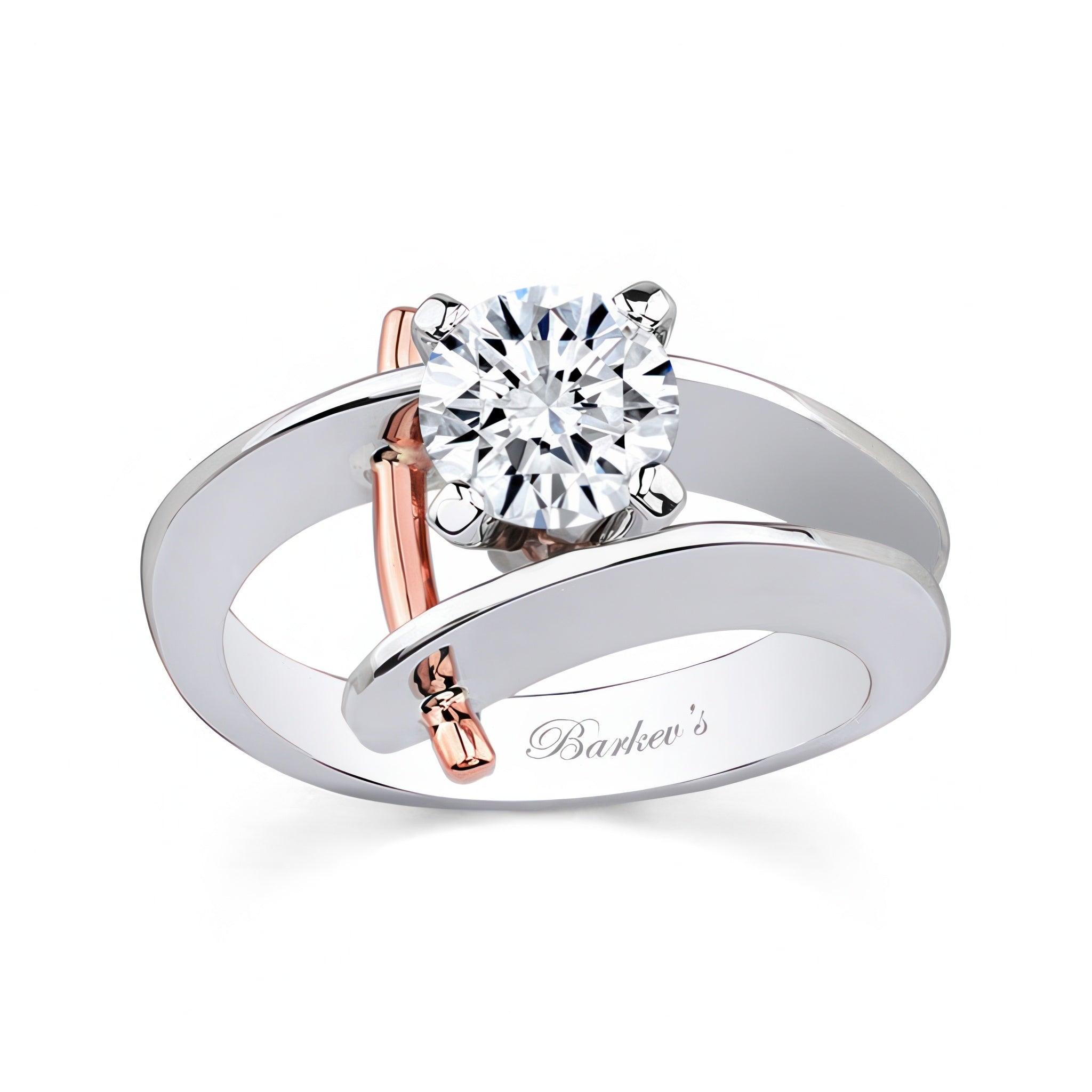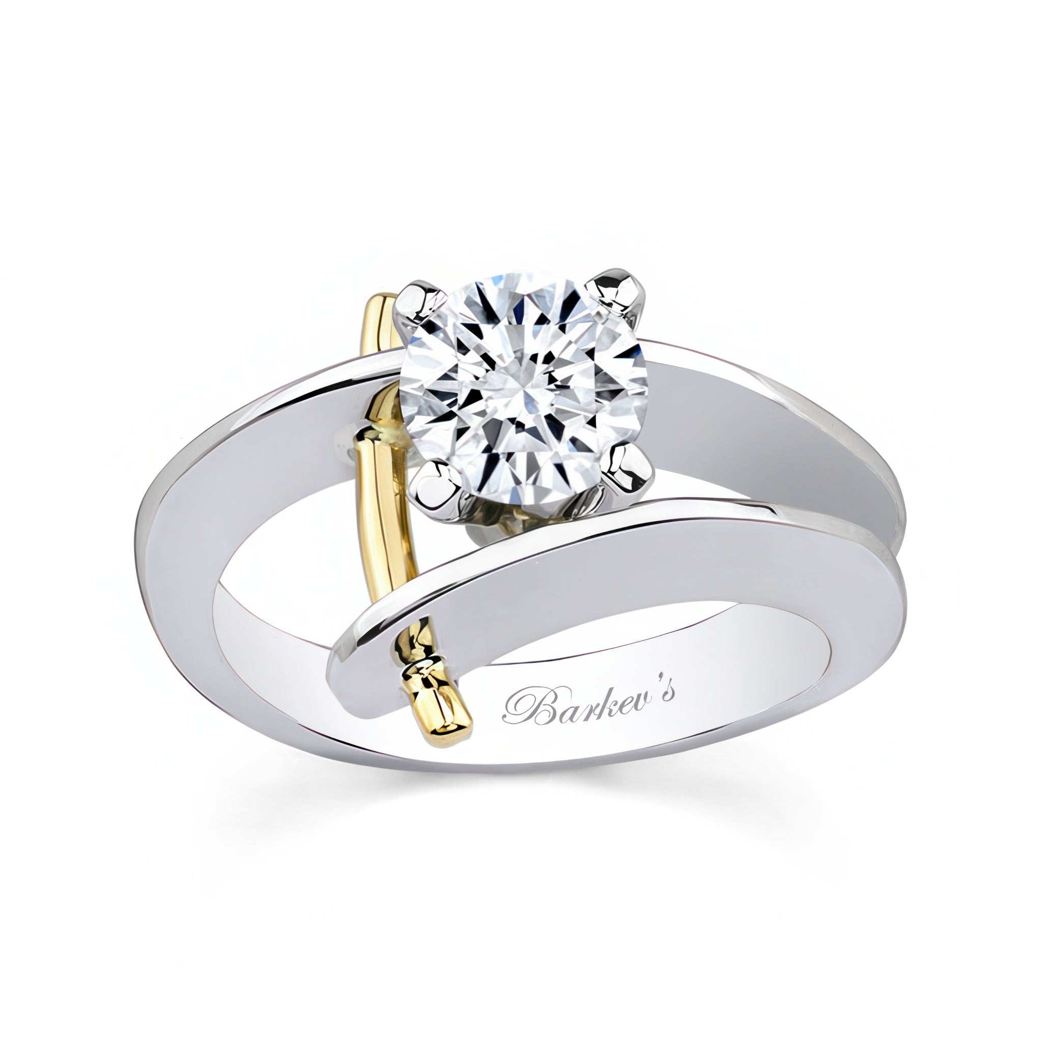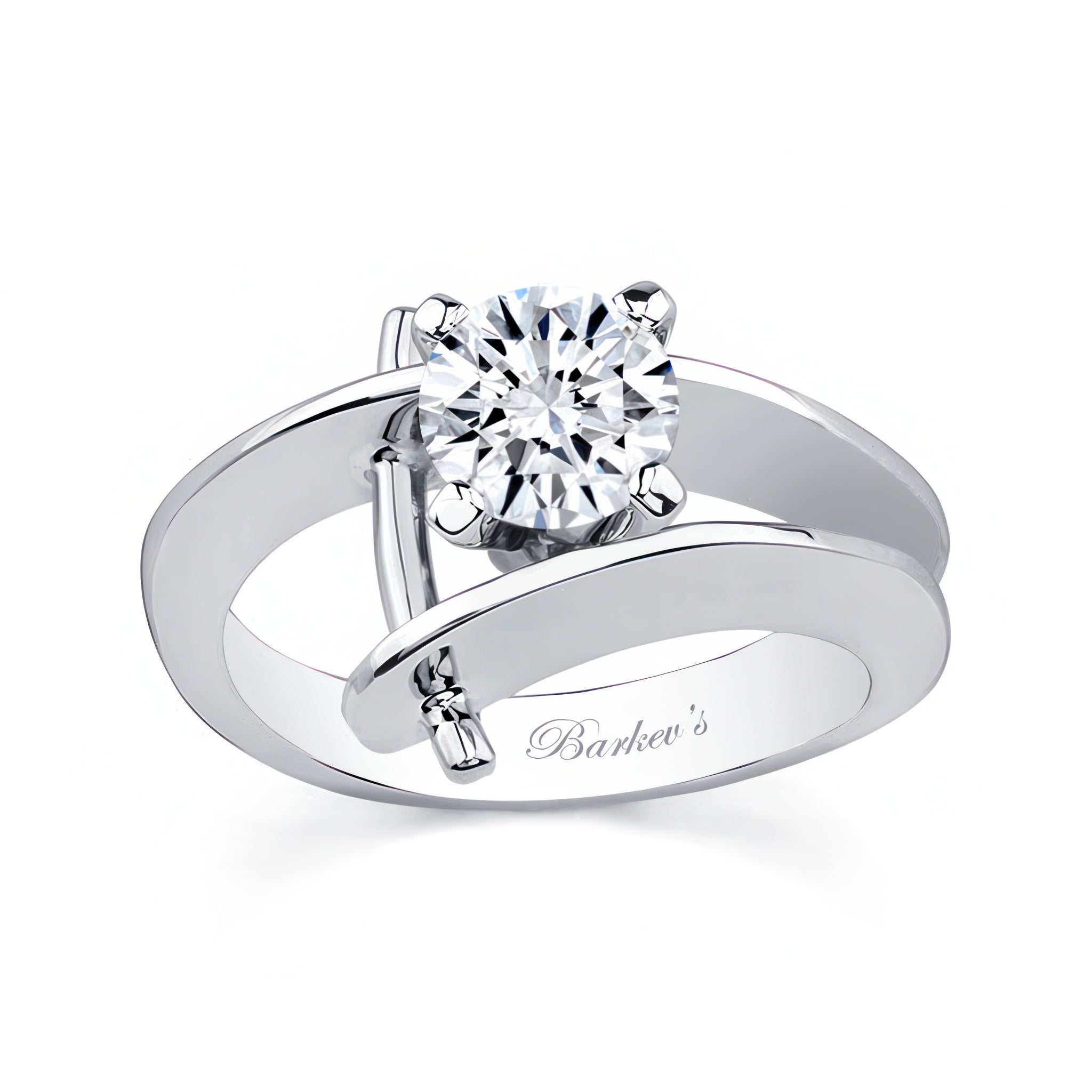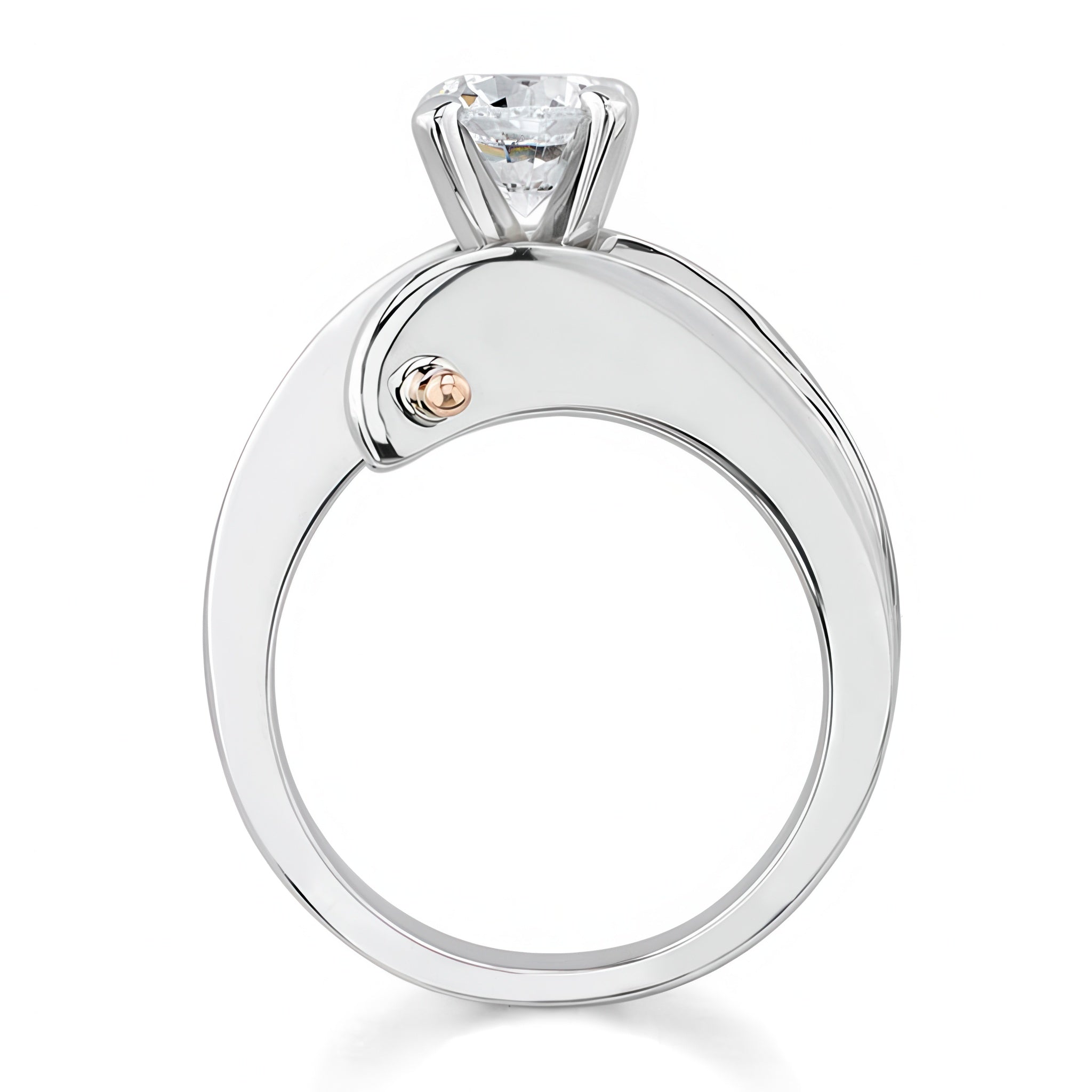 This open solitaire moissanite ring sports a prong set round center with a slim flat open shank and a beautiful wire trim accent that pokes through the walls for an added touch of drama.