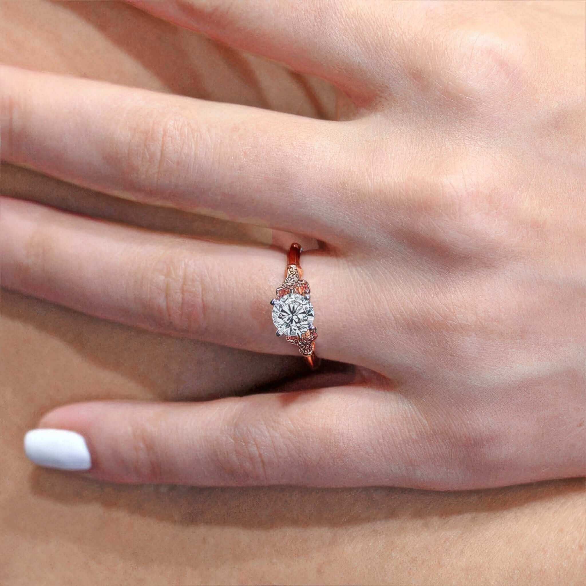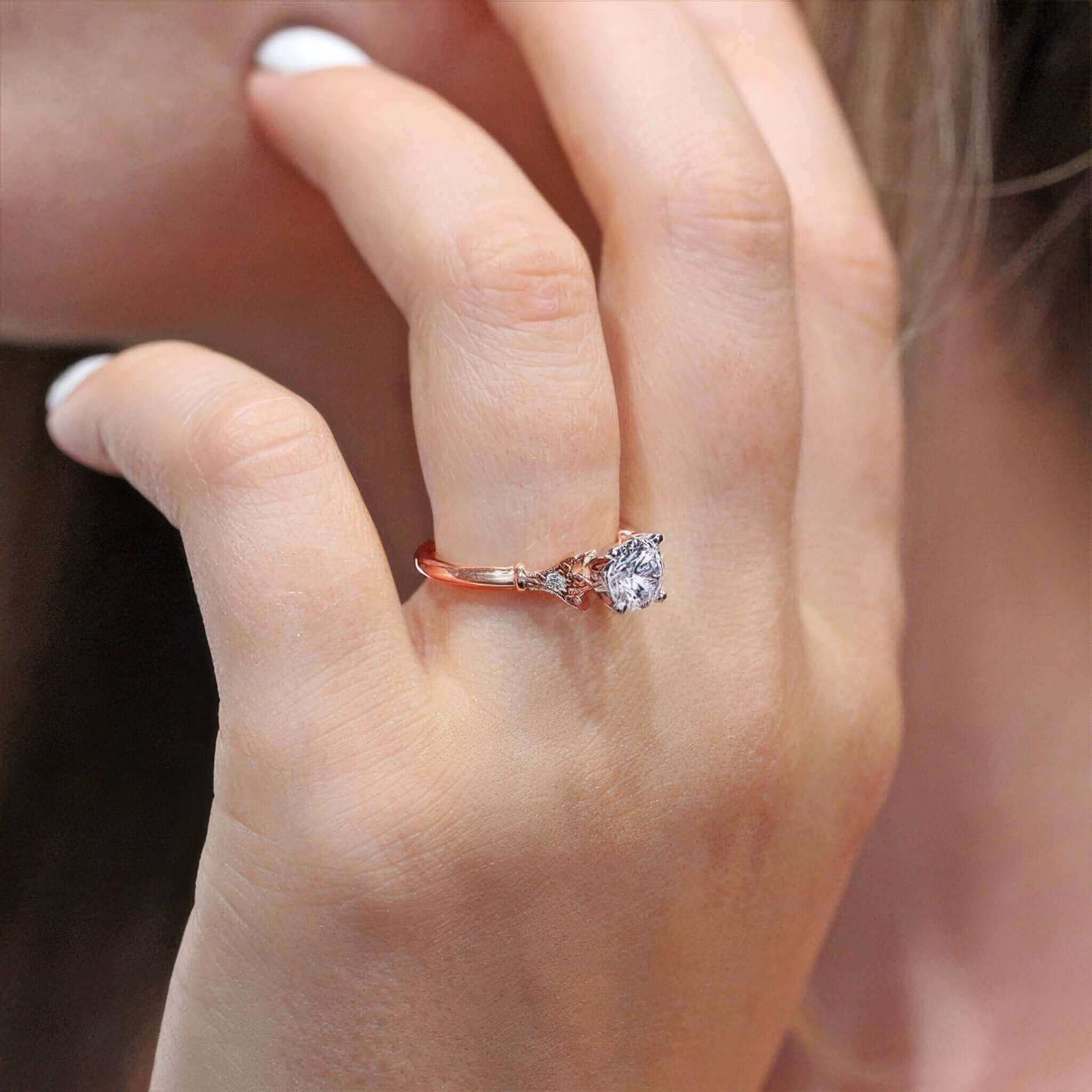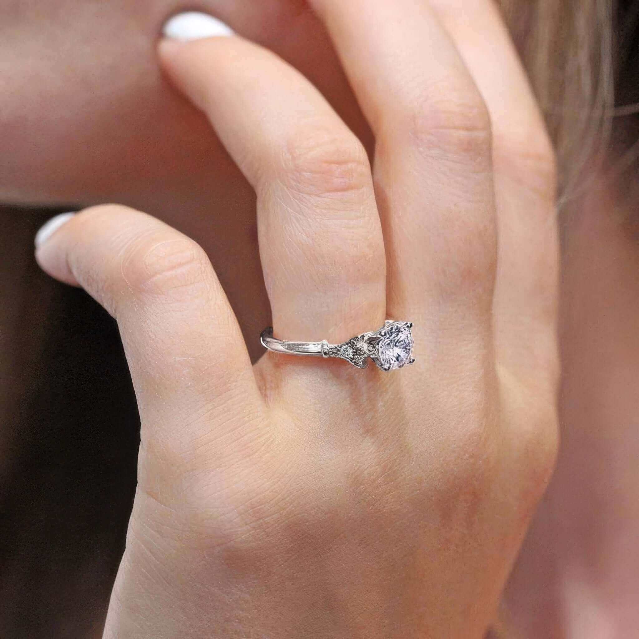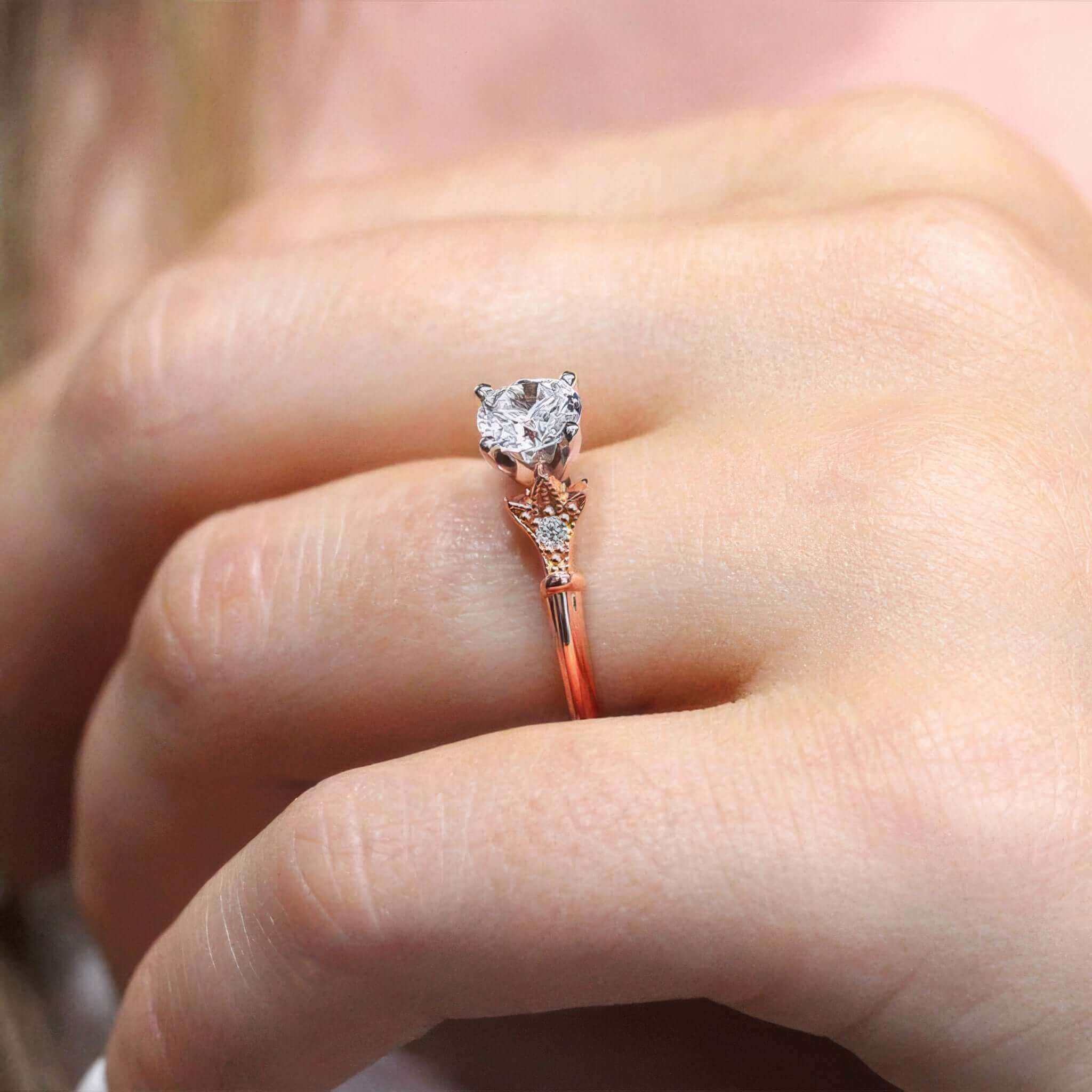 A beautiful petite leaf moissanite engagement ring featuring a minimal design with a prong set round center and 2 diamonds embedded into the center of a leaf motif on each side for a stunning vintage look.