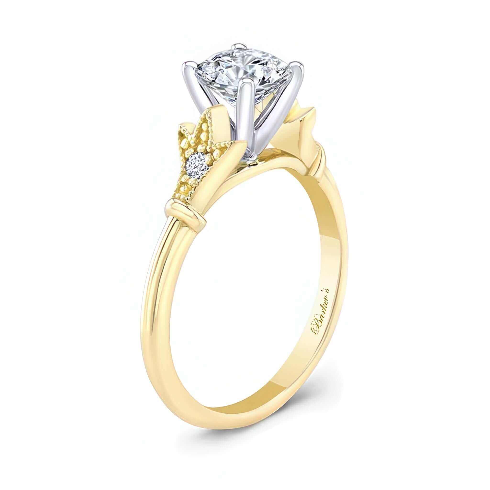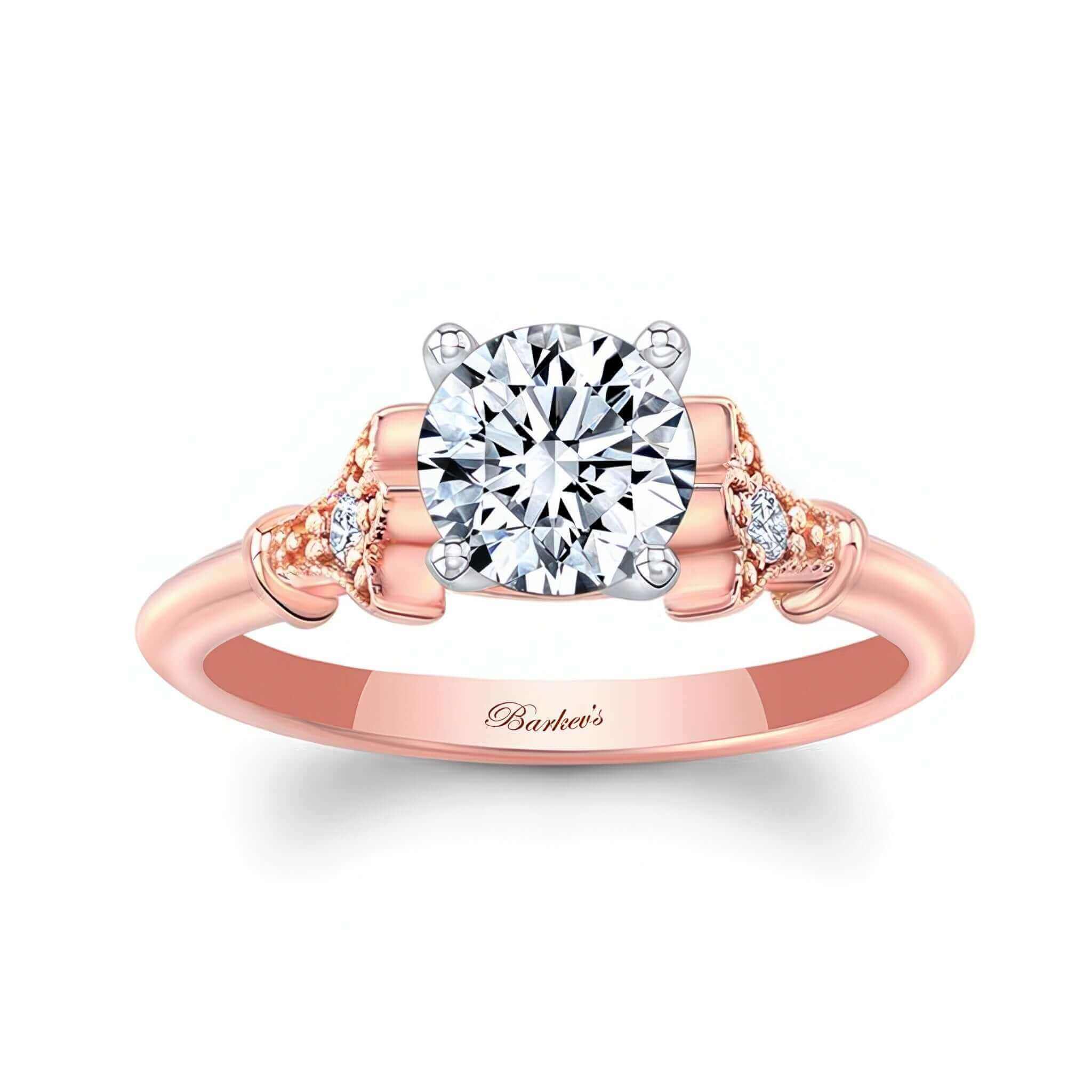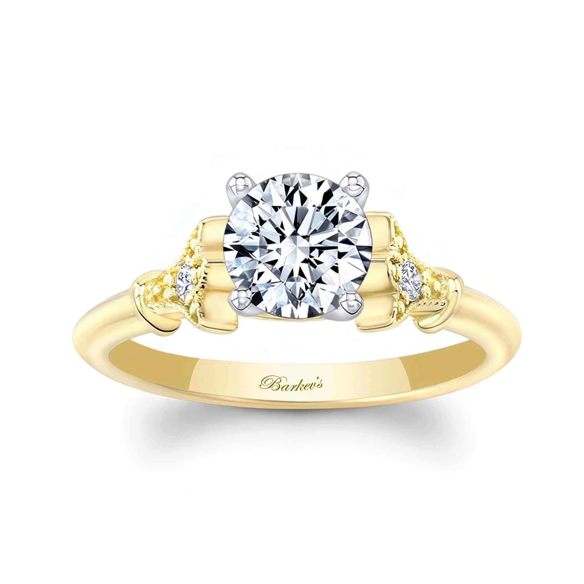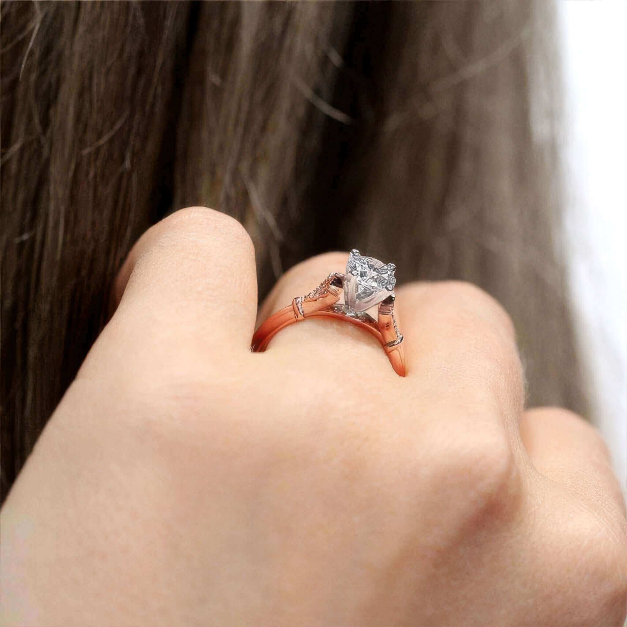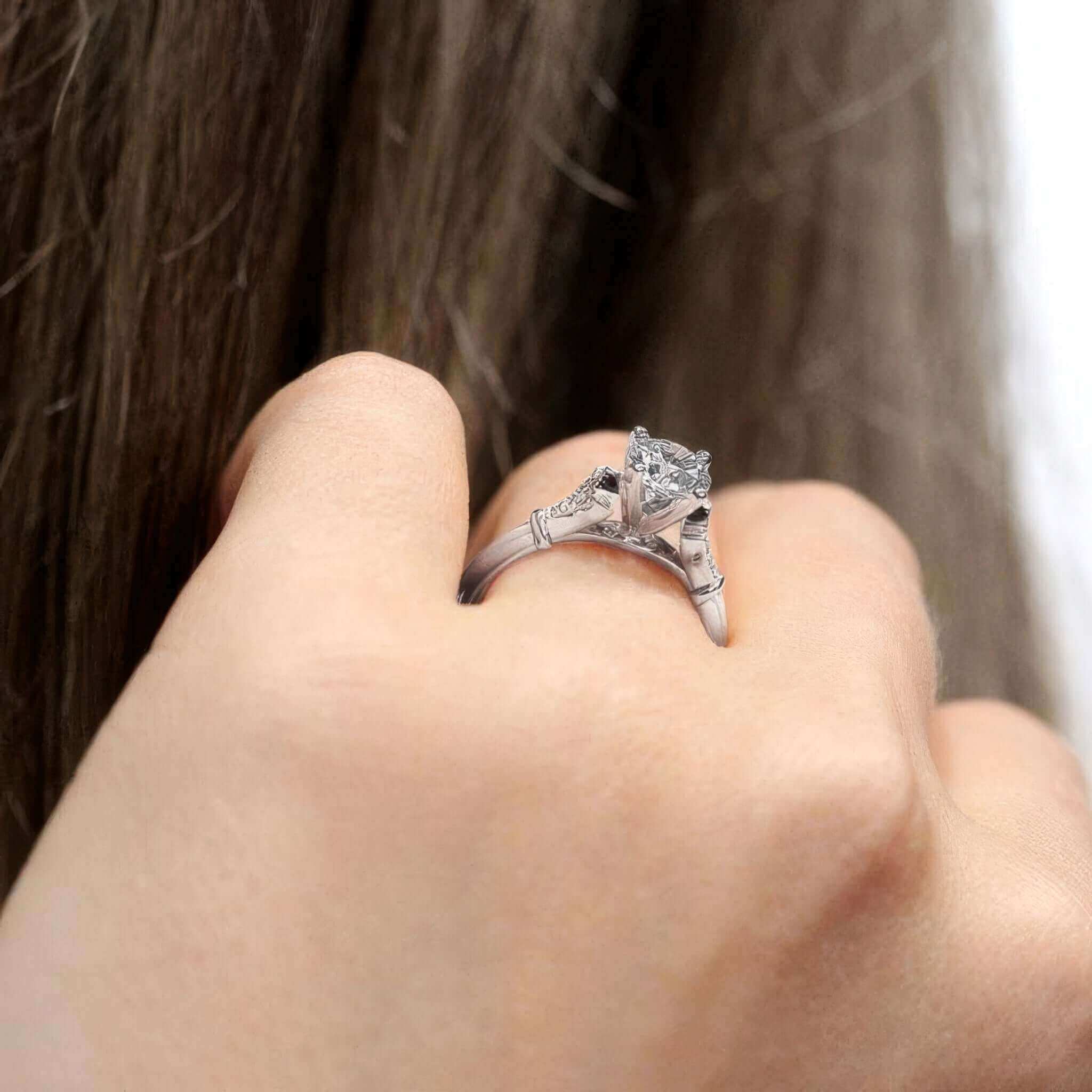 A beautiful petite leaf moissanite engagement ring featuring a minimal design with a prong set round center and 2 diamonds embedded into the center of a leaf motif on each side for a stunning vintage look.
