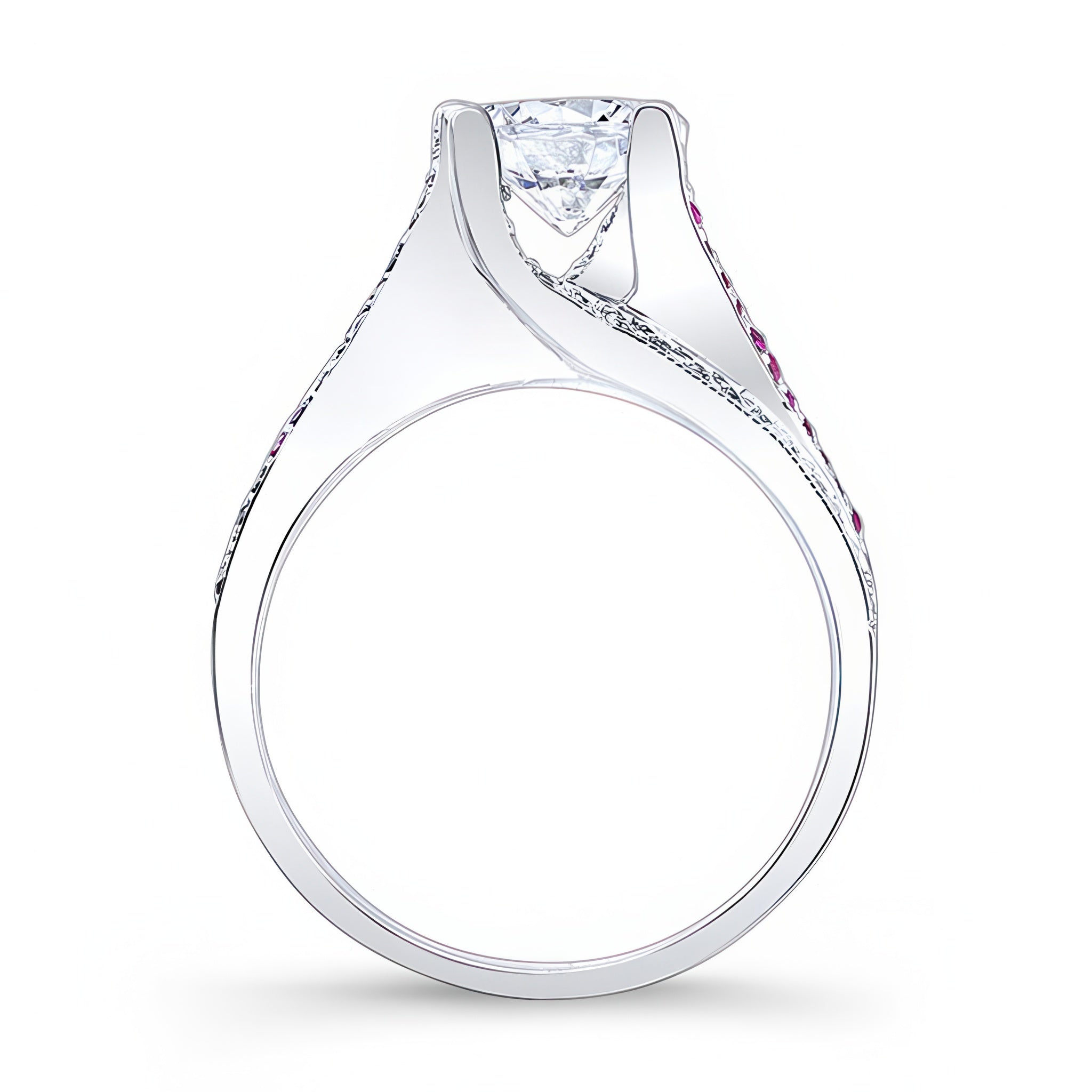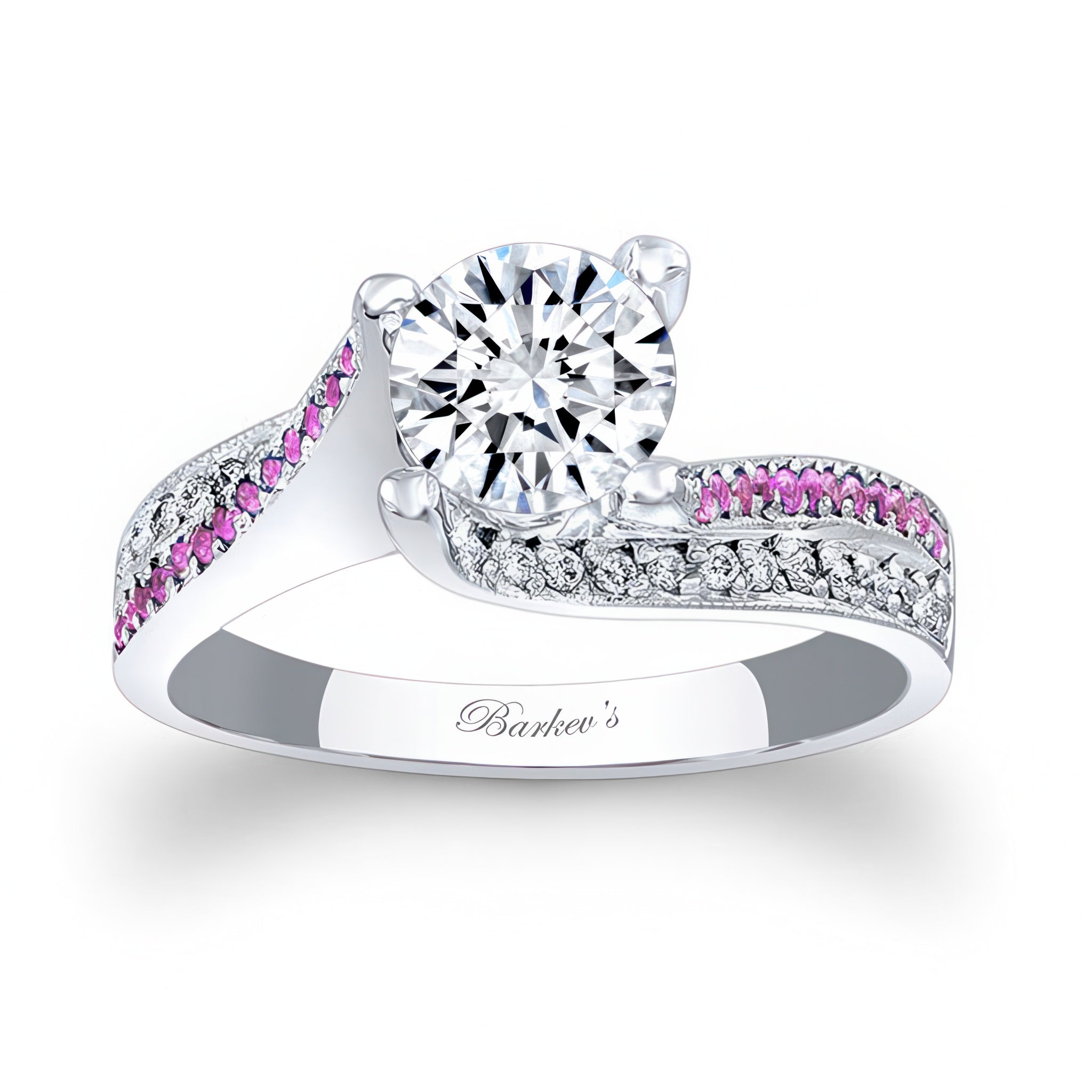 This pink sapphire accent moissanite pave ring features a round center with pave set pink sapphires, diamonds and mil-grain detailing for a sophisticated flair.