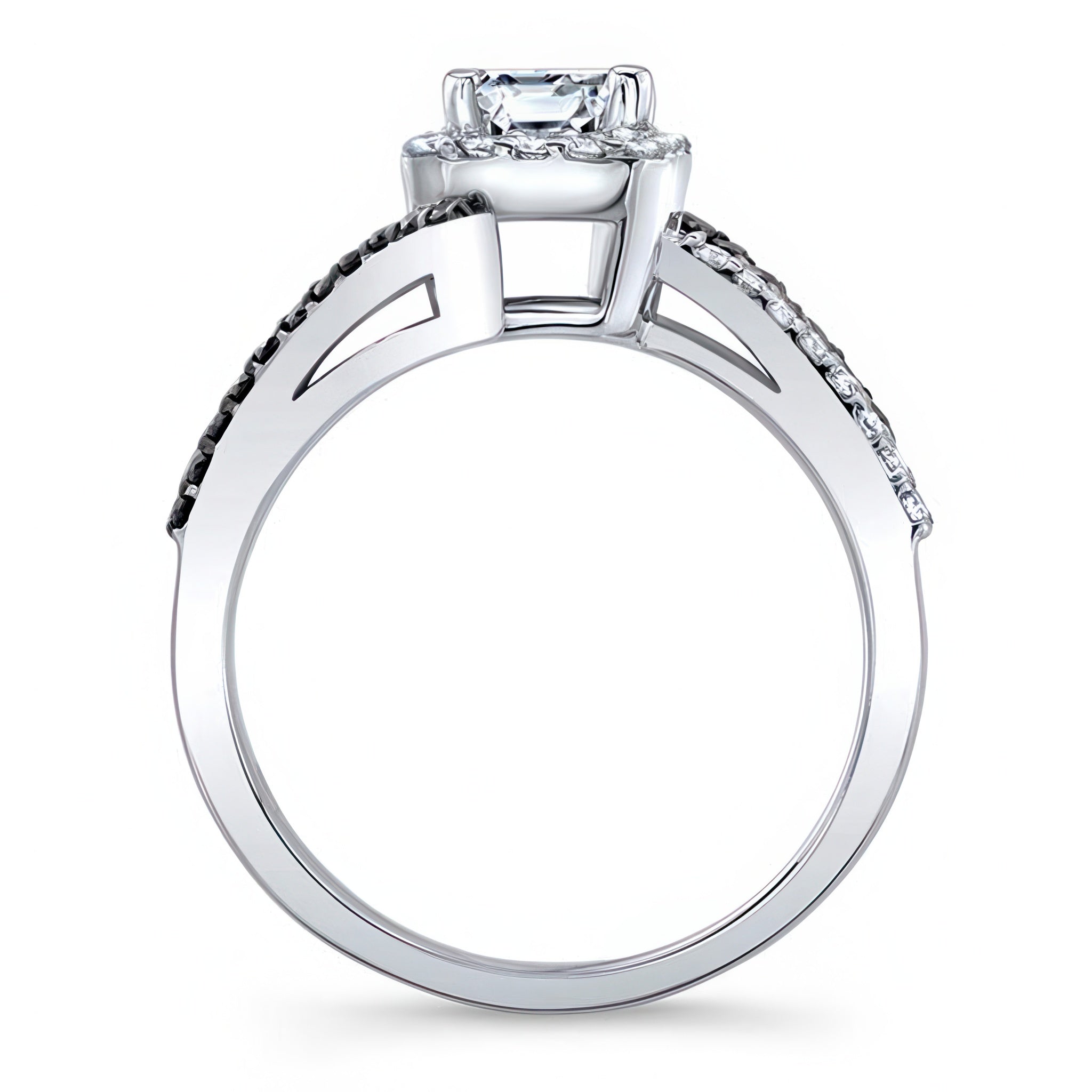 This rectangle halo moissanite engagement ring with black diamonds features a prong set center encircled with diamonds and a split shank adorned with shared prong set white and black diamonds for an added touch of elegance.