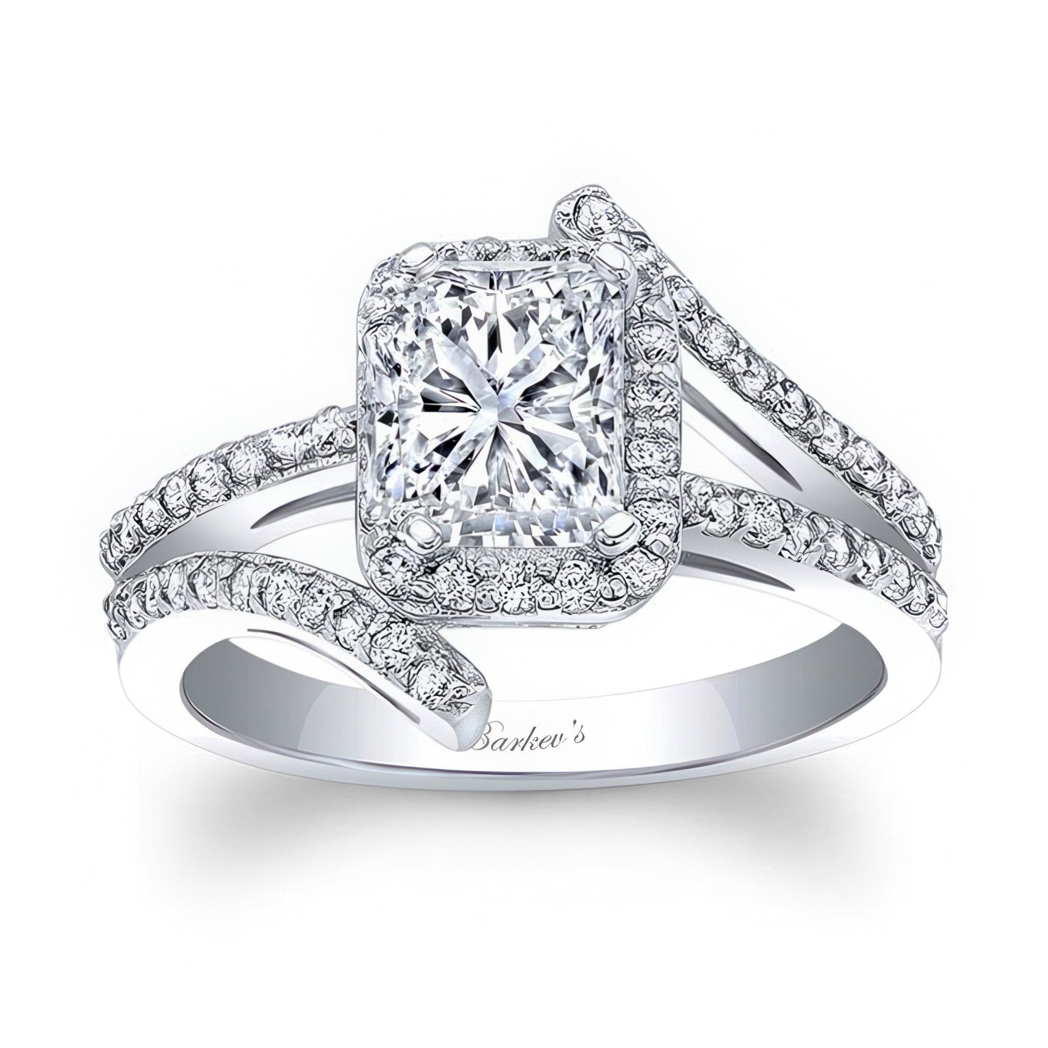 This rectangle halo radiant cut lab diamond engagement ring features a prong set center encircled with diamonds and a split shank adorned with shared prong set diamonds for an added touch of elegance.