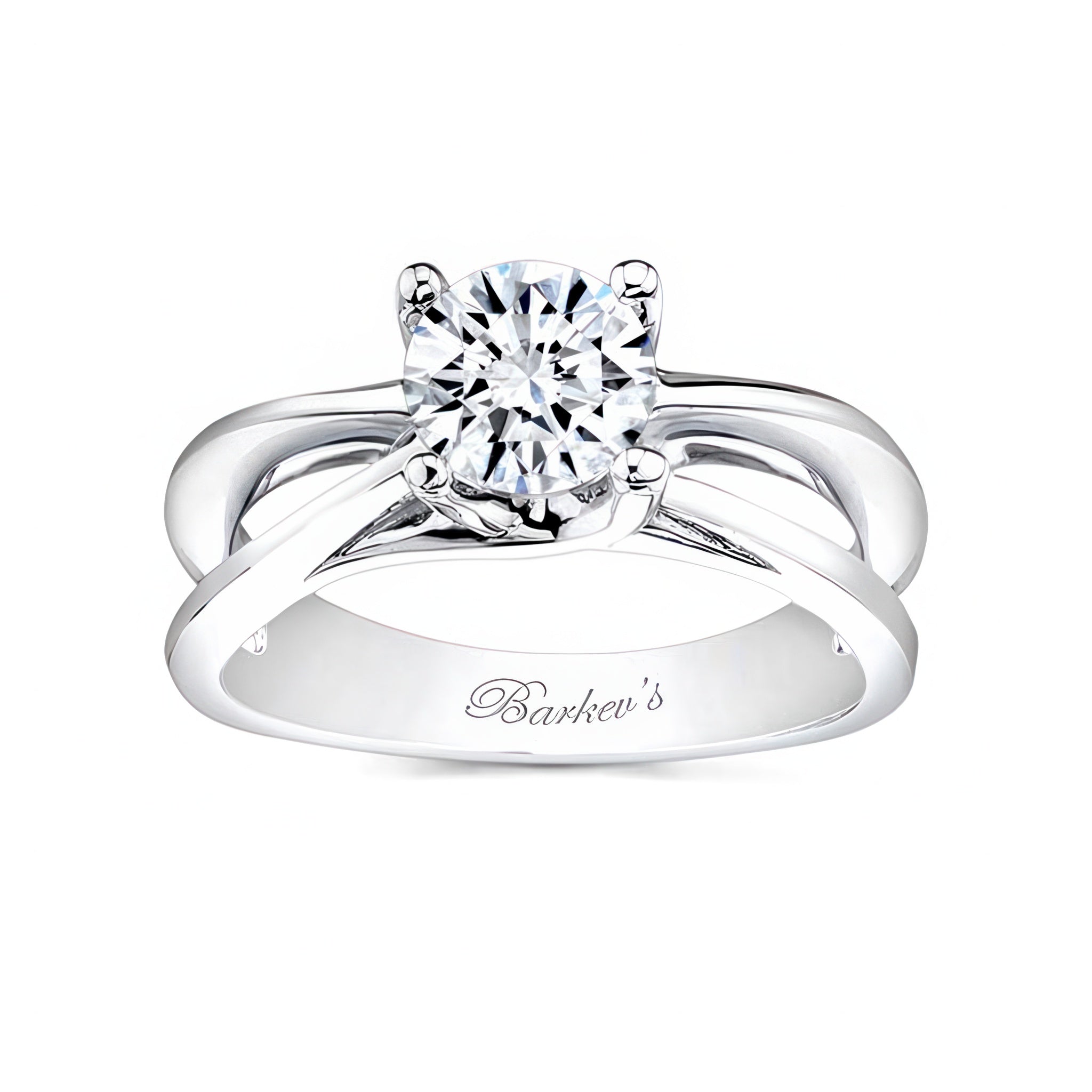 This reverse split shank moissanite solitaire engagement ring features a prong set round center with a beautiful reverse split shank.