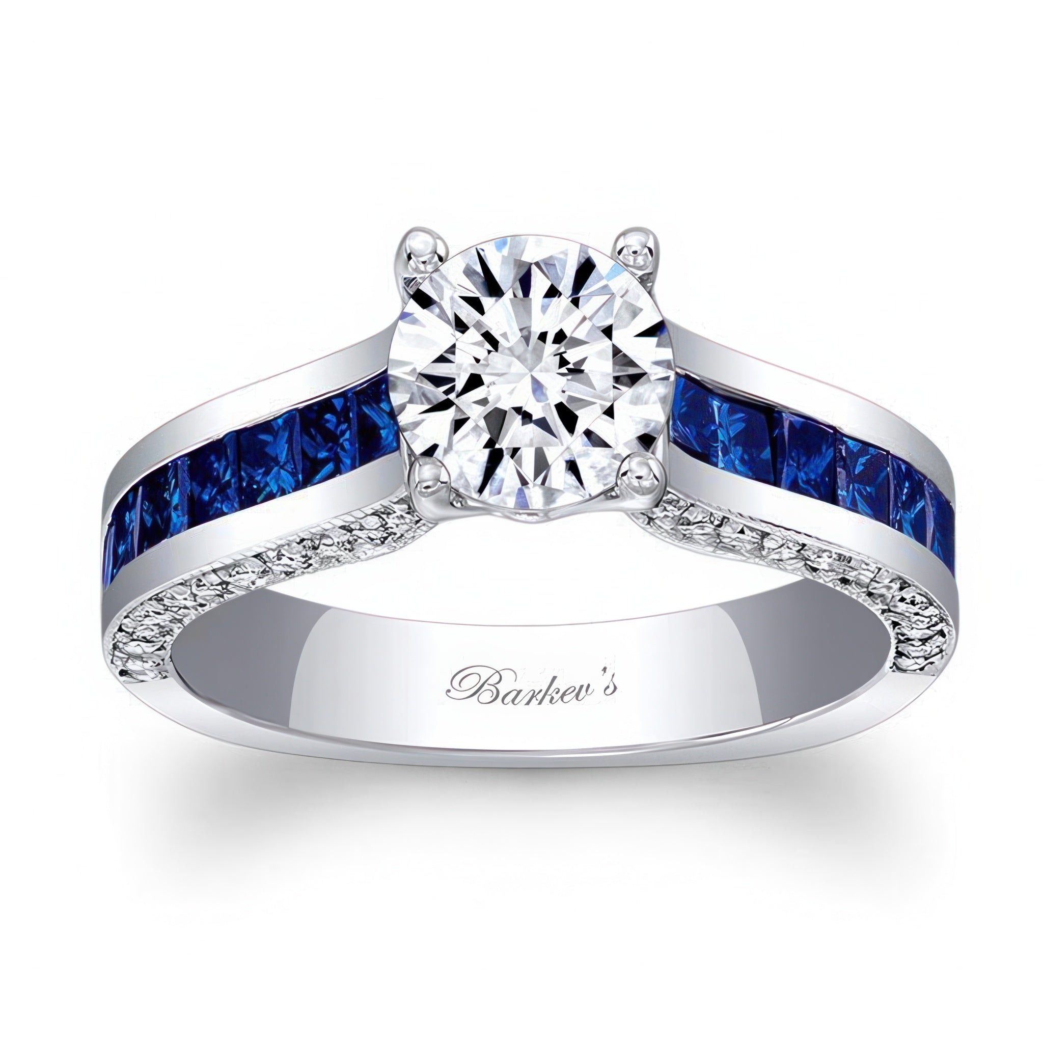 This round and princess cut moissanite ring with blue sapphires has a prong set center with a channel of princess cut blue sapphires on the shoulders and pave set diamonds on the sides for an elegant touch of sophistication.