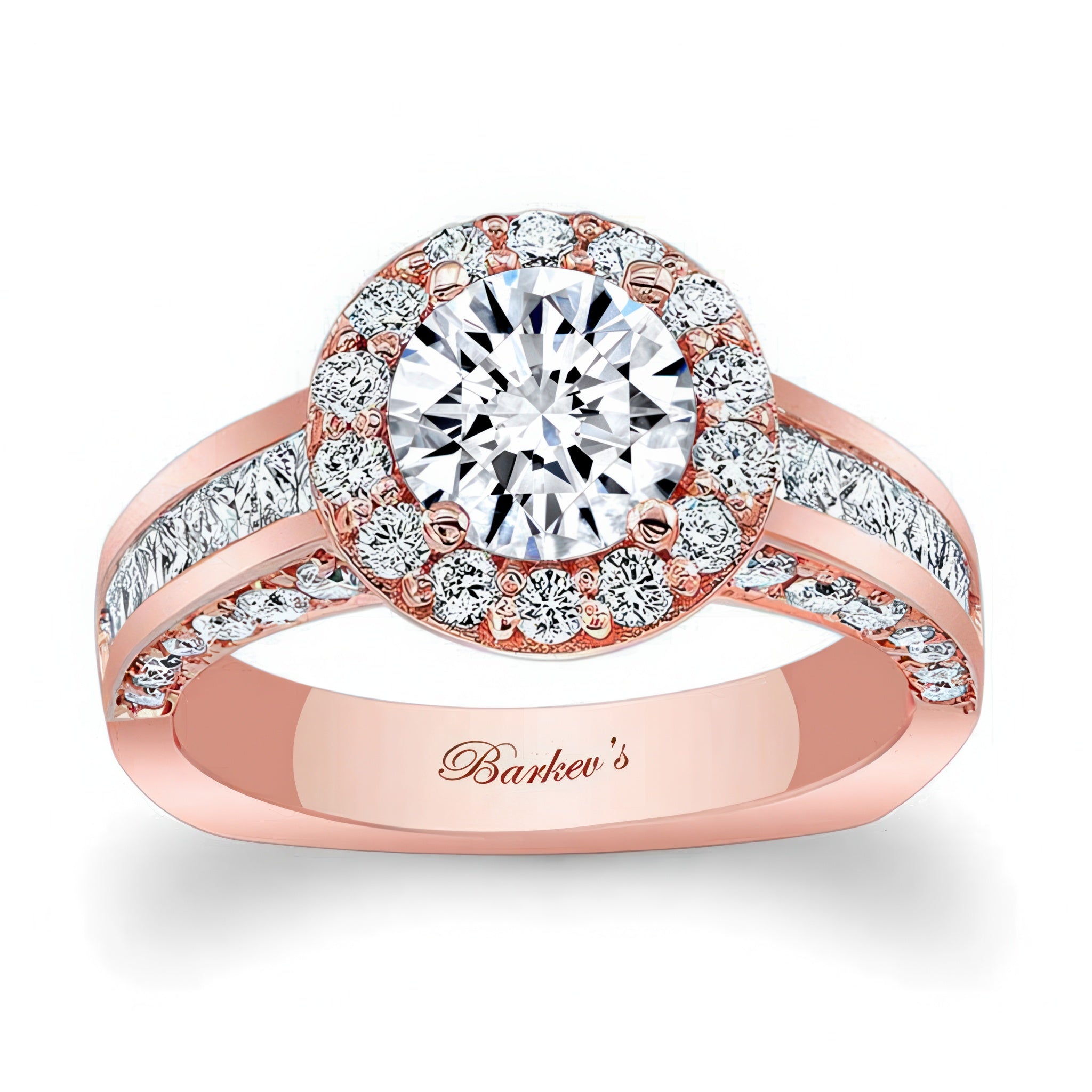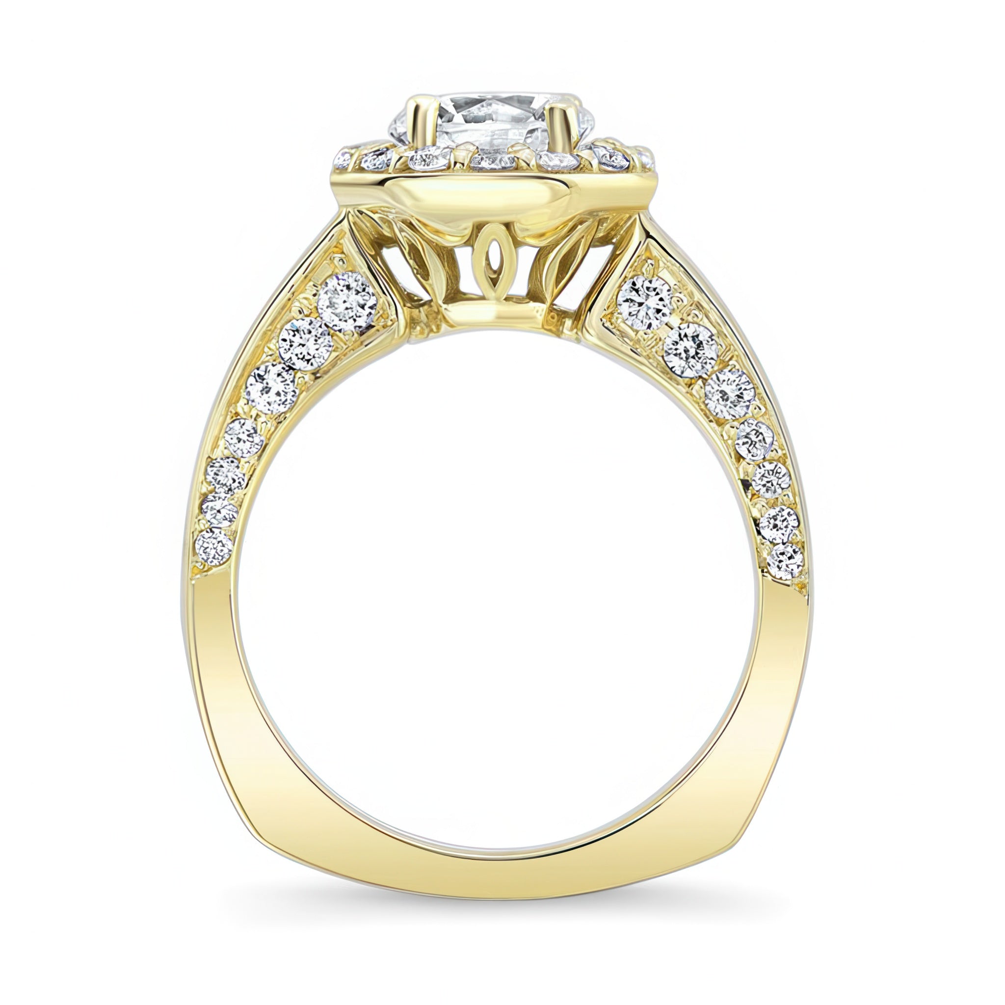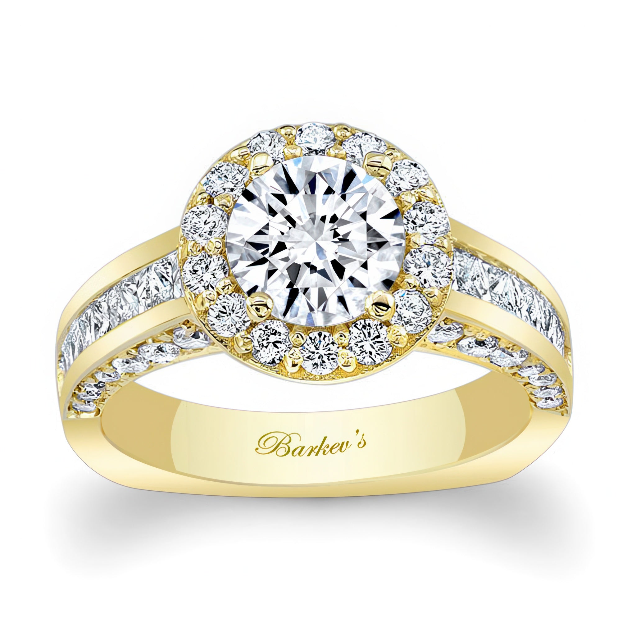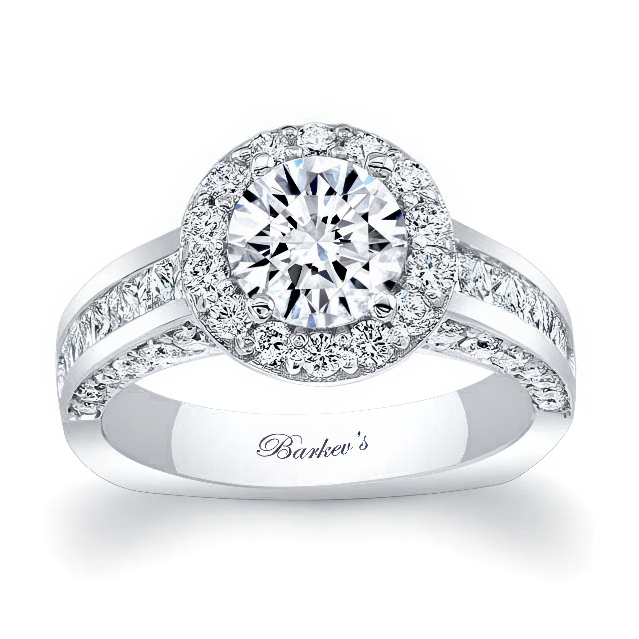 This round cut halo moissanite ring features a cathedral shank with a center framed by a diamond halo and various princess cut and round channel and pave set melees adorning the sides for an elegant flare.