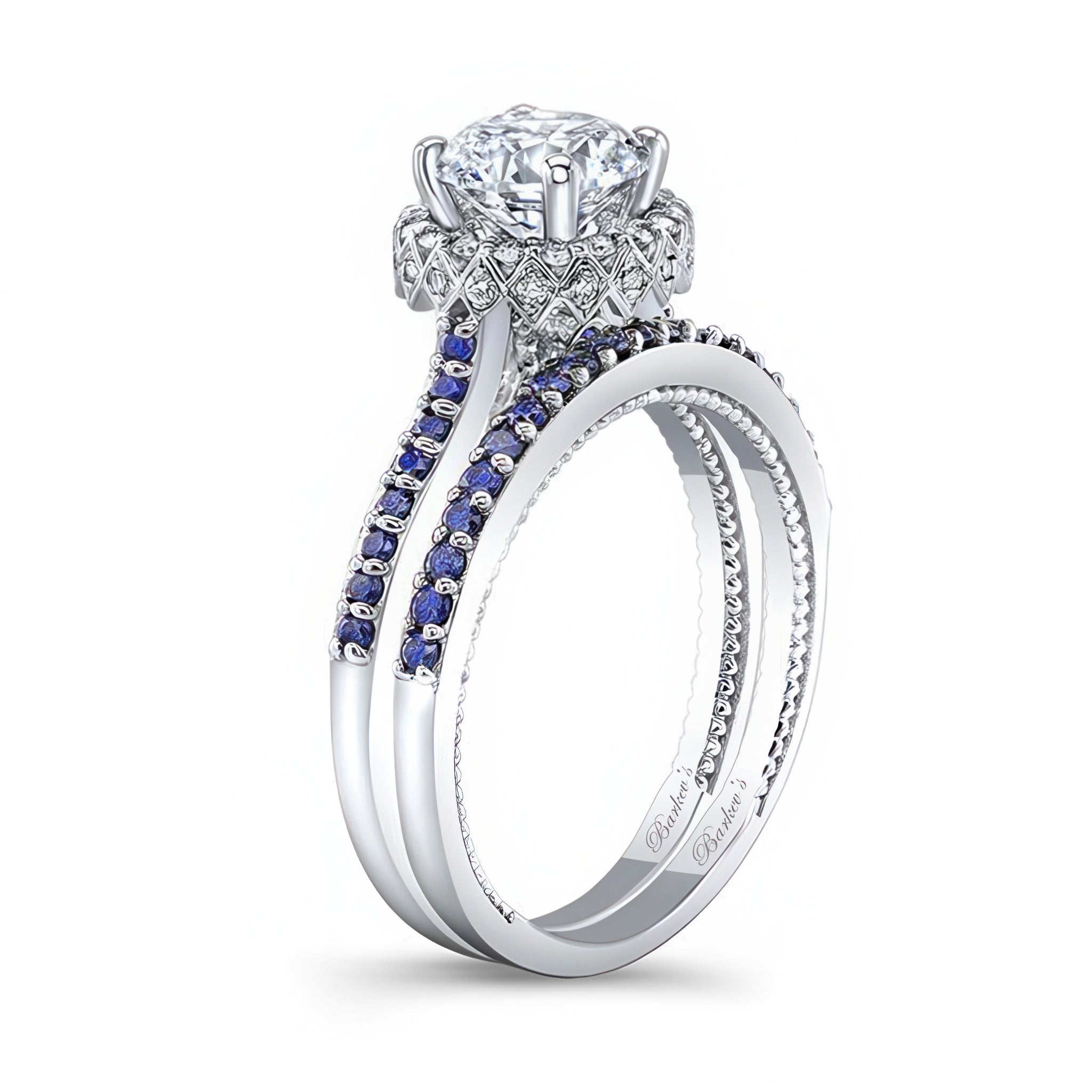 An exquisite round halo moissanite blue sapphire accent wedding set with a center surrounded by shared prong melees that continue down the shoulders. The profile view reveals a second hidden halo around the sides and two larger bezel set blue sapphires sitting just beneath the center. A matching wedding band sits up closely on the side to emphasize the design.