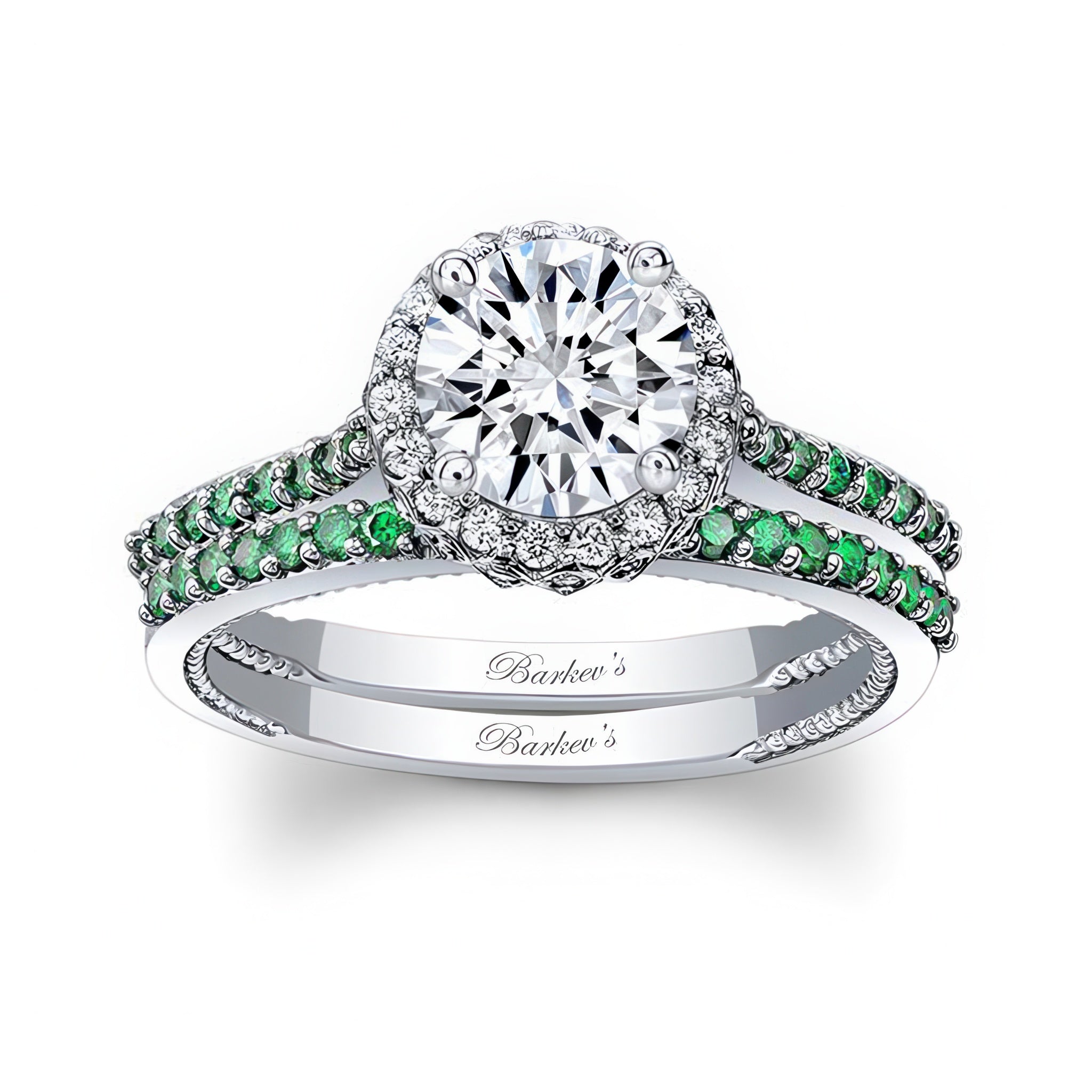An exquisite round halo moissanite emerald accent wedding set with a center surrounded by shared prong melees that continue down the shoulders. The profile view reveals a second hidden halo around the sides and two larger bezel set emeralds sitting just beneath the center. A matching wedding band sits up closely on the side to emphasize the design.
