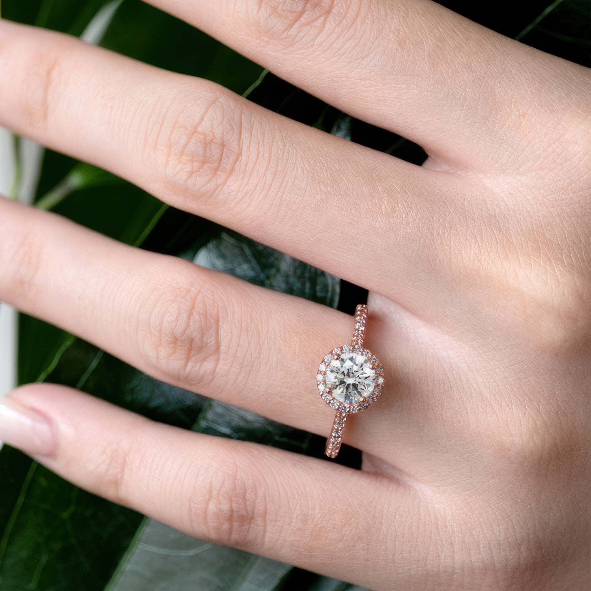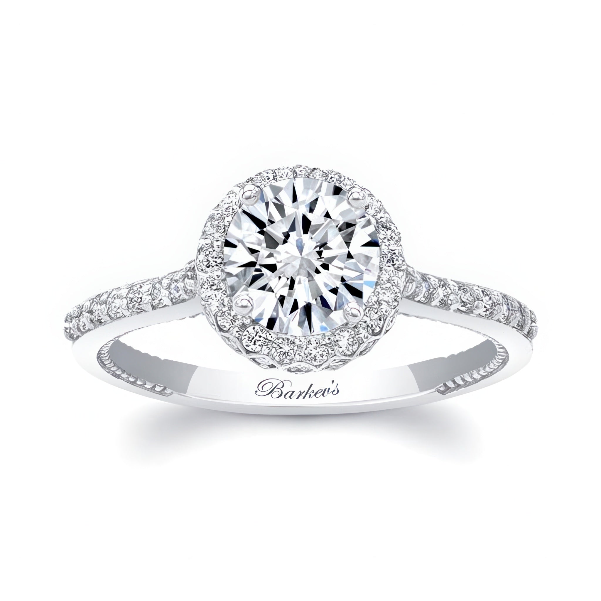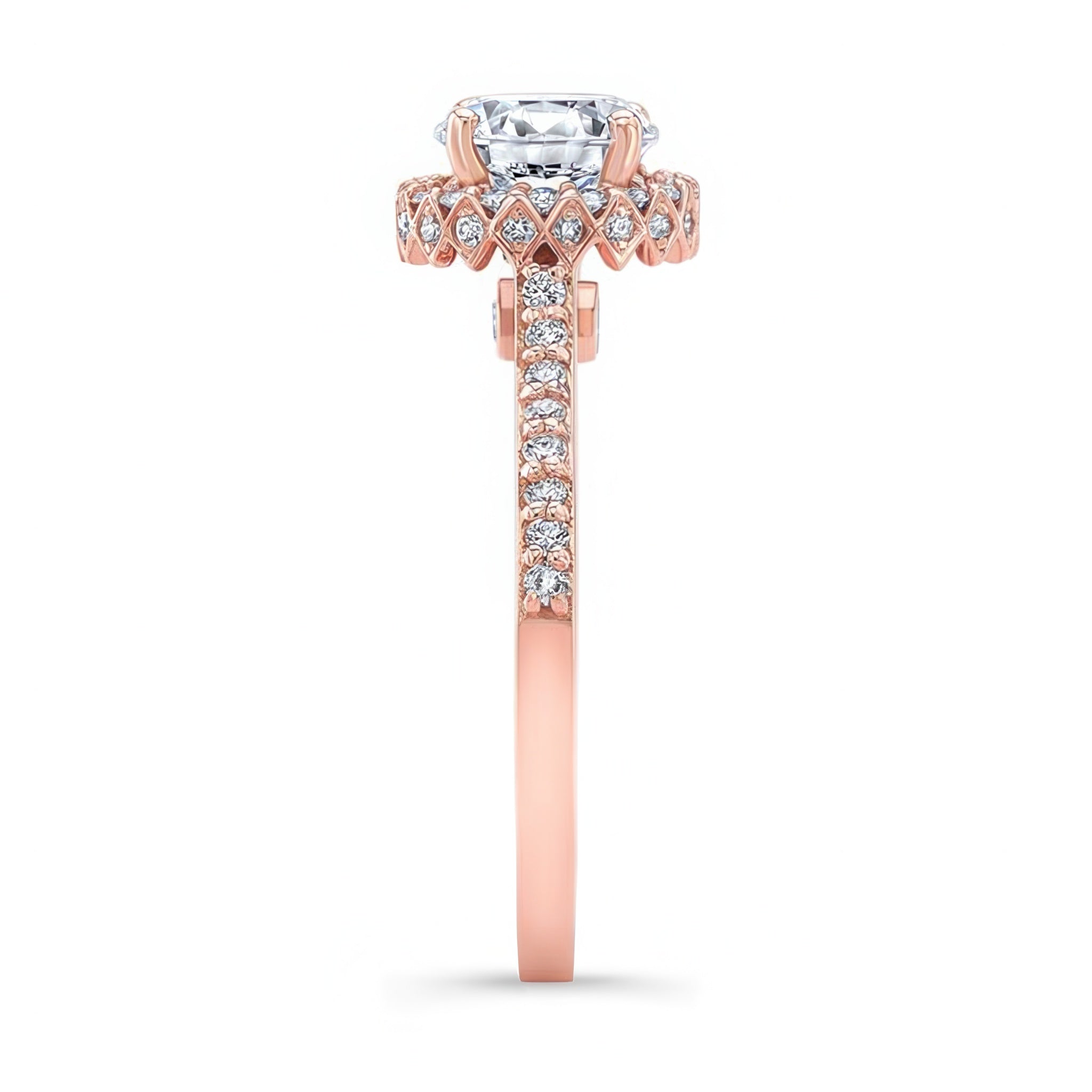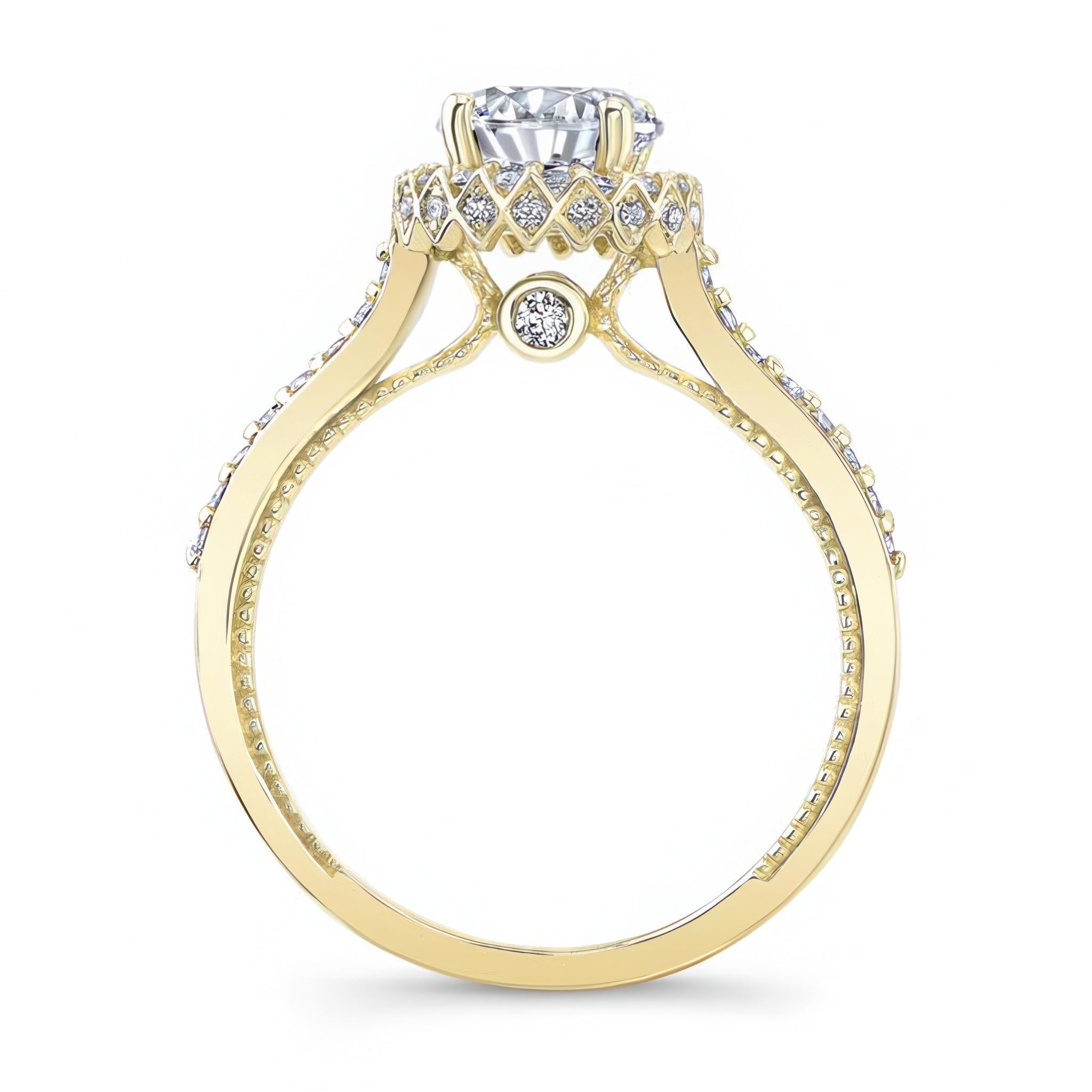 An exquisite round halo moissanite ring with a center surrounded by shared prong diamonds that continue down the shoulders. The profile view reveals a second hidden halo around the sides and two larger bezel set diamonds sitting just beneath the center.