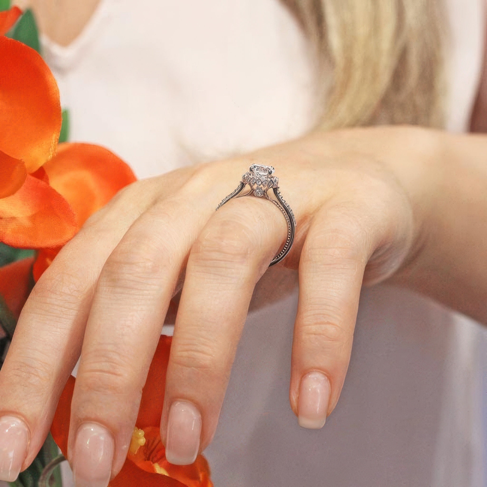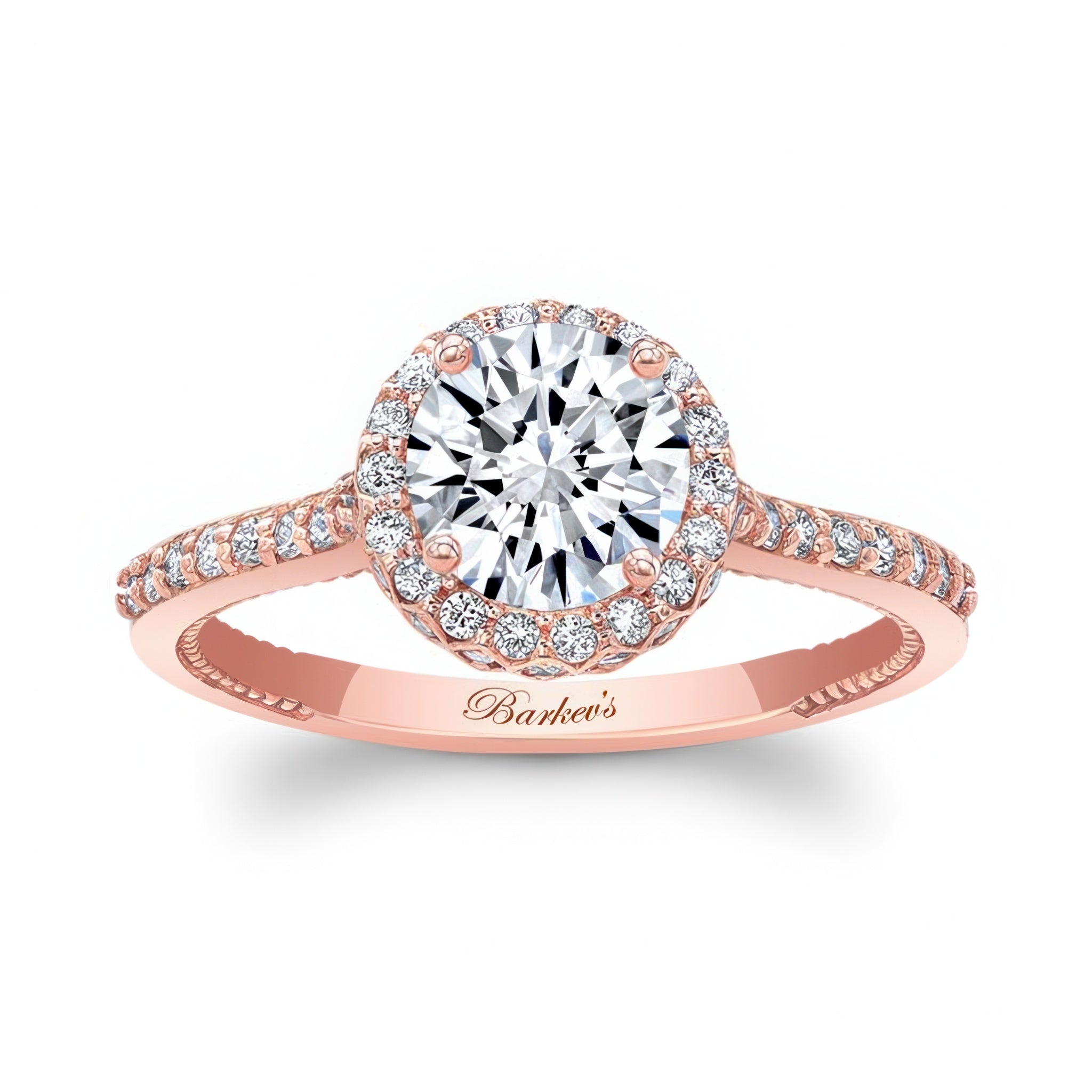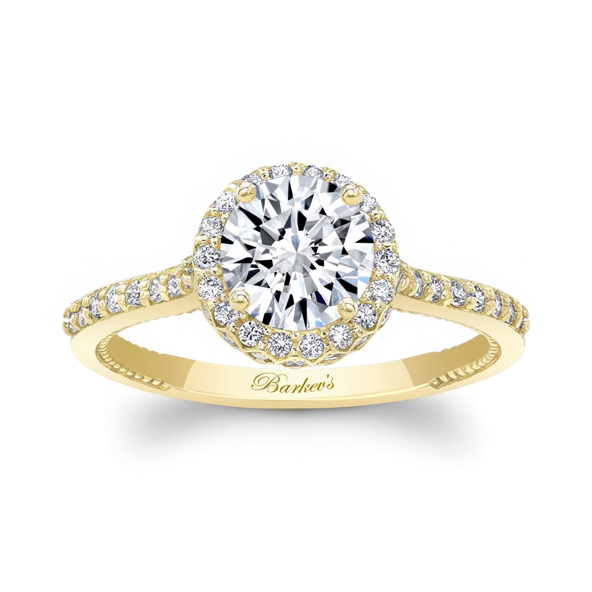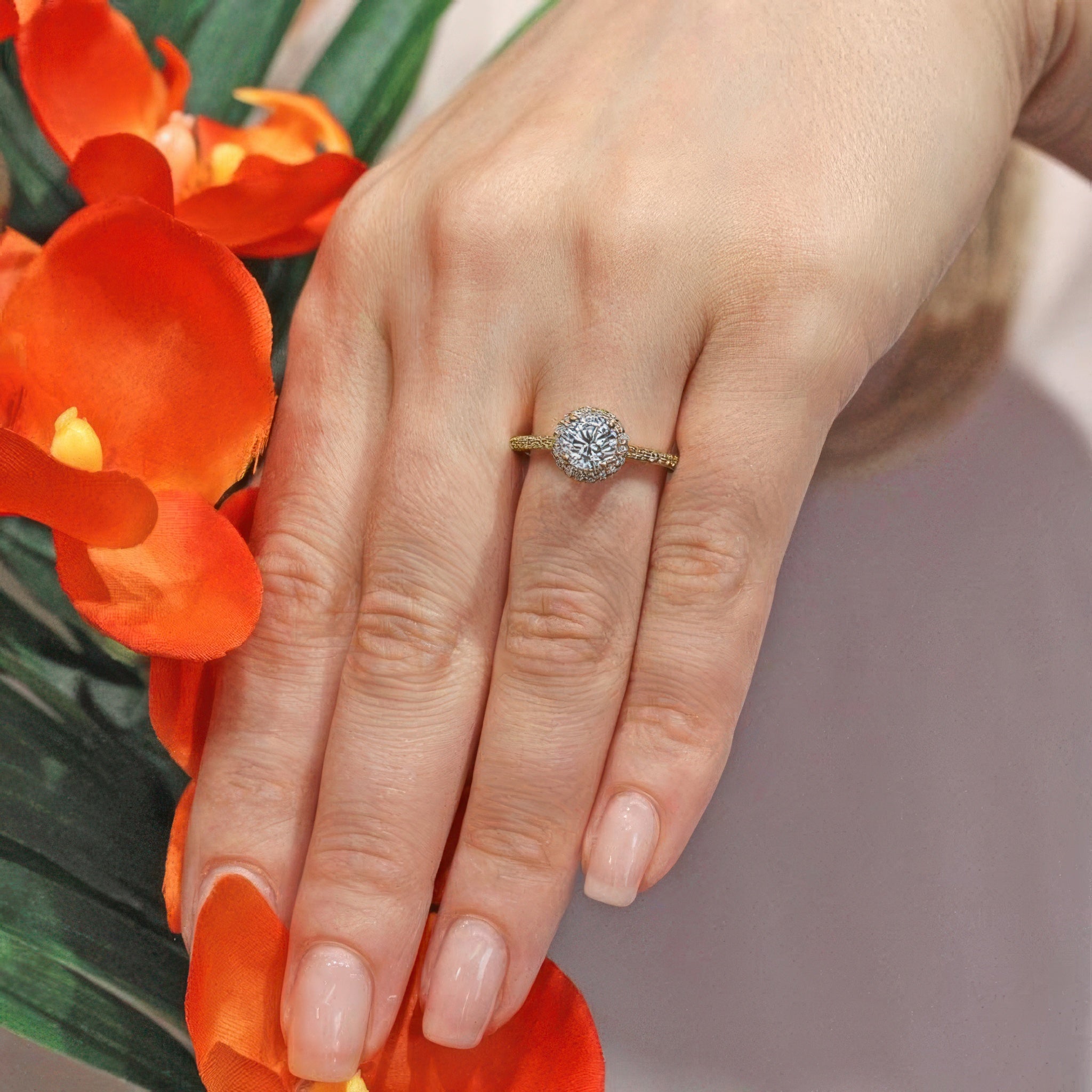 An exquisite round halo moissanite ring with a center surrounded by shared prong diamonds that continue down the shoulders. The profile view reveals a second hidden halo around the sides and two larger bezel set diamonds sitting just beneath the center.