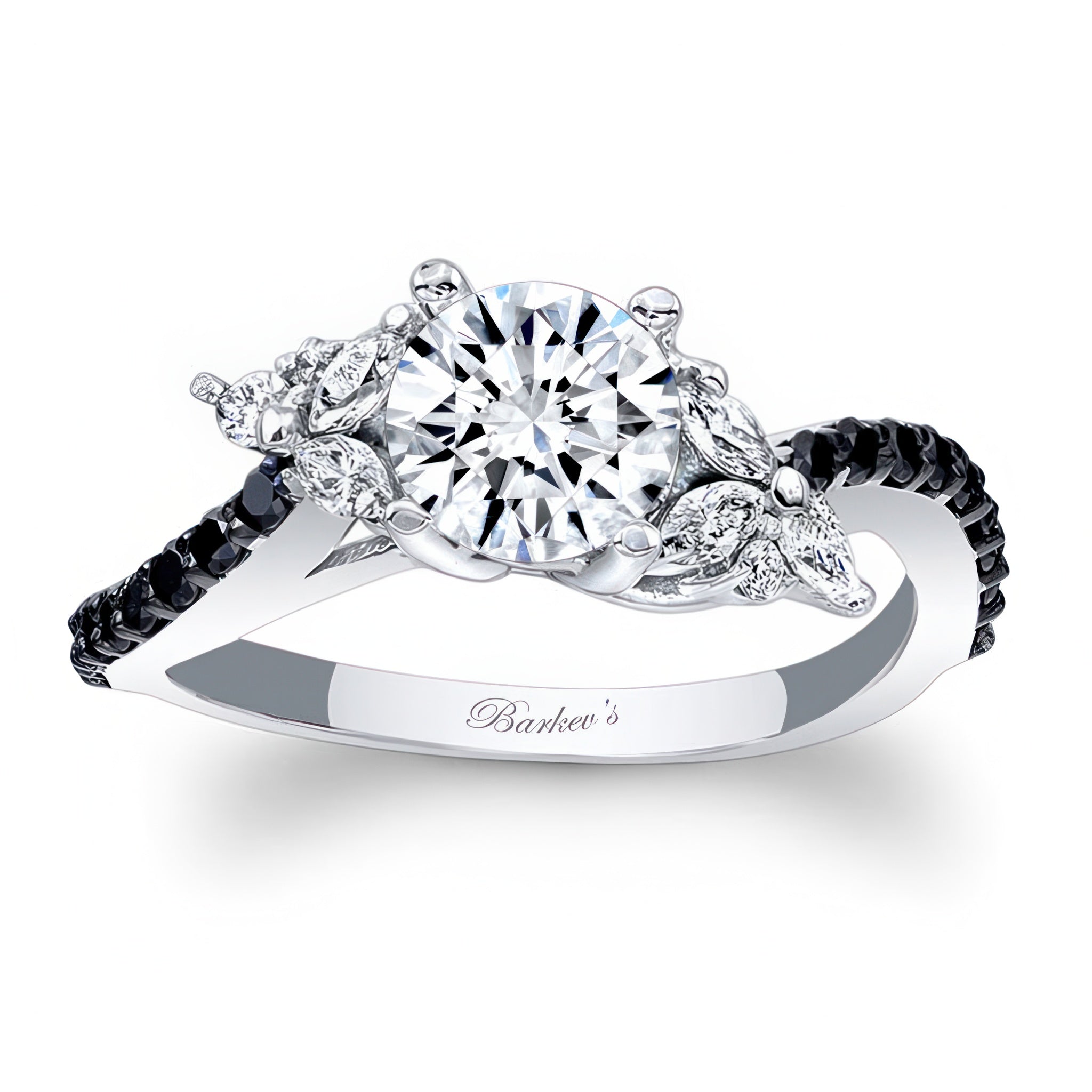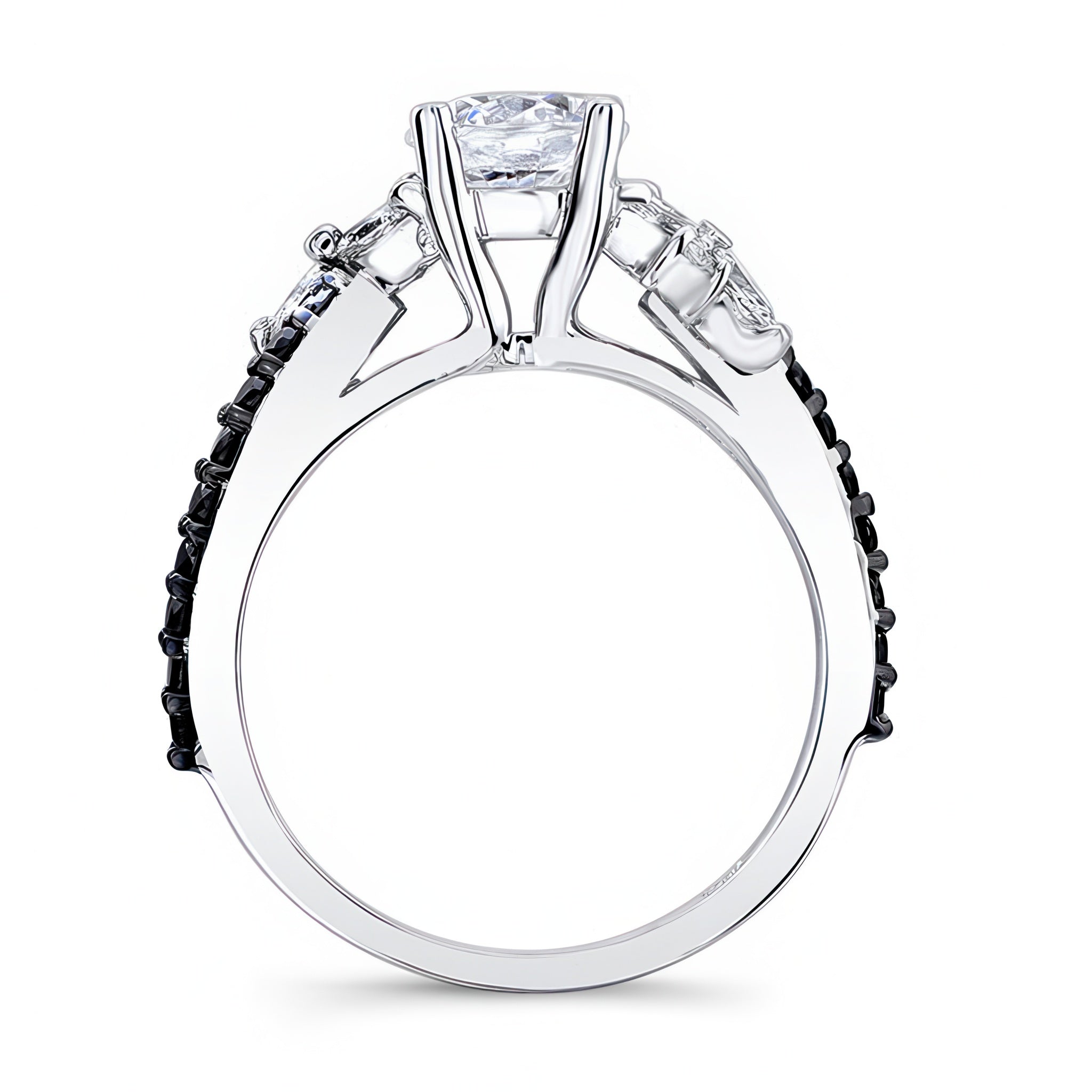 This round moissanite black diamond accent ring features a prong set center flanked on each side by fancy marquise diamonds with black diamonds cascading down the shoulders for an elegant fashion statement.