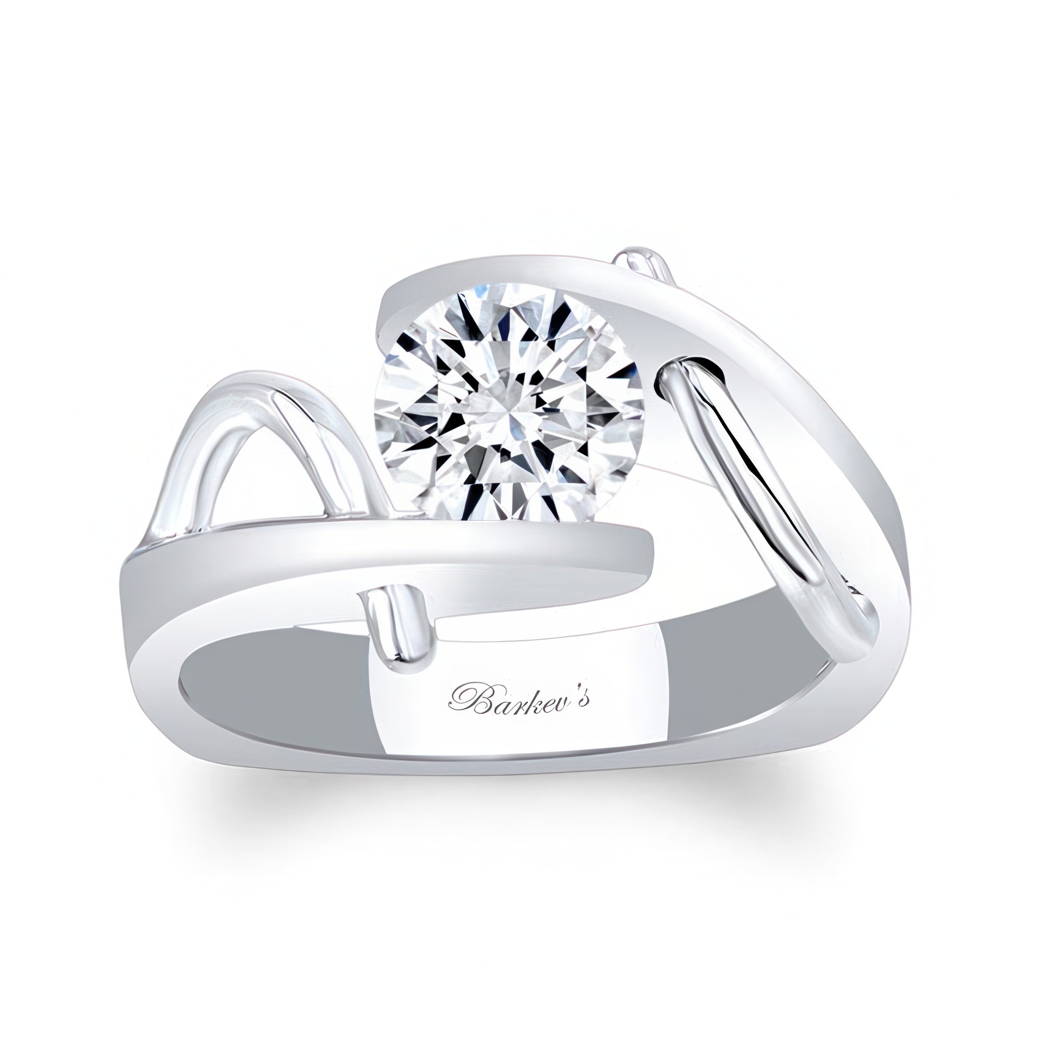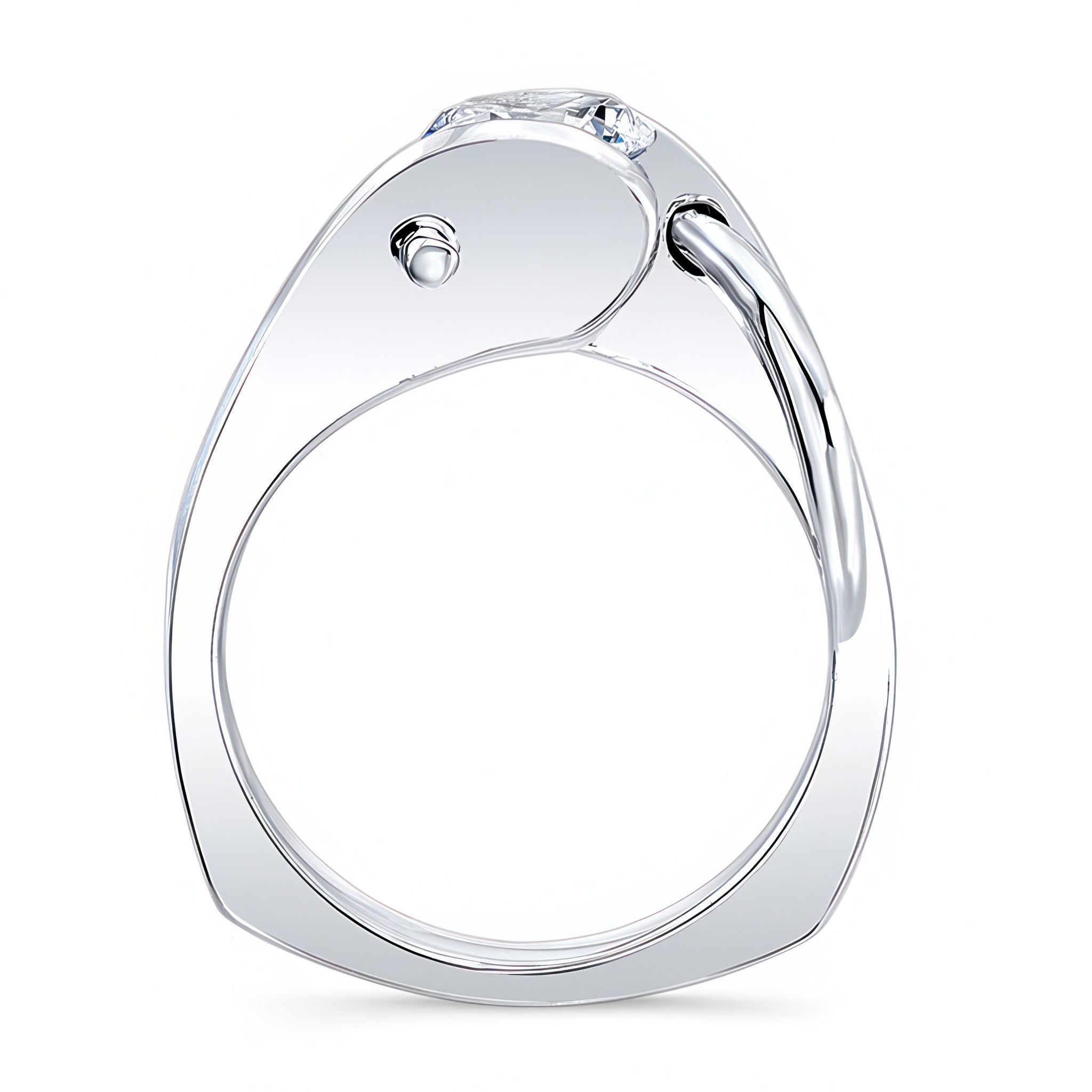 This solitaire channel set moissanite ring features a round center with bright polished shoulders adorned with two wire trims curving though the shank on both sides for a dramatic artistic flare.