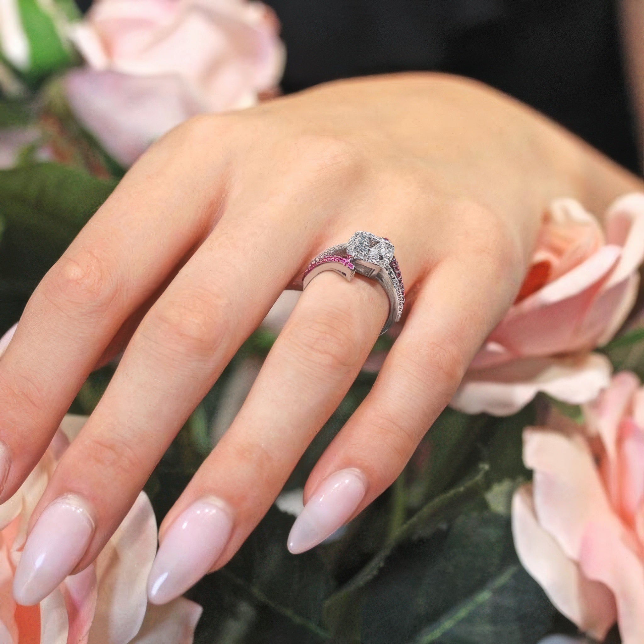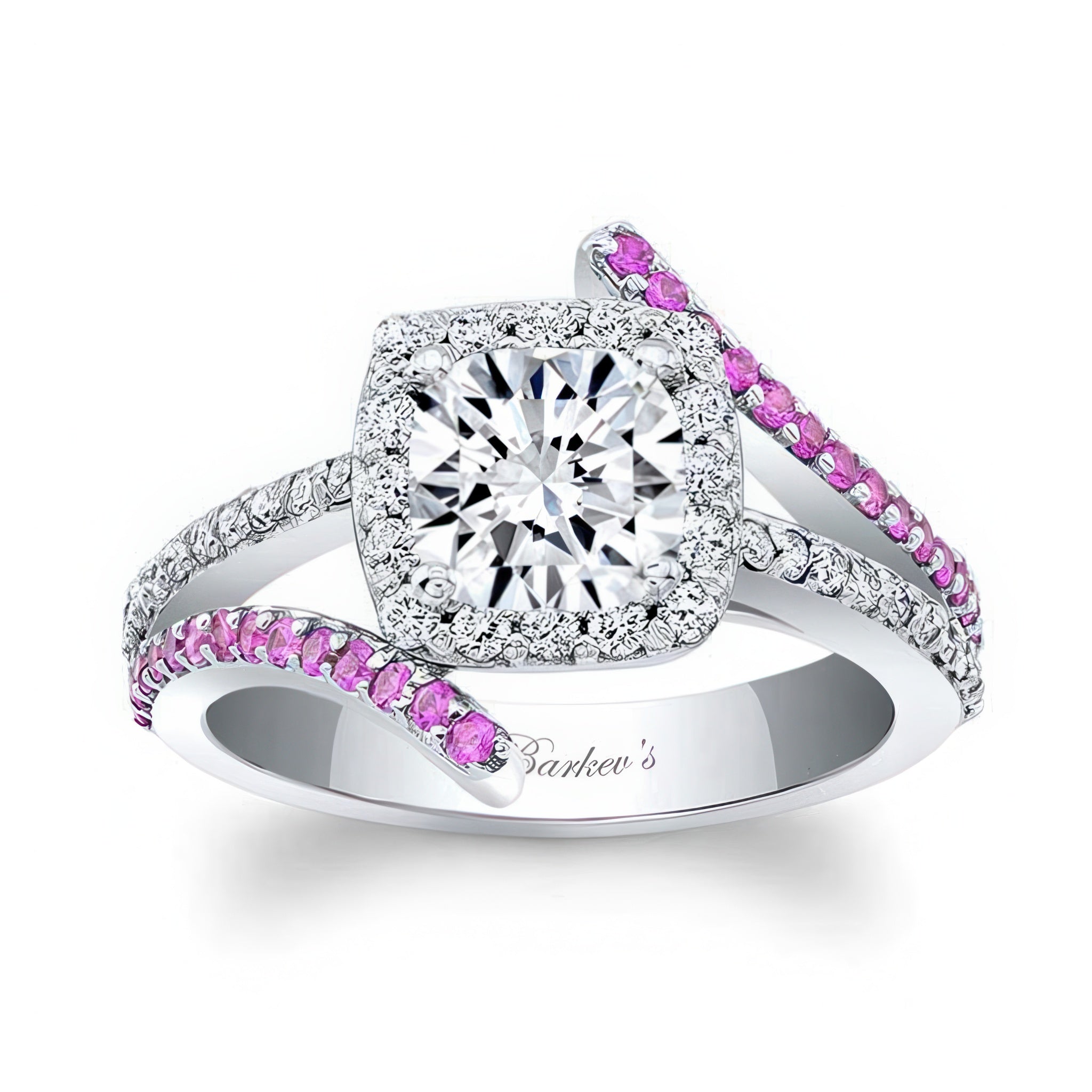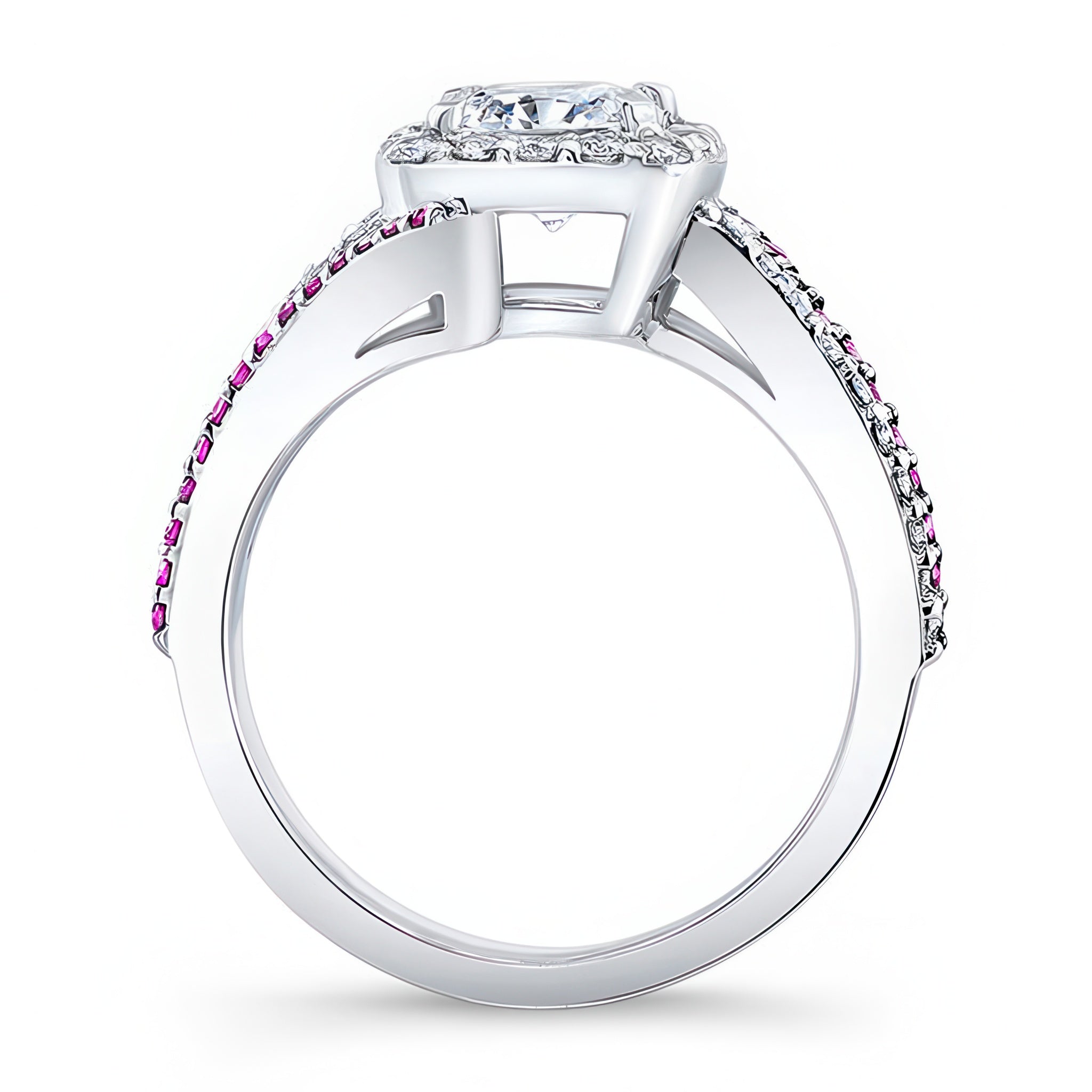 Split Shank Cushion Cut Moissanite Halo Ring With Pink Sapphires
