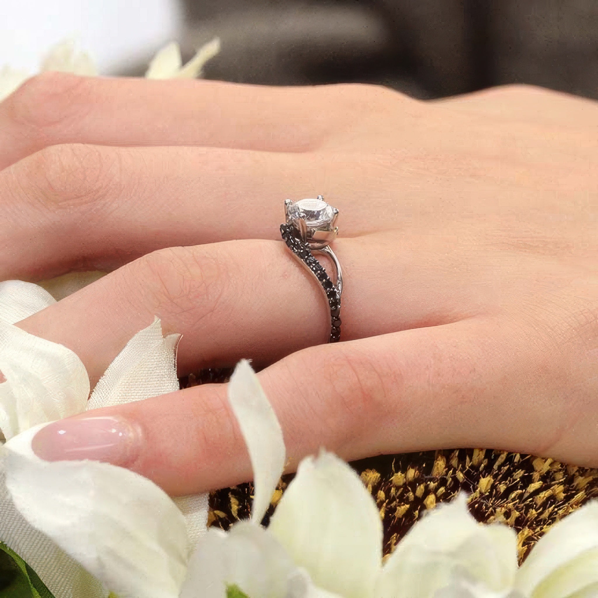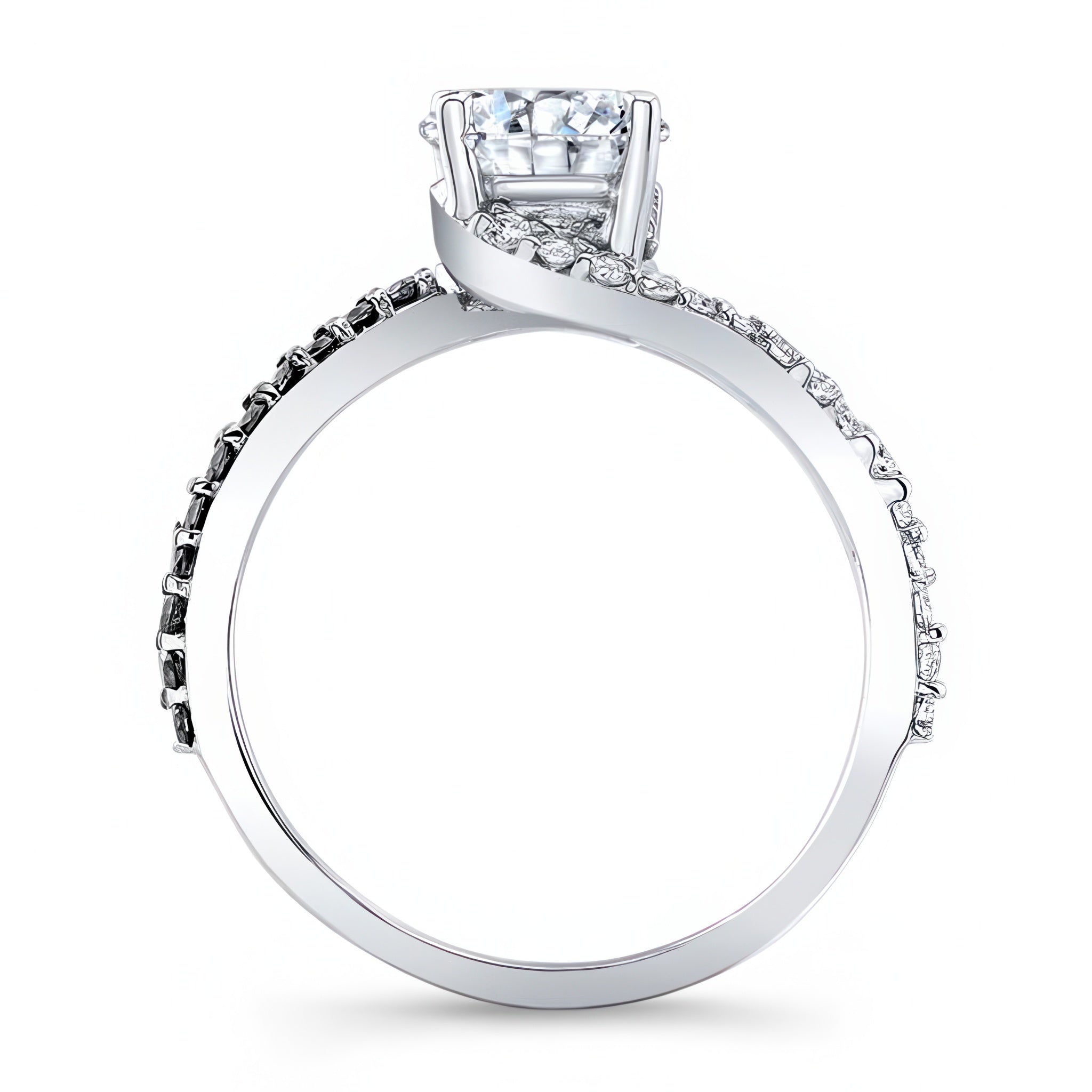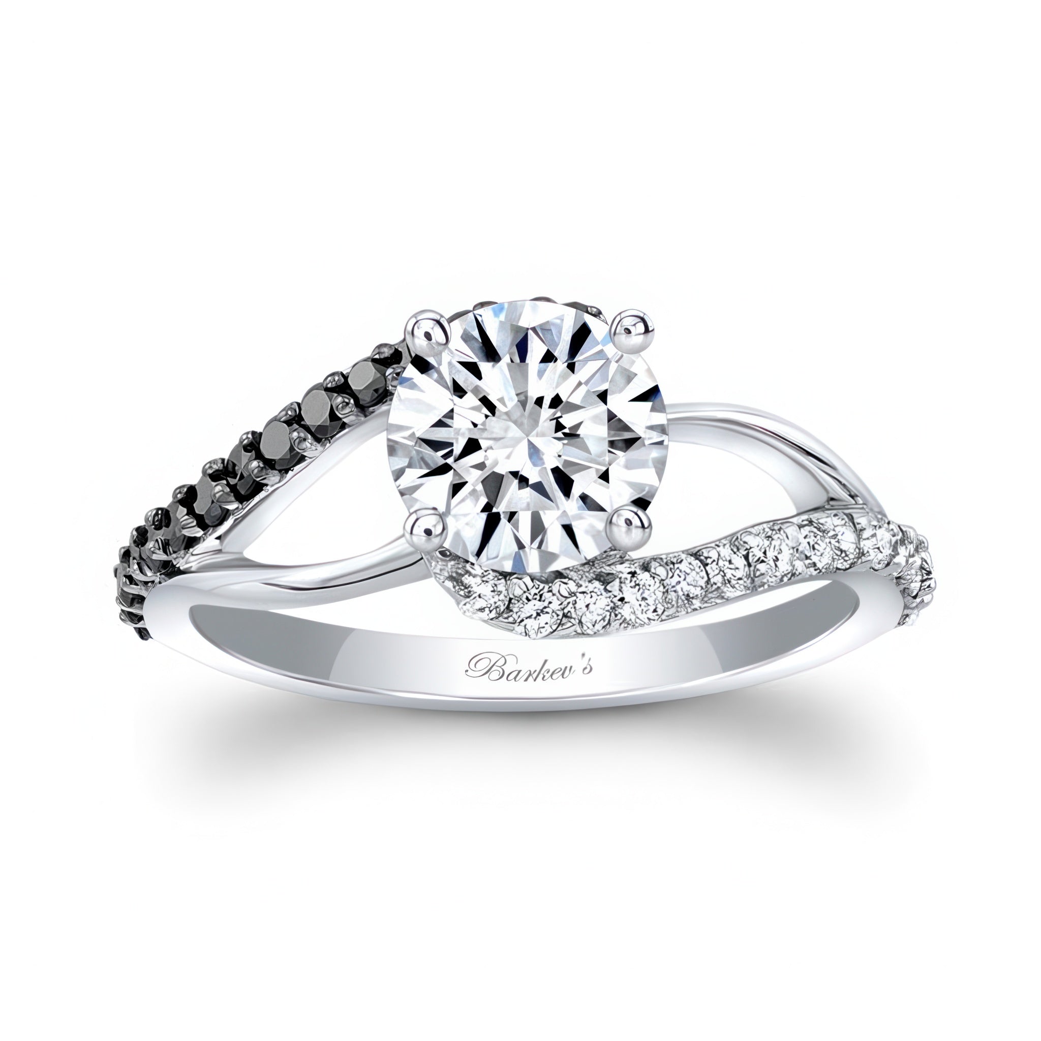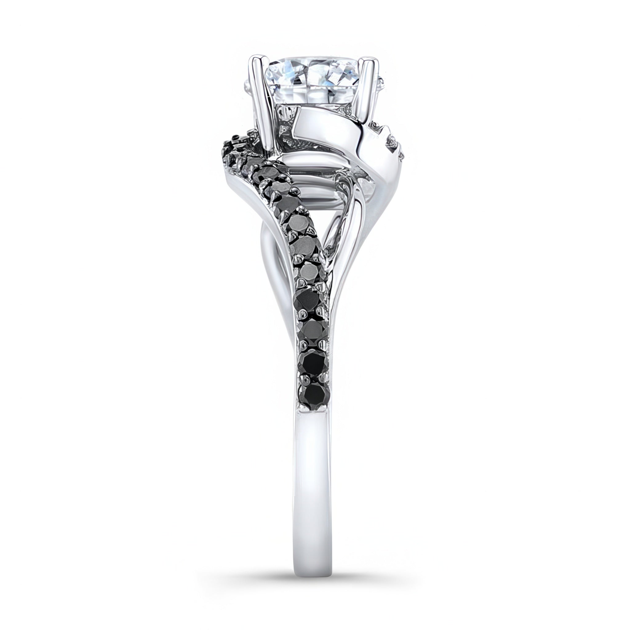 This split shank moissanite ring with black diamonds features a round center, while it's split shoulders are adorned with black and white diamonds for a flawless final look.