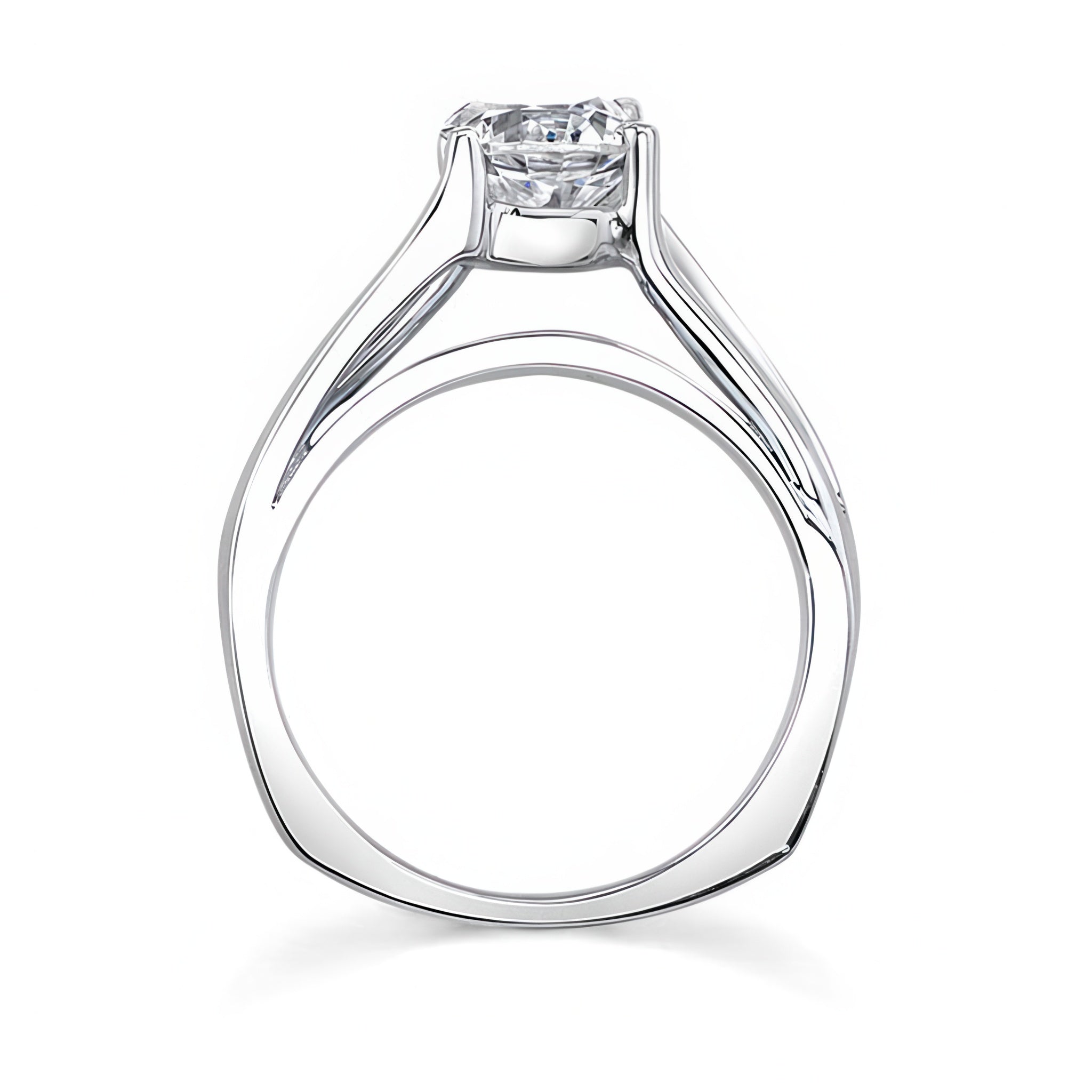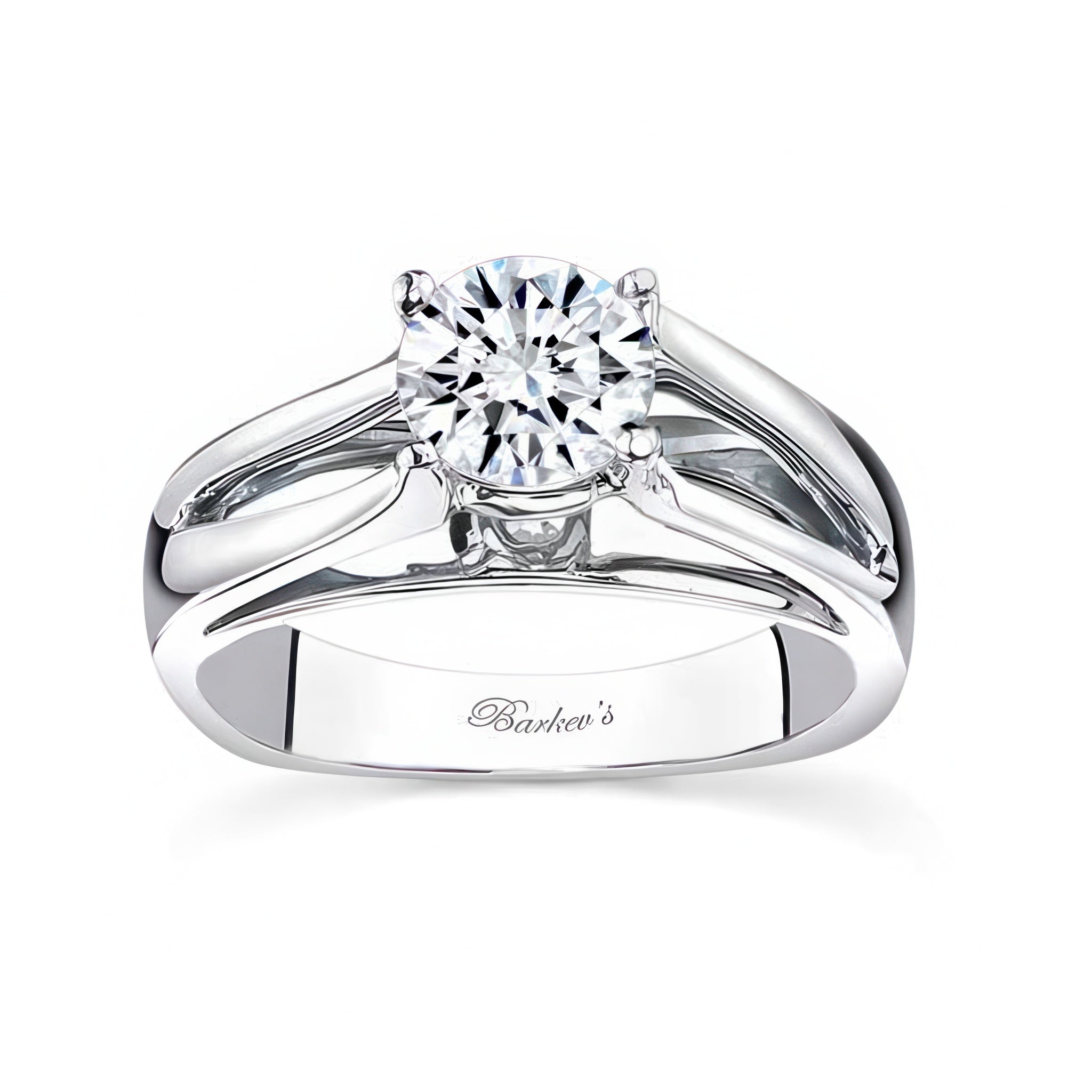 This split shank moissanite solitaire ring with bridge features a prong set round center with a split shank and a contemporary bridge underneath it.
