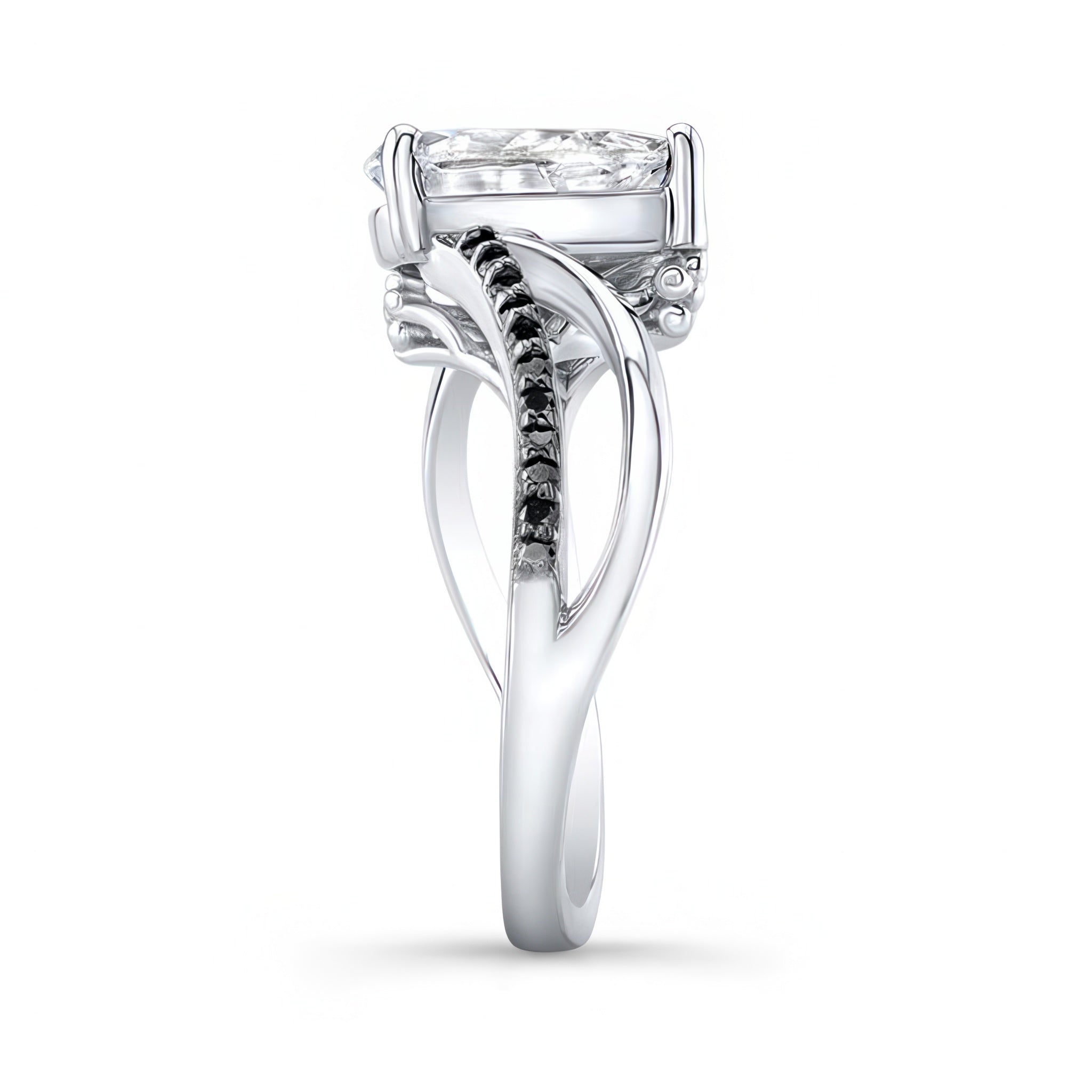 This split shank pear black diamond accent moissanite ring features a center glorified by two graceful swirls, one of which is decorated by a row of prong set side stones adding the final touch to its overall glamorous effect.