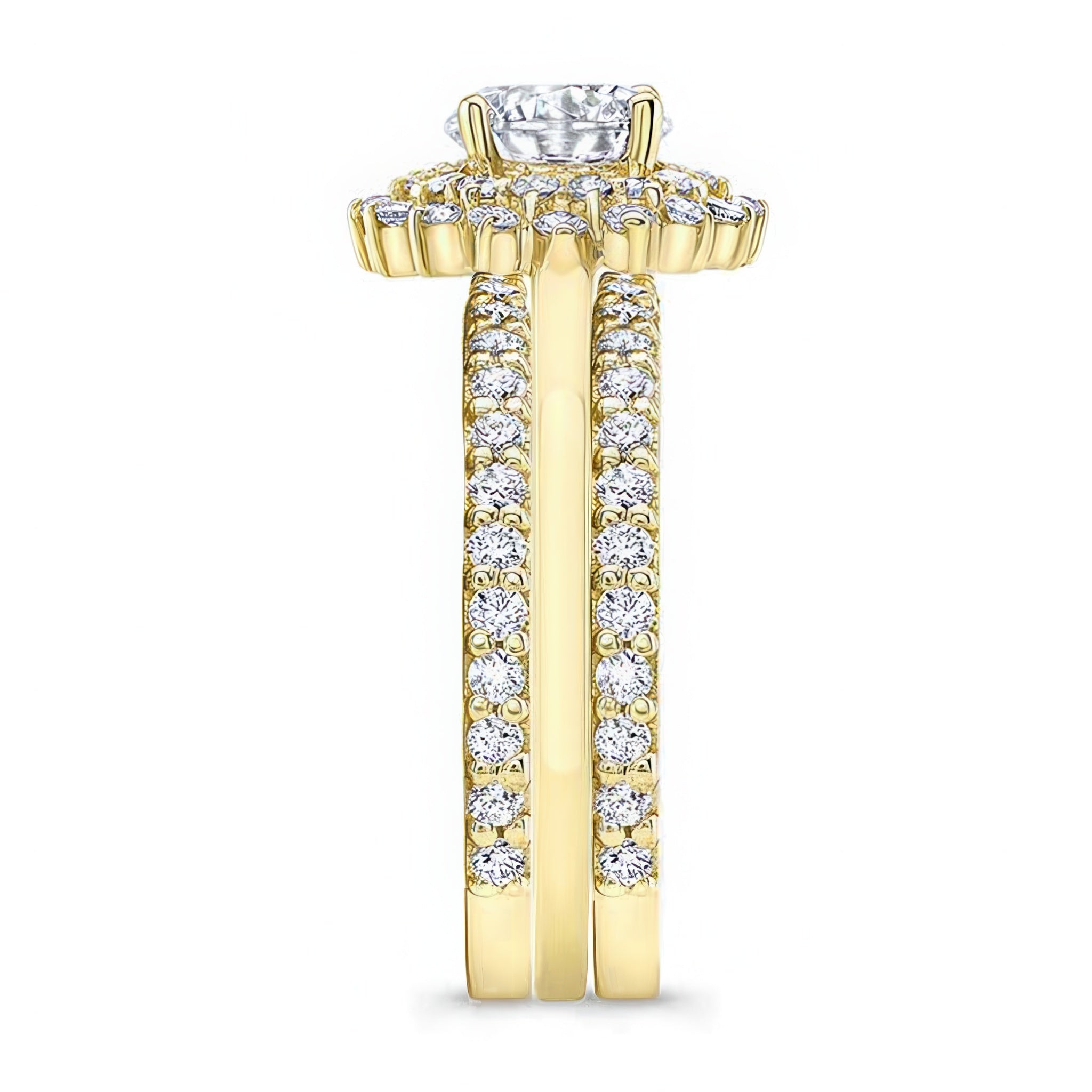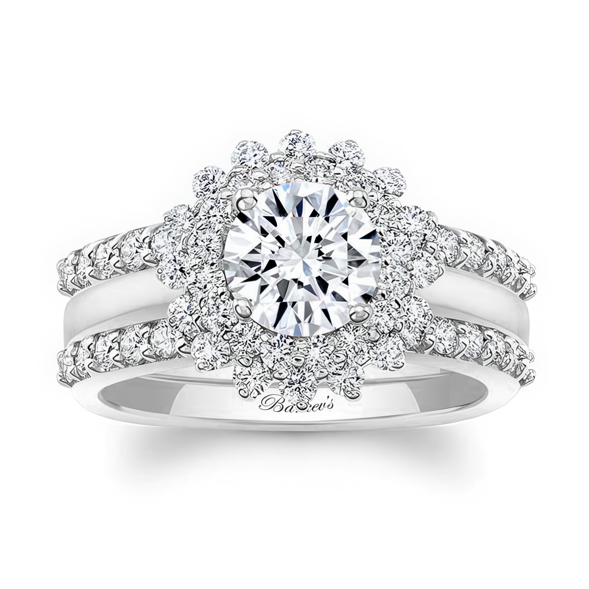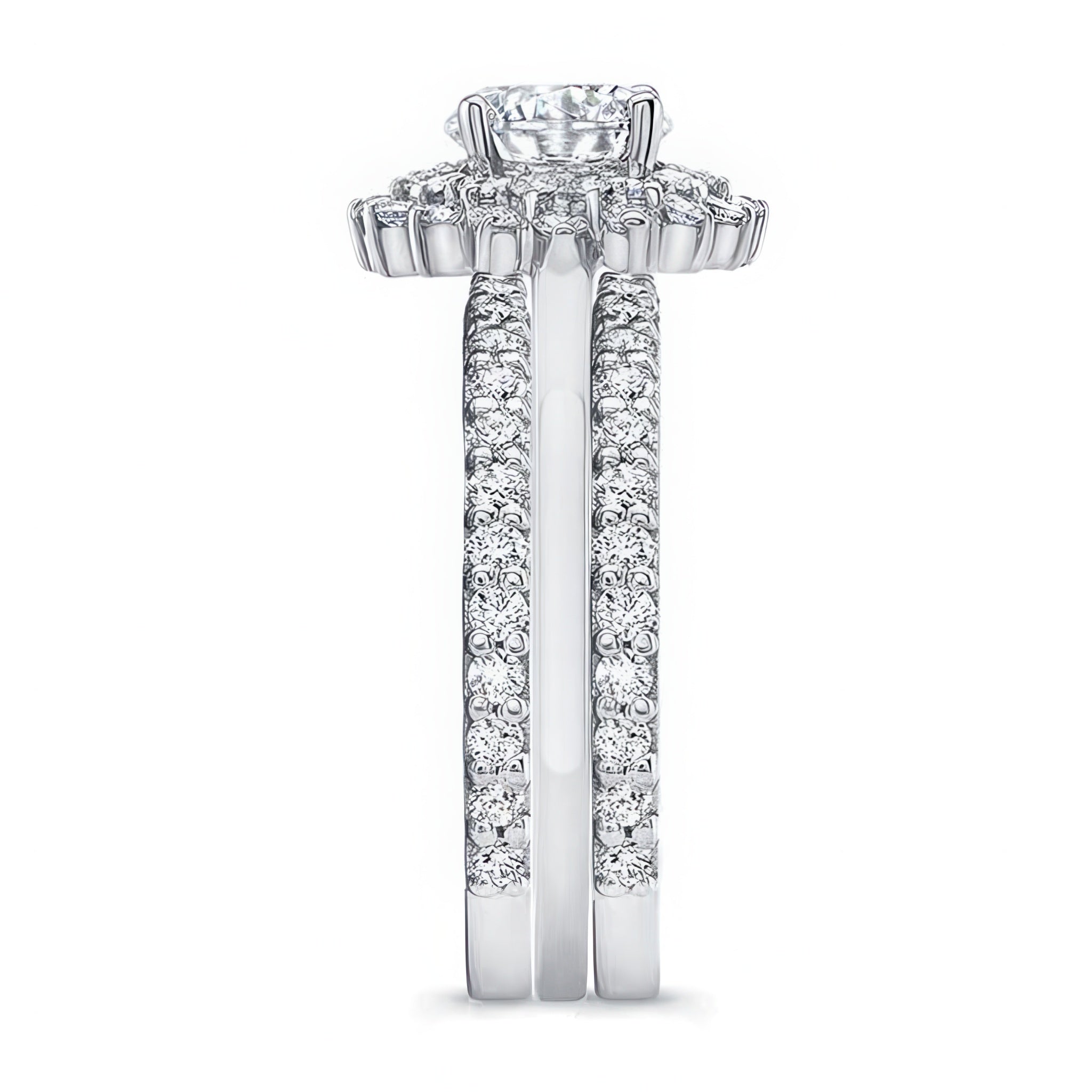 An exquisite starburst moissanite bridal set with two bands featuring an engagement ring with a prong set round center encircled with two diamond halos with the outer one giving the illusion of a burst pattern. The final touch is visible on the profile view with a dainty polished shank featuring a simple motif design. Two shared prong set wedding bands snuggle up close on each side for a stunning look.