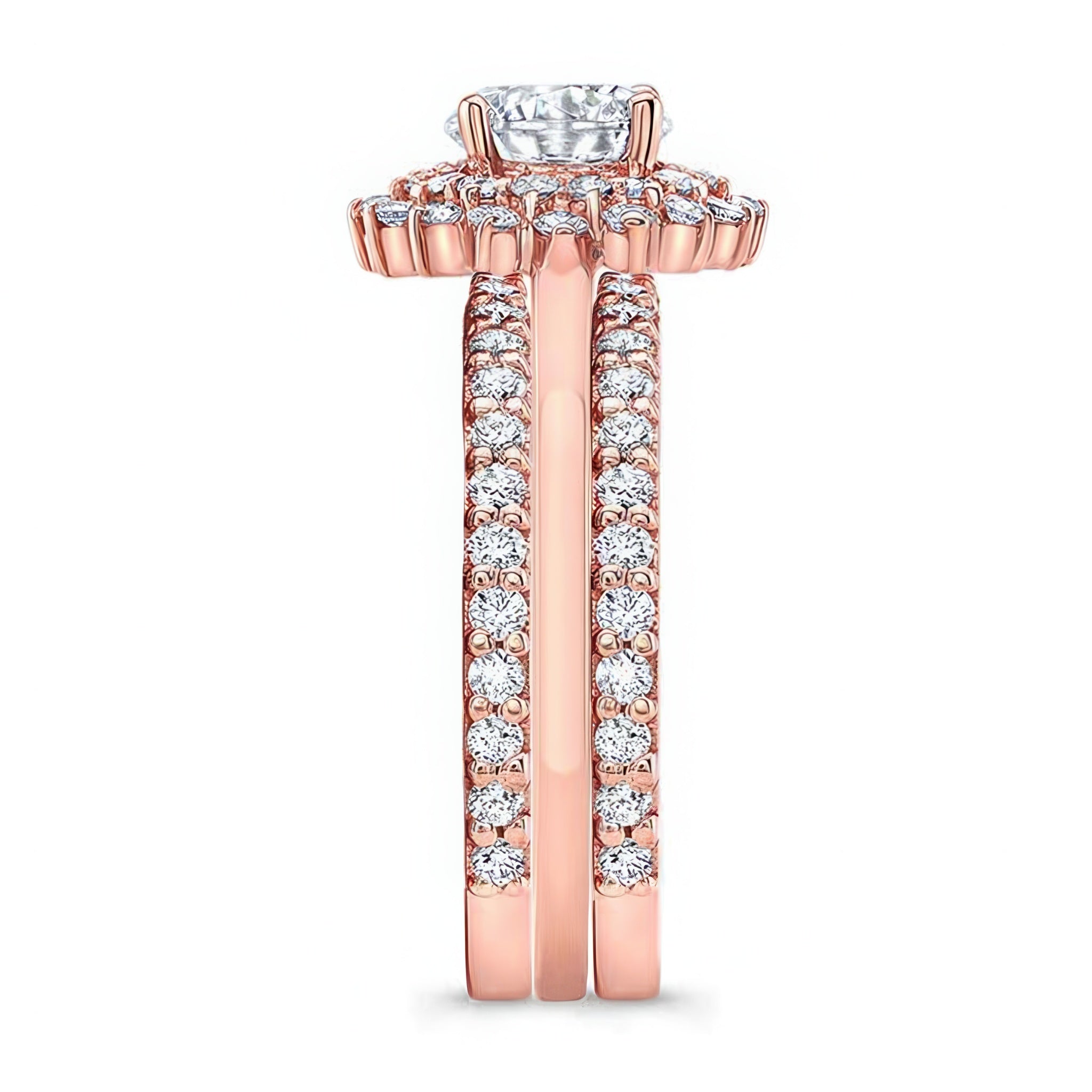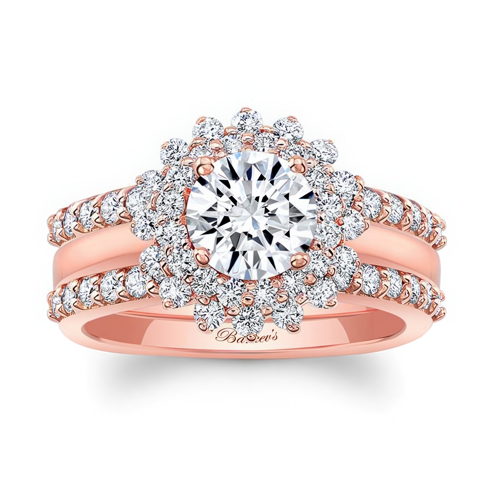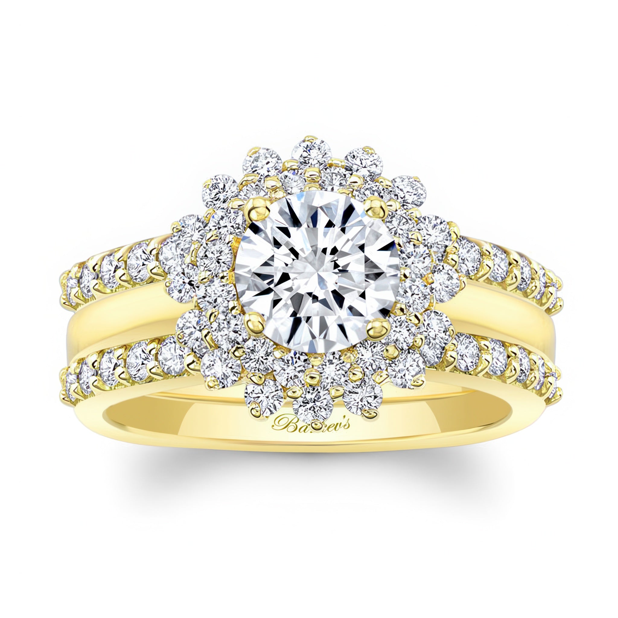 An exquisite starburst moissanite bridal set with two bands featuring an engagement ring with a prong set round center encircled with two diamond halos with the outer one giving the illusion of a burst pattern. The final touch is visible on the profile view with a dainty polished shank featuring a simple motif design. Two shared prong set wedding bands snuggle up close on each side for a stunning look.