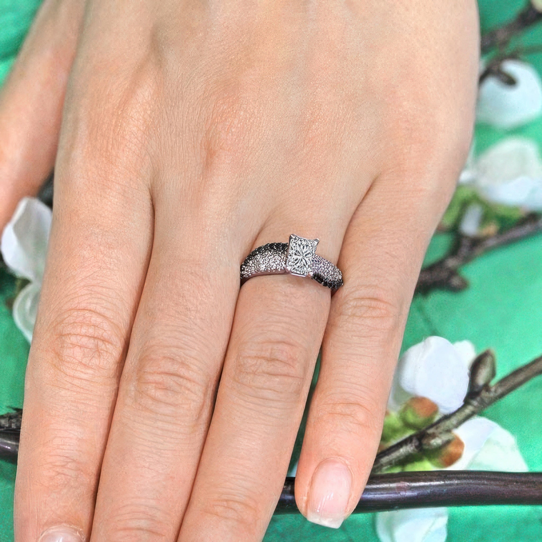 Swirl Black Diamond Accent Radiant Moissanite Ring