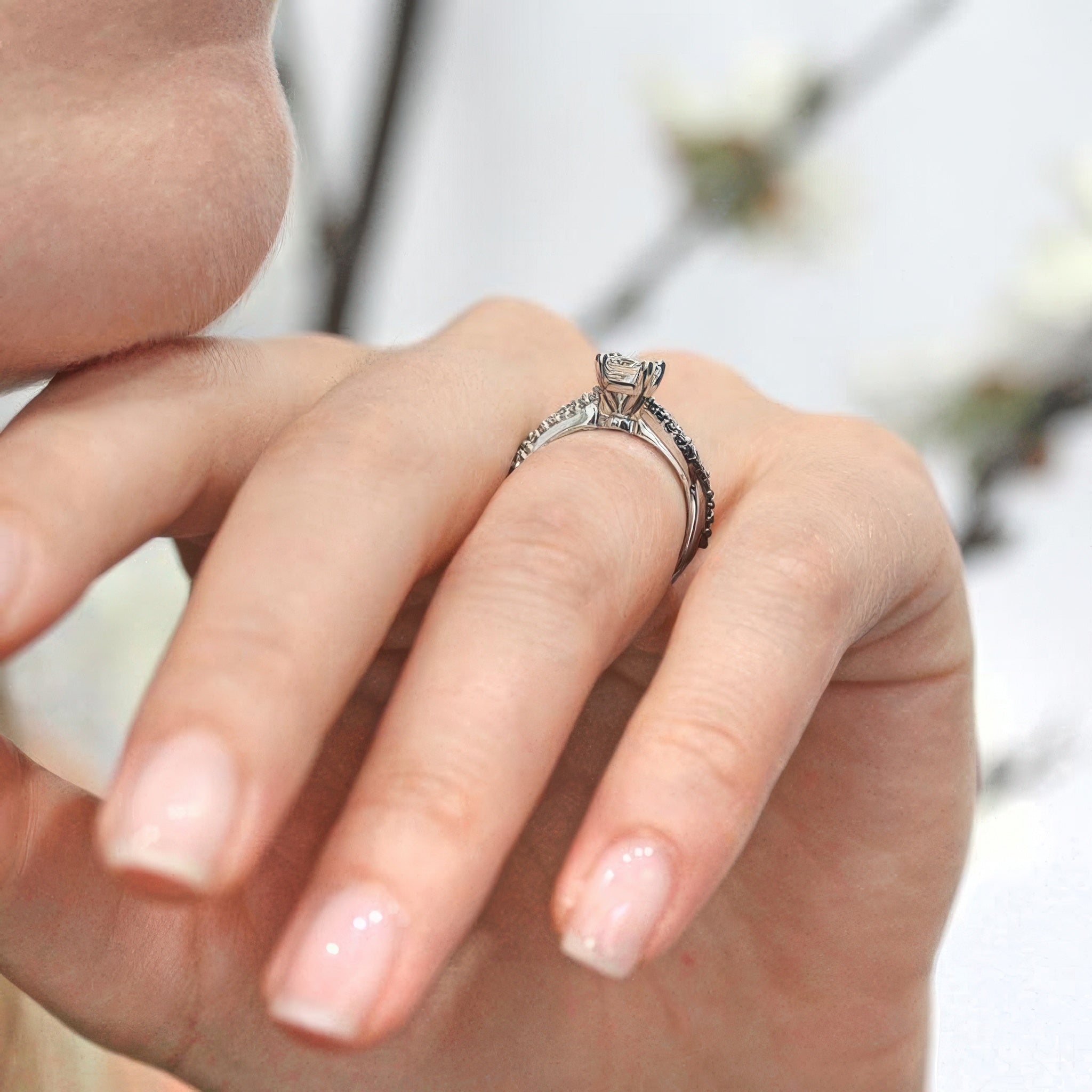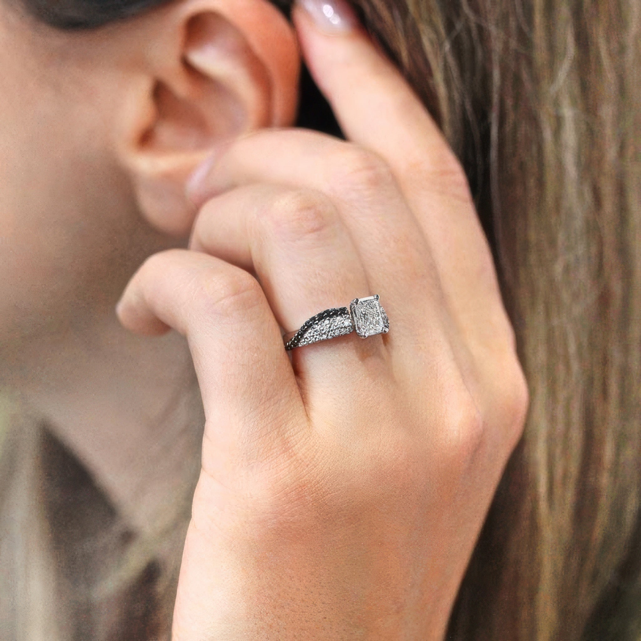 This swirl black diamond accent radiant moissanite ring features a prong set radiant cut center with pave set diamonds on the shank and a swirling ridge of shared prong set black diamonds for a dramatic elegant statement of finesse.