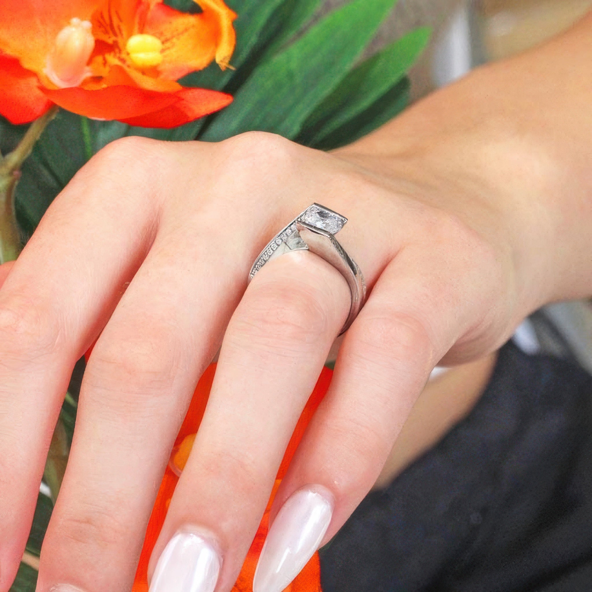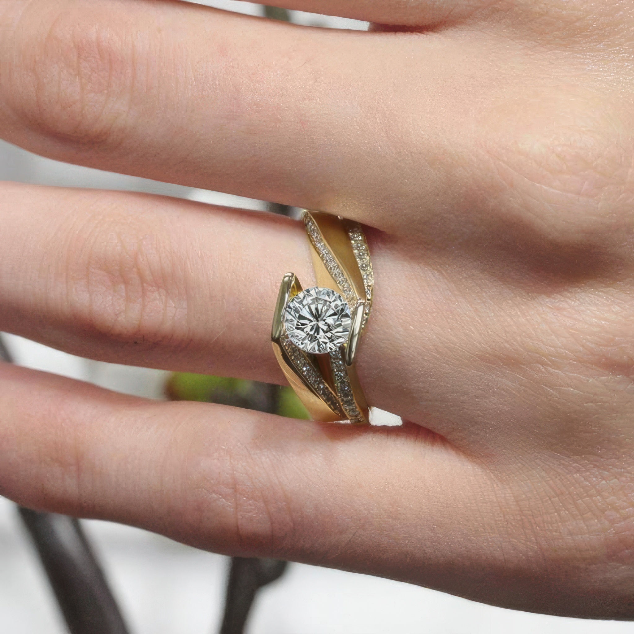 This stunning tension setting moissanite bridal set is decorated by channel set diamonds on both sides of the shank, the ring gracefully twists whilst embracing the elevated moissanite in a tension setting. Comes with a matching diamond wedding band.