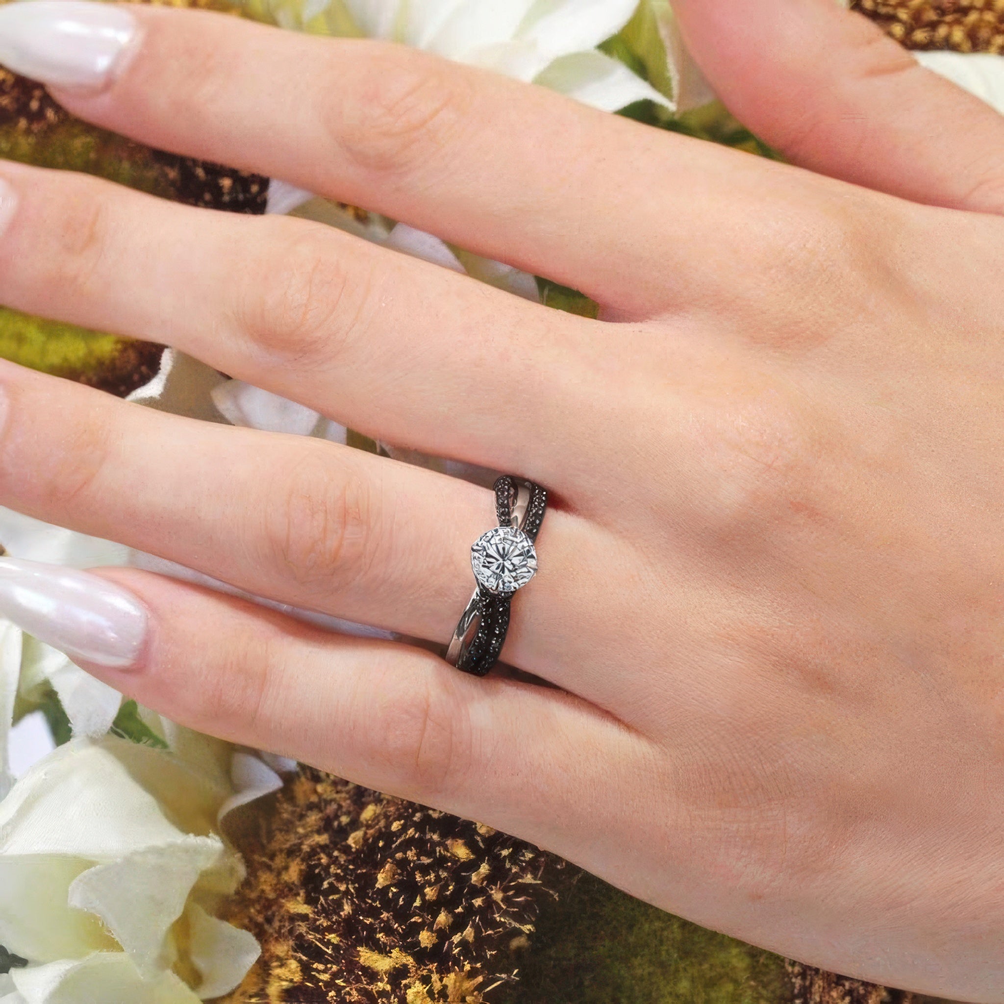 A moissanite center delivers unmatched sparkle and fire, while black diamond accents swirl around the twisted band, offering a bold and modern edge.