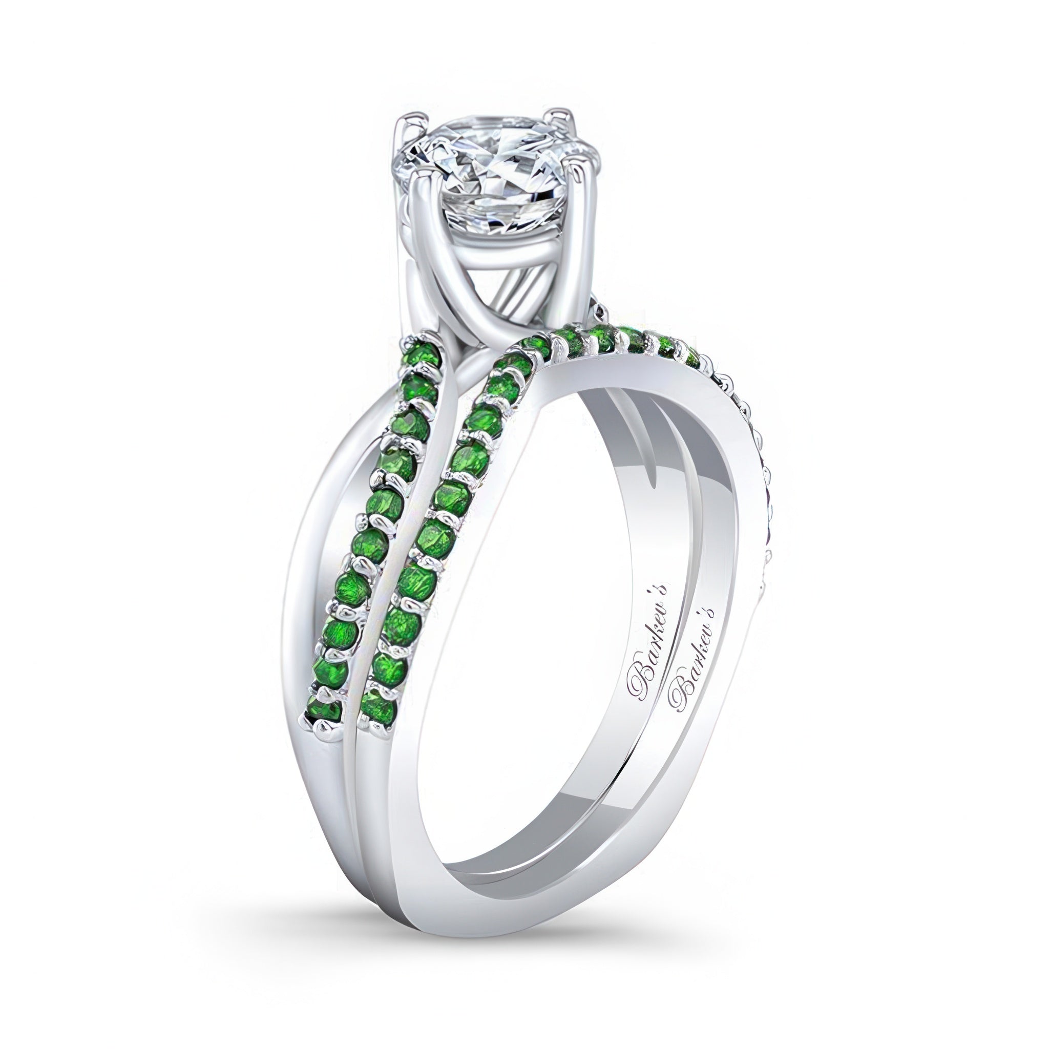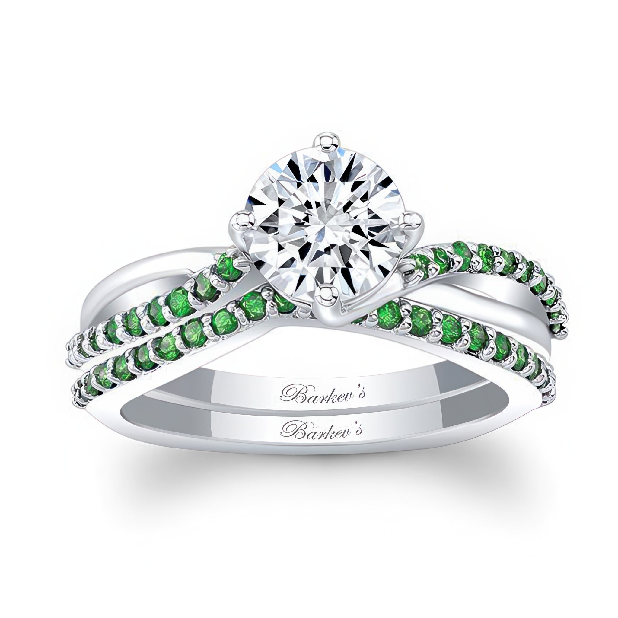 Moissanite’s extraordinary brilliance perfectly complements the deep green hues, creating a sophisticated and eye-catching bridal set.