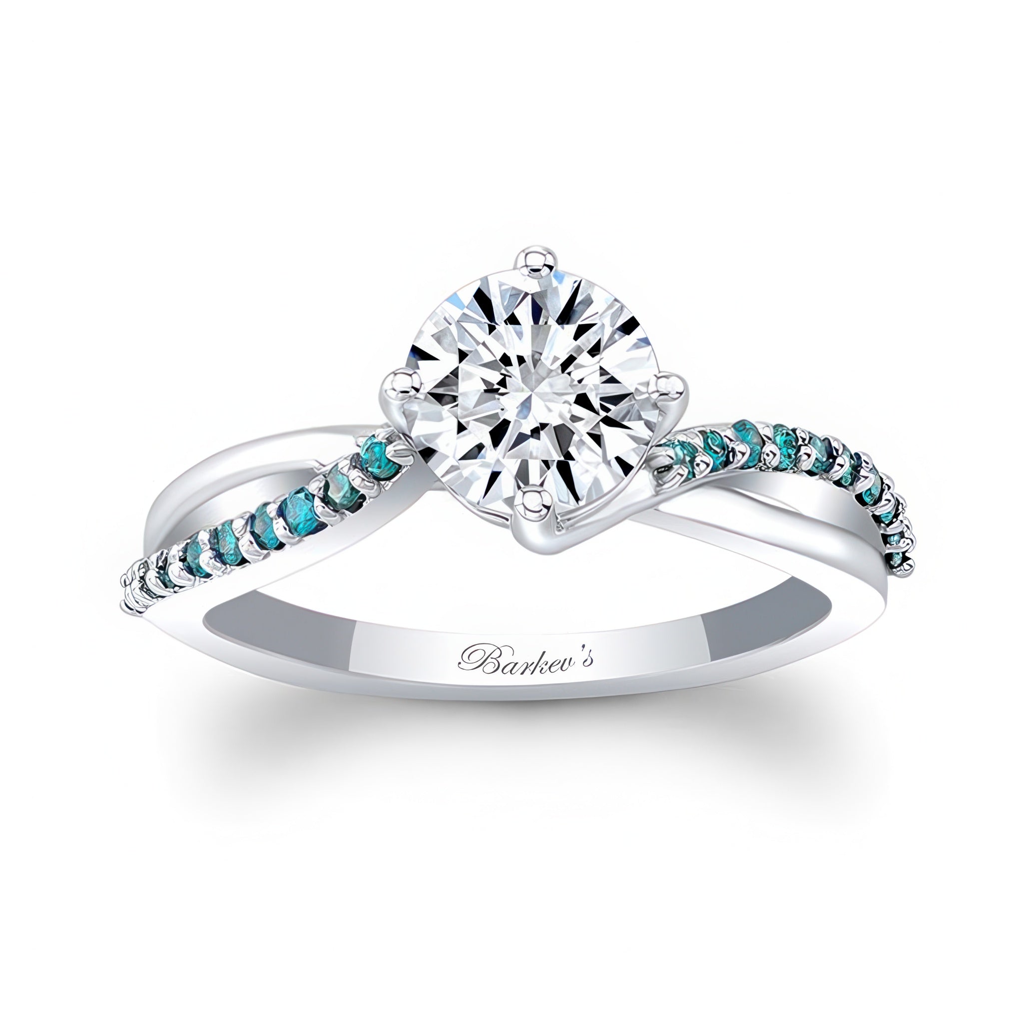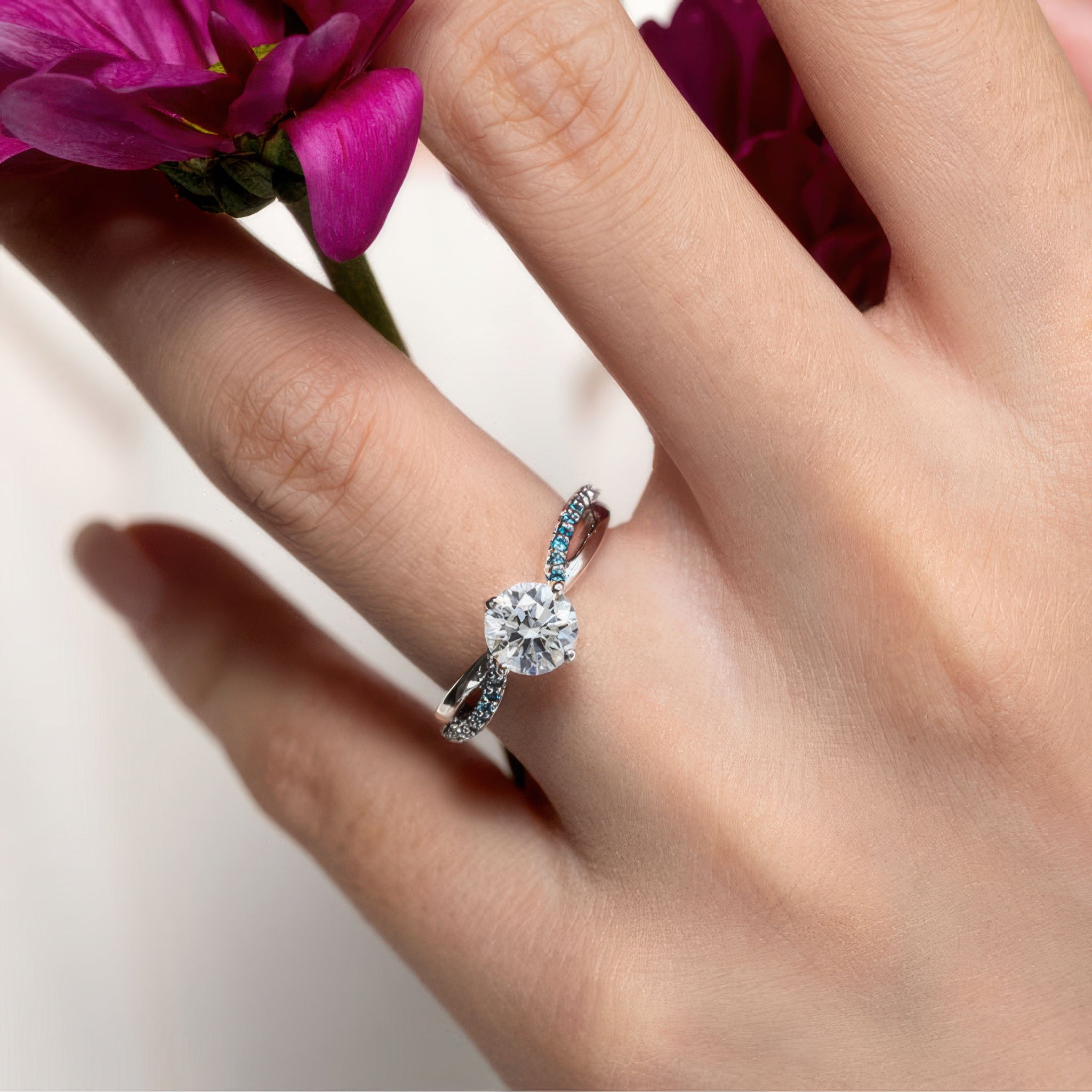 Brilliantly unique, endlessly dazzling. The Twisted Moissanite Engagement Ring With Blue Diamonds combines the fiery brilliance of moissanite with a splash of cool-toned edge. A round moissanite center stone dazzles with rainbow flashes that rival any diamond, while rich blue diamond accents twist around the band for a touch of unexpected contrast.