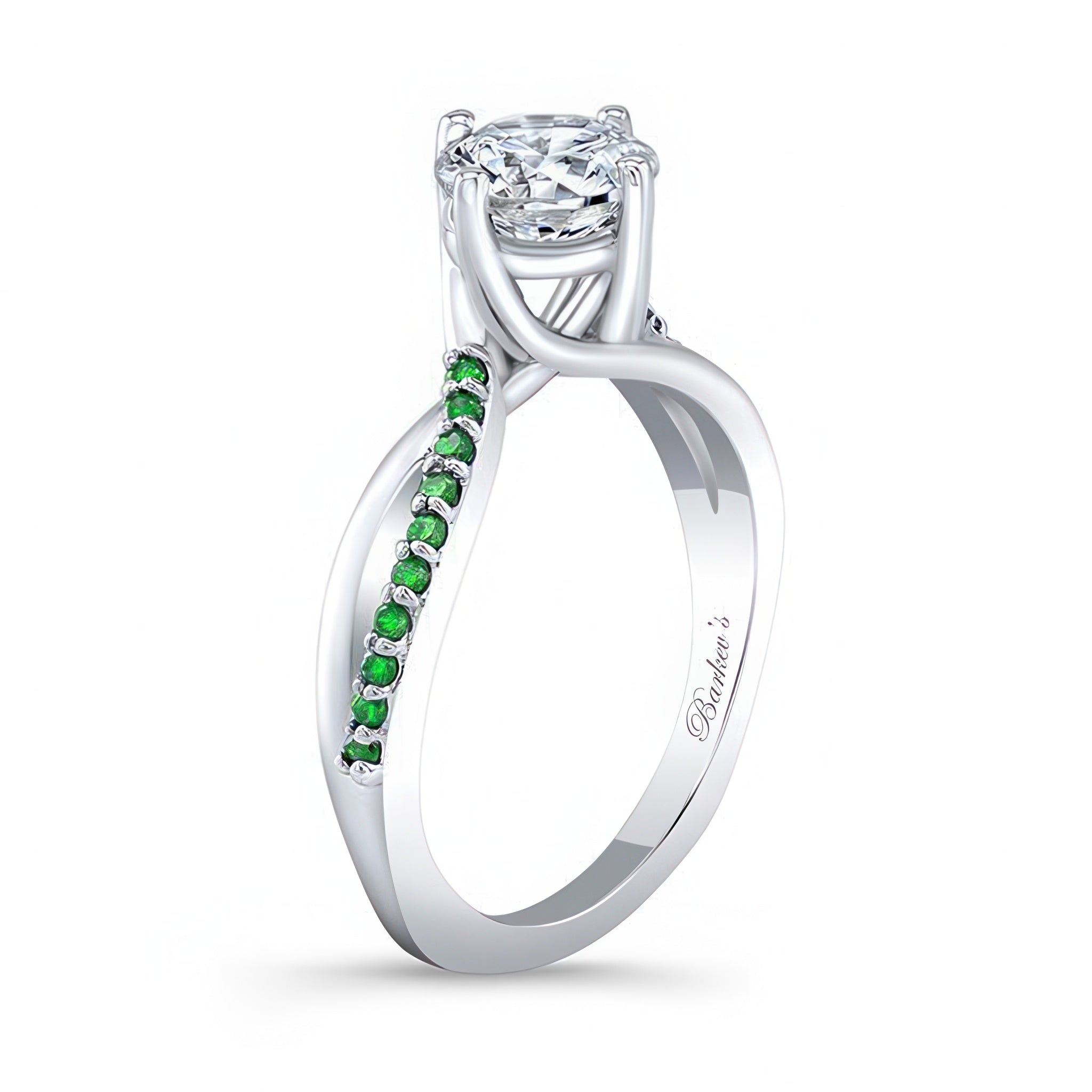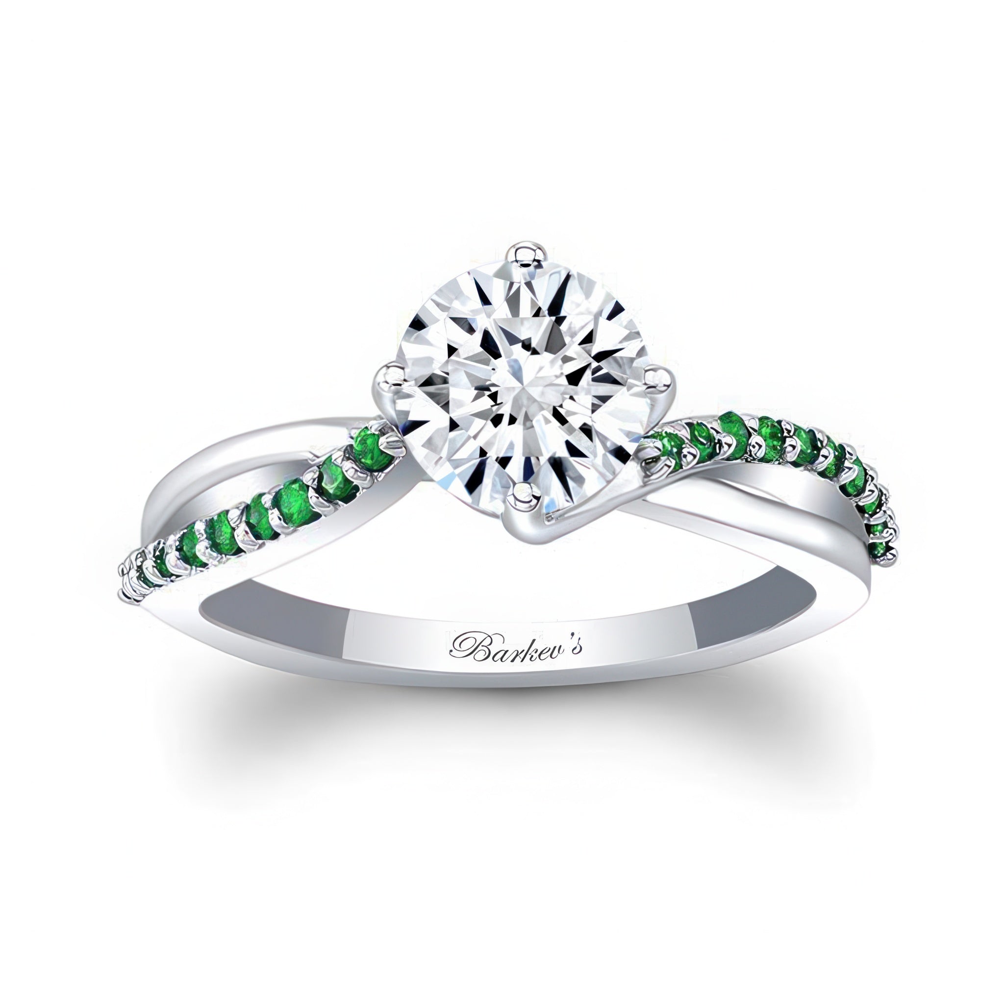 A radiant round moissanite glows at the center, known for its dazzling fire and eco-conscious origins. Flanking the twisted band are vivid emerald accents that add rich color and timeless meaning—symbolizing renewal, balance, and devotion.