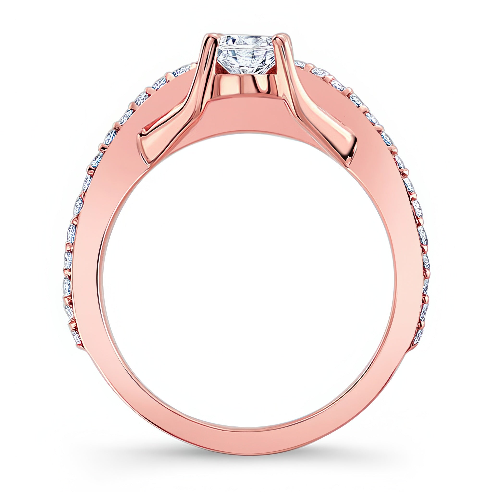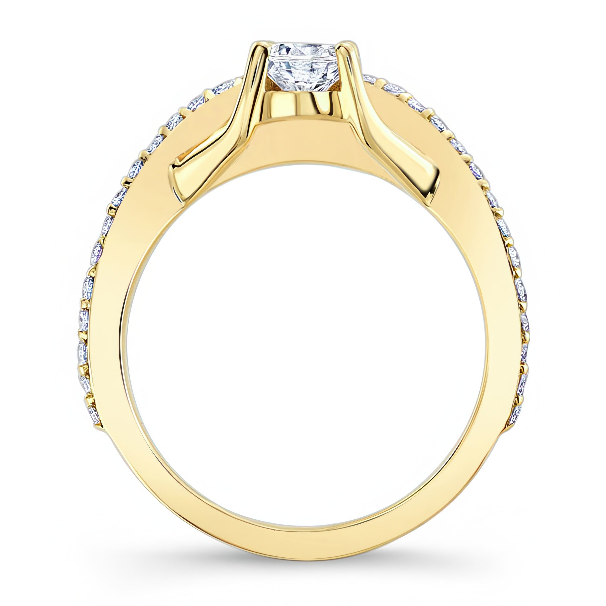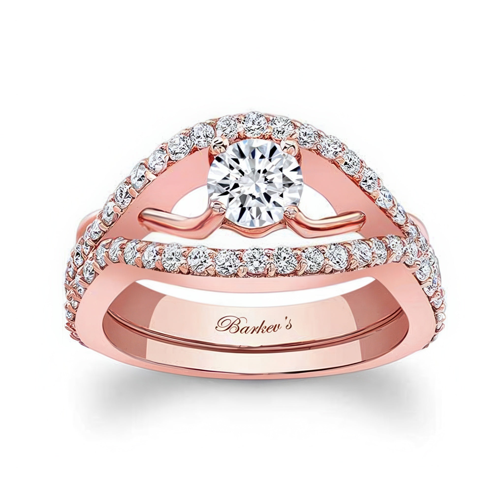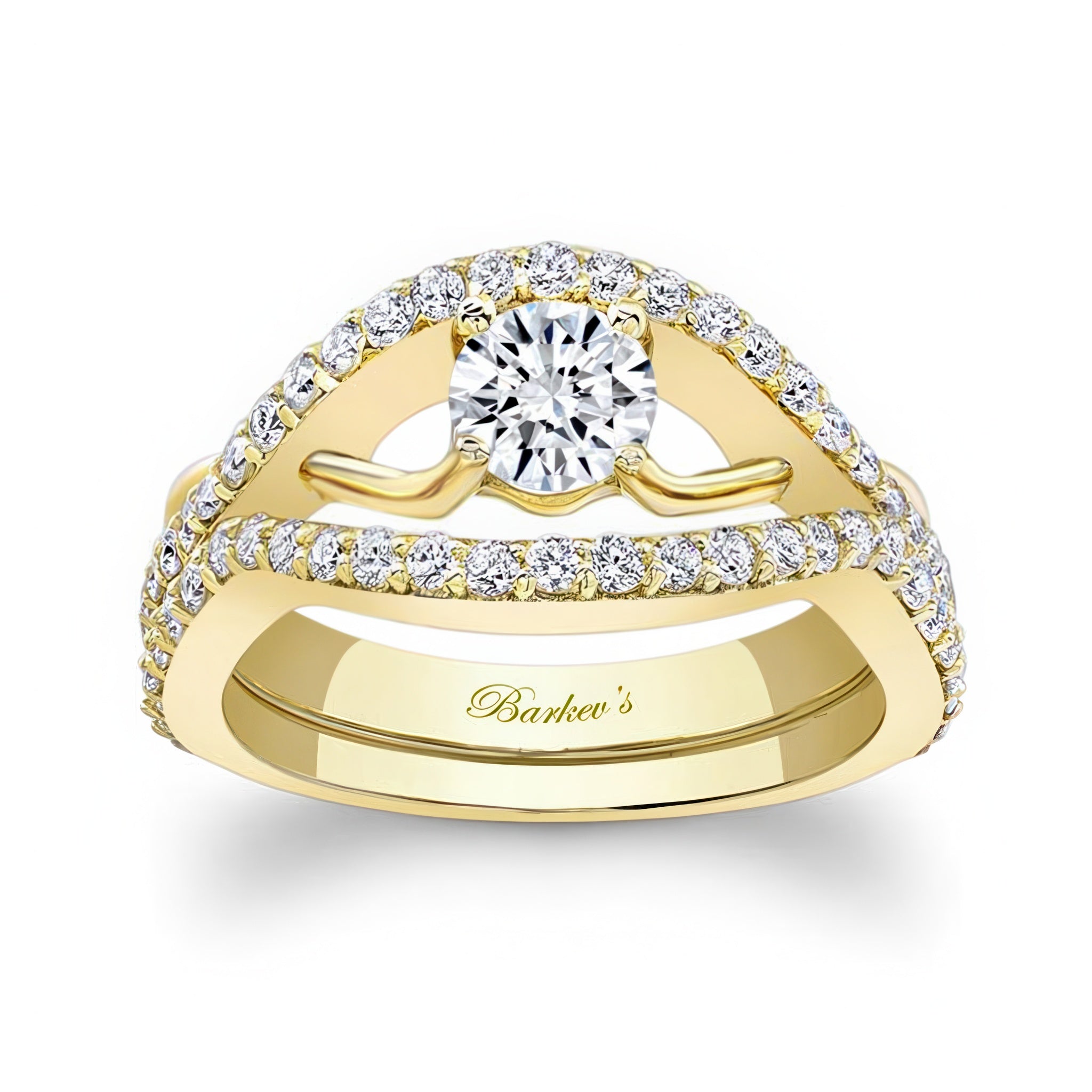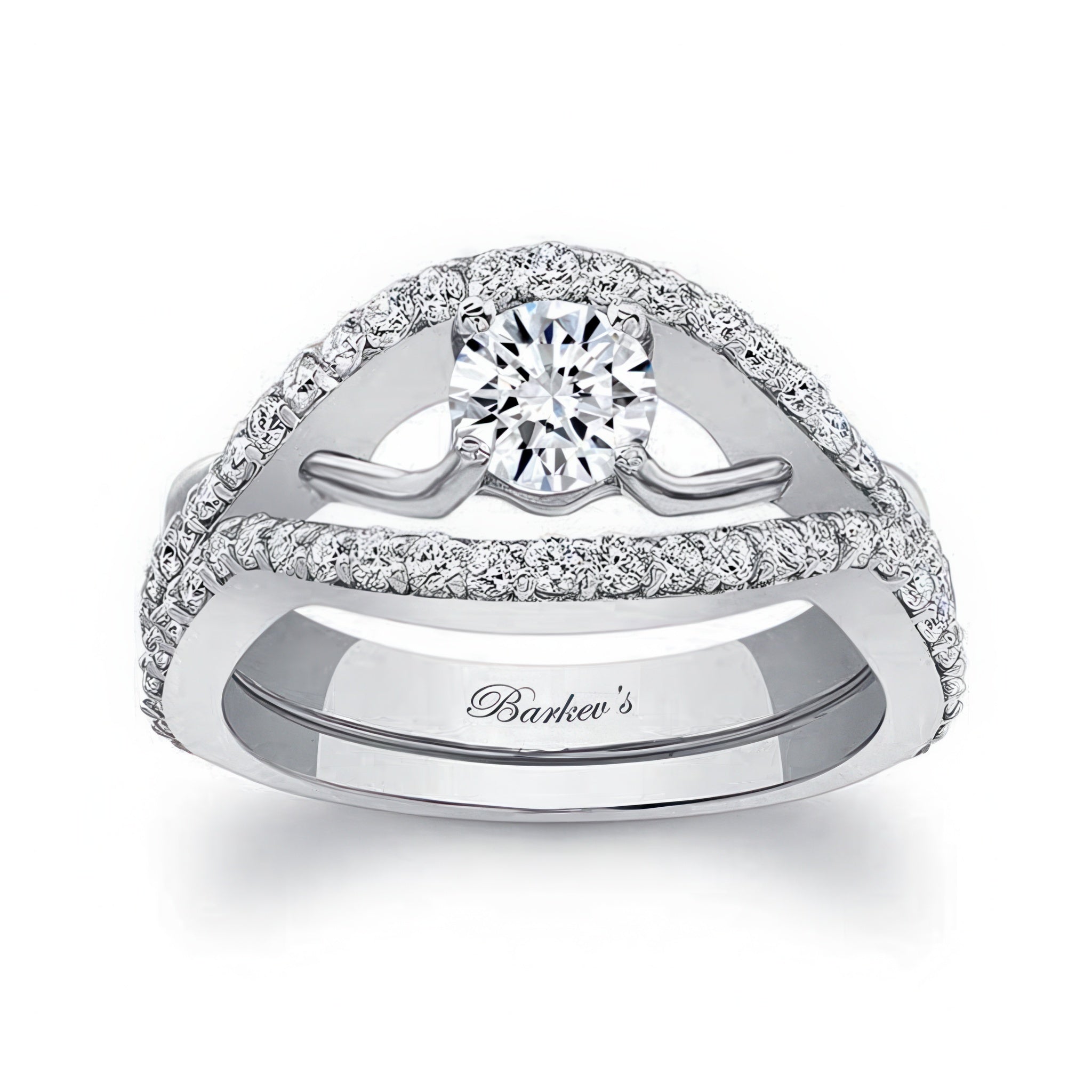 This unique half carat moissanite bridal set features a prong set round center with diamonds flowing down the ridges. Comes with a matching diamond wedding band.