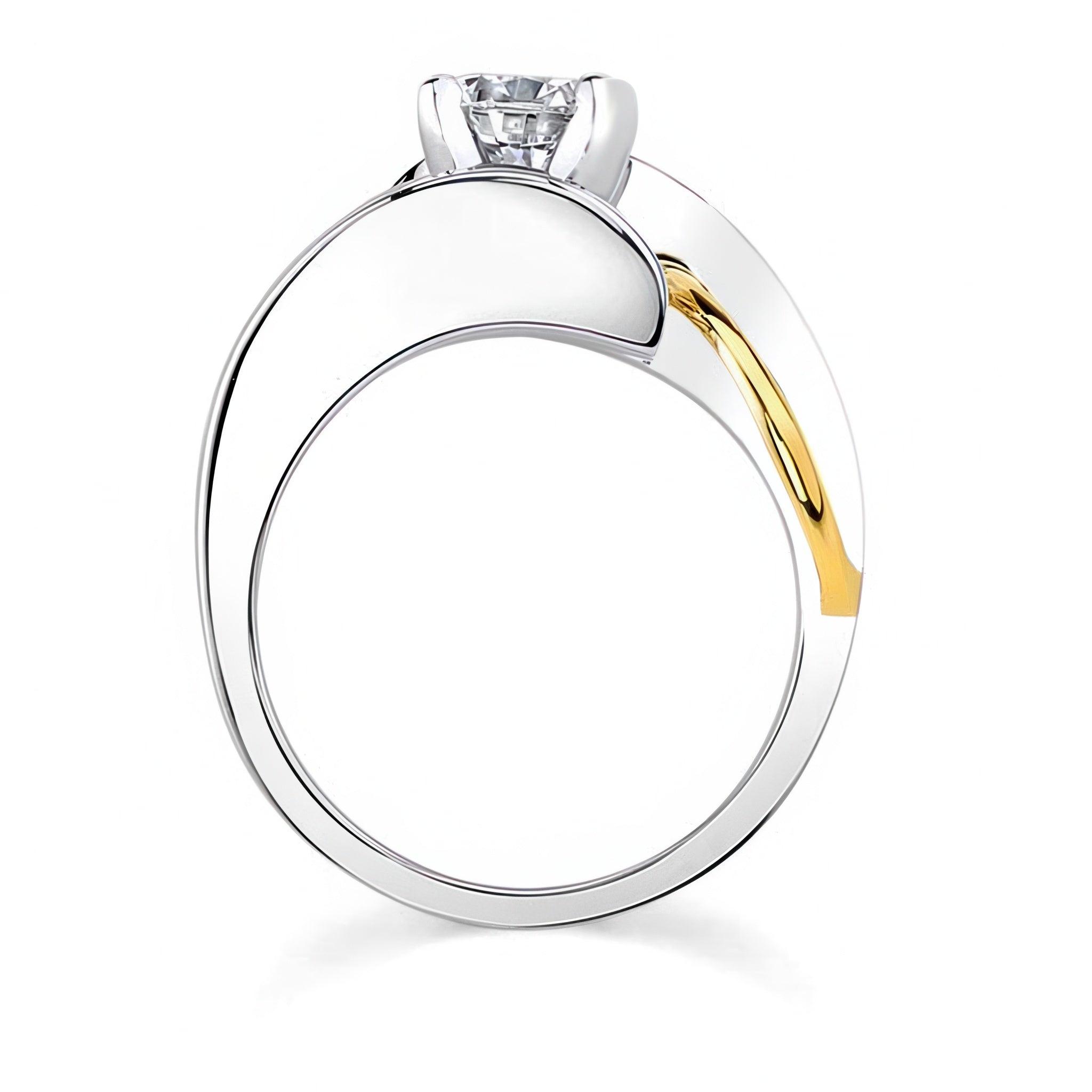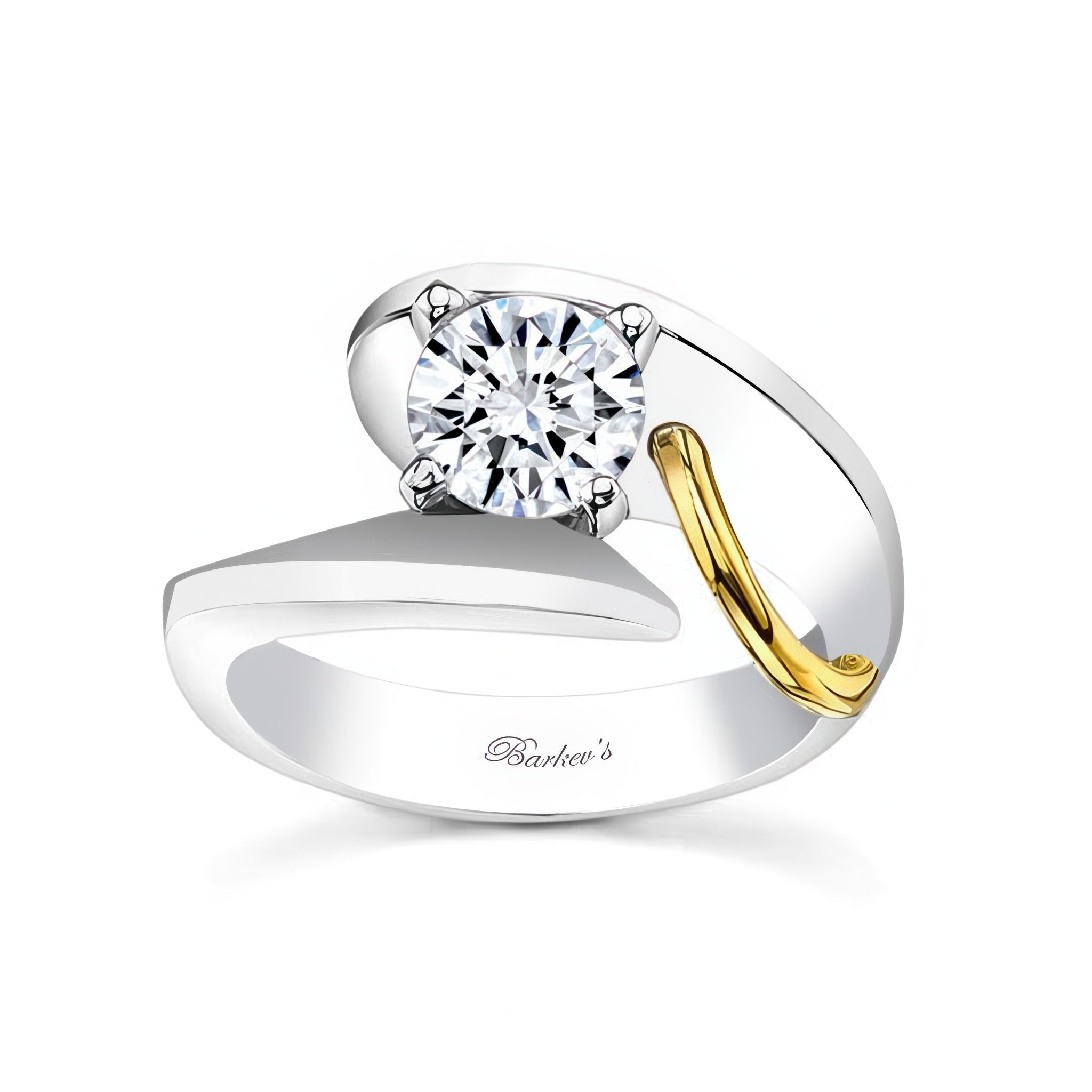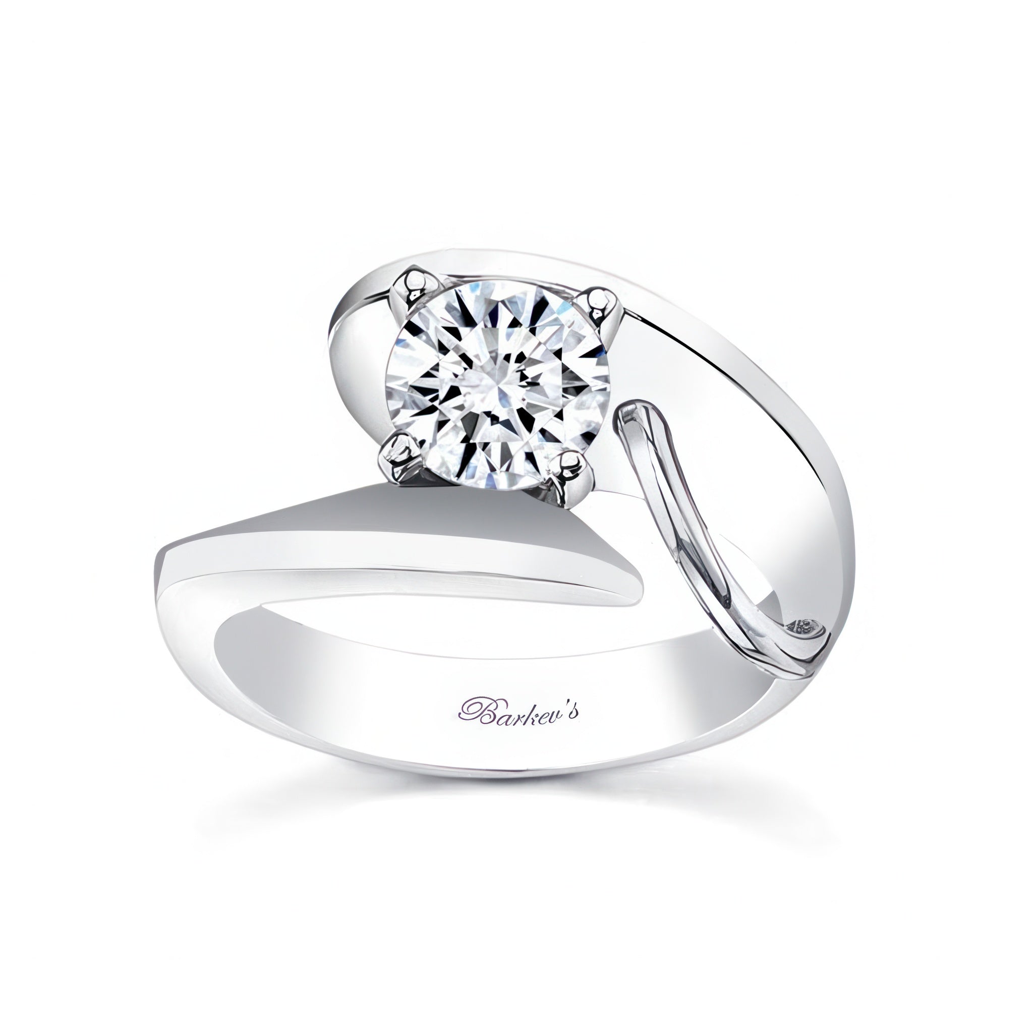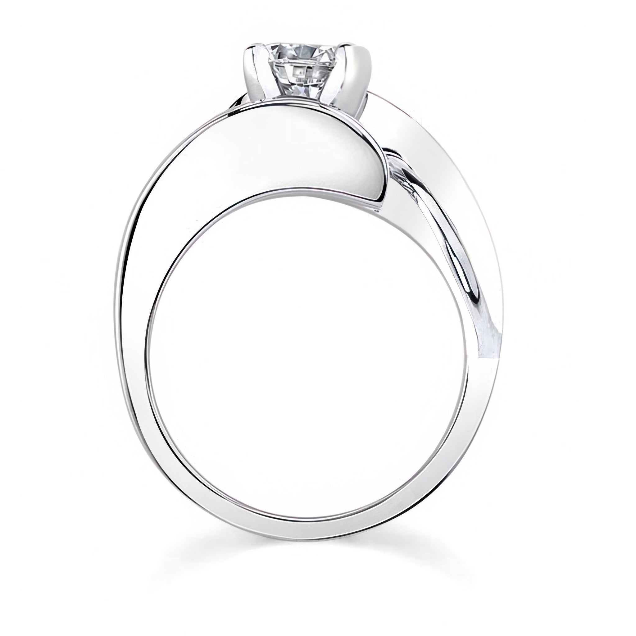 An unusual solitaire moissanite engagement ring featuring a bypass shank that curves around the prong set center with a unique wire trim accent for a stunning look.