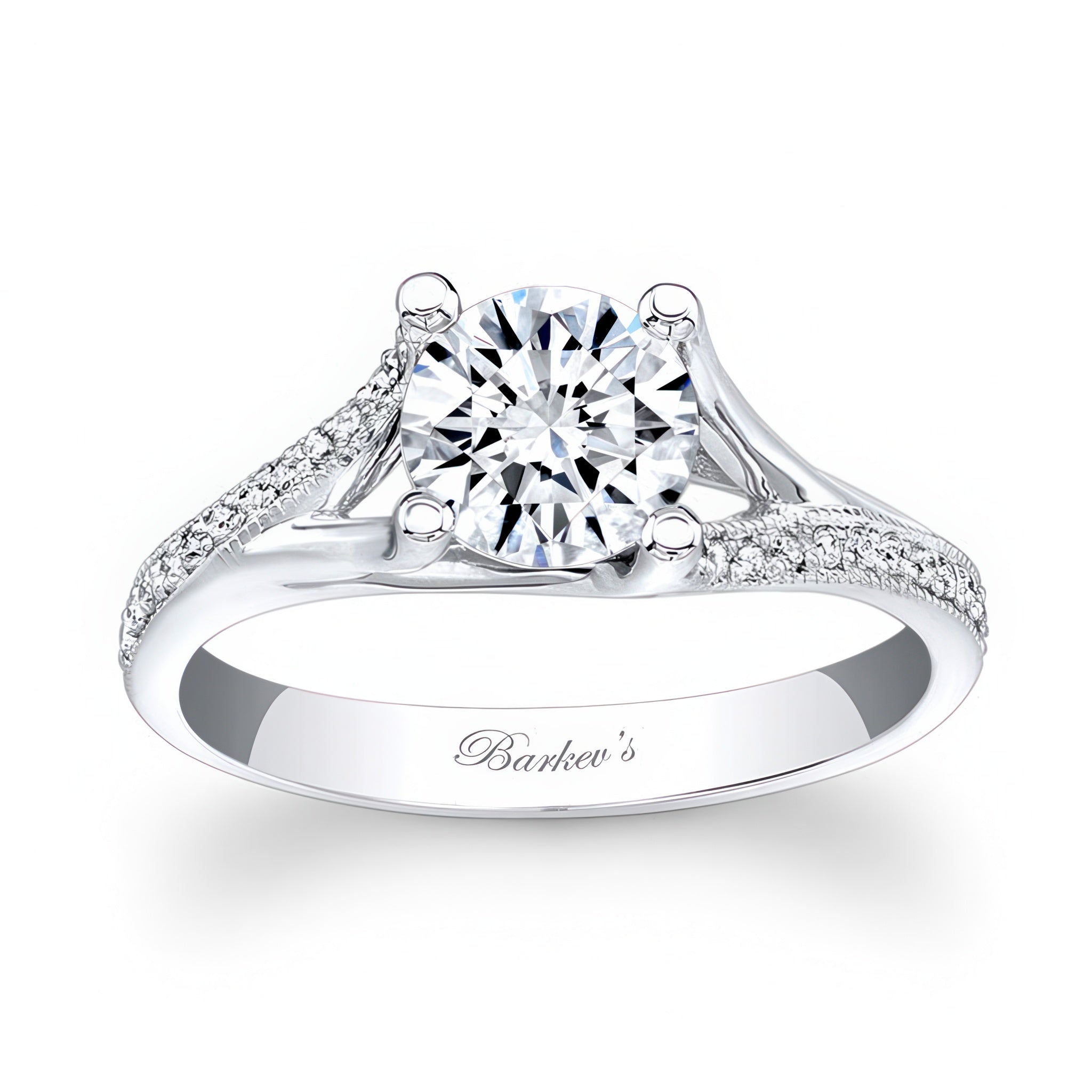 This classic v shaped moissanite engagement ring creates a soft feminine look with traditional styling. A split shank rises to the prong set round center while pave set diamonds grace opposing shoulders.