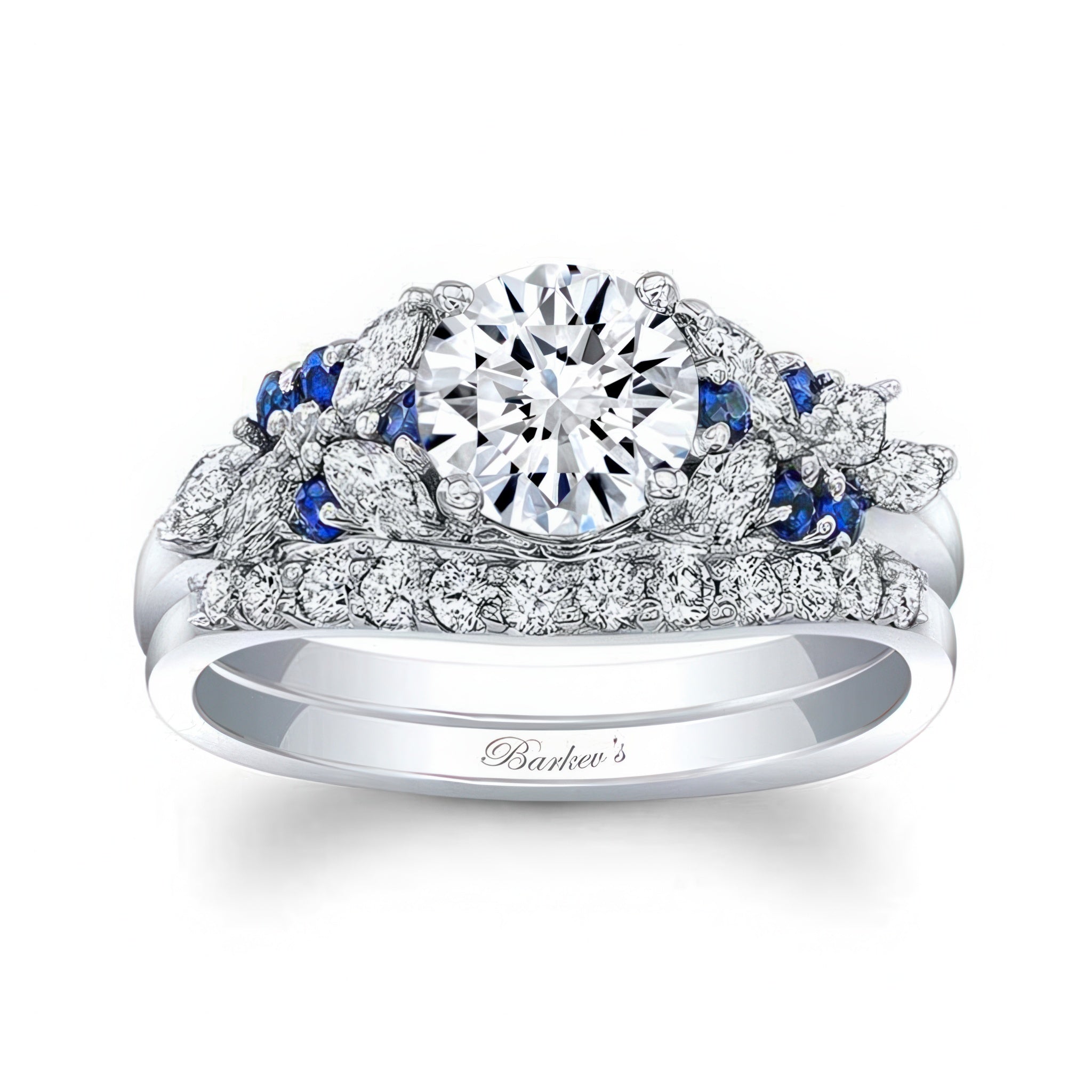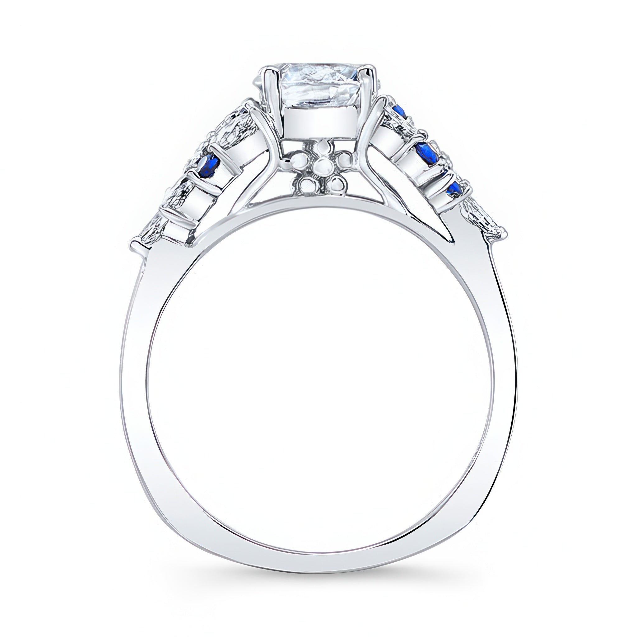 This exquisite vintage blue sapphire accent moissanite bridal set features a prong set round center with cathedral shoulders adorned with marquise cut diamonds and round blue sapphires. Comes with a matching diamond wedding band for an elegant touch of glam.