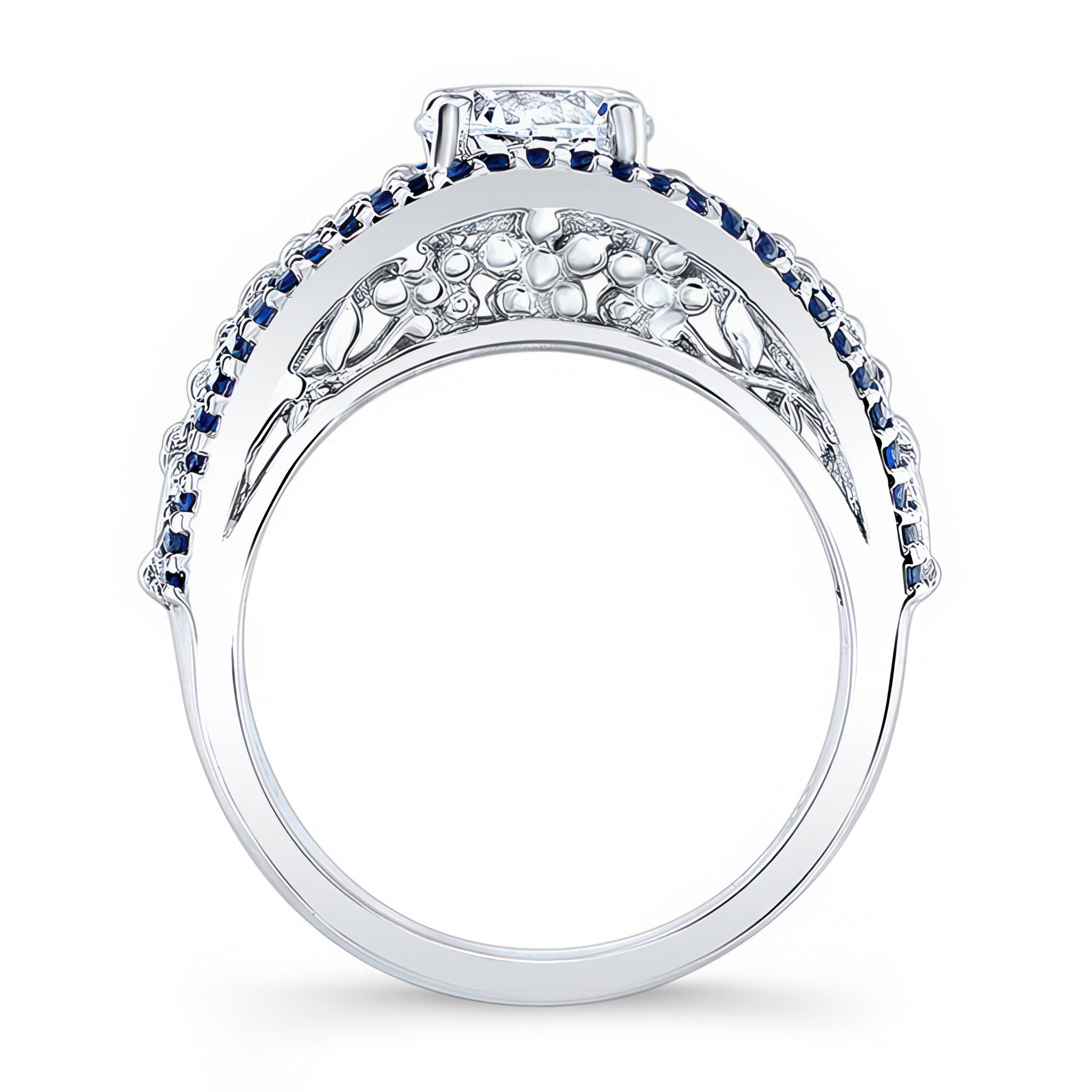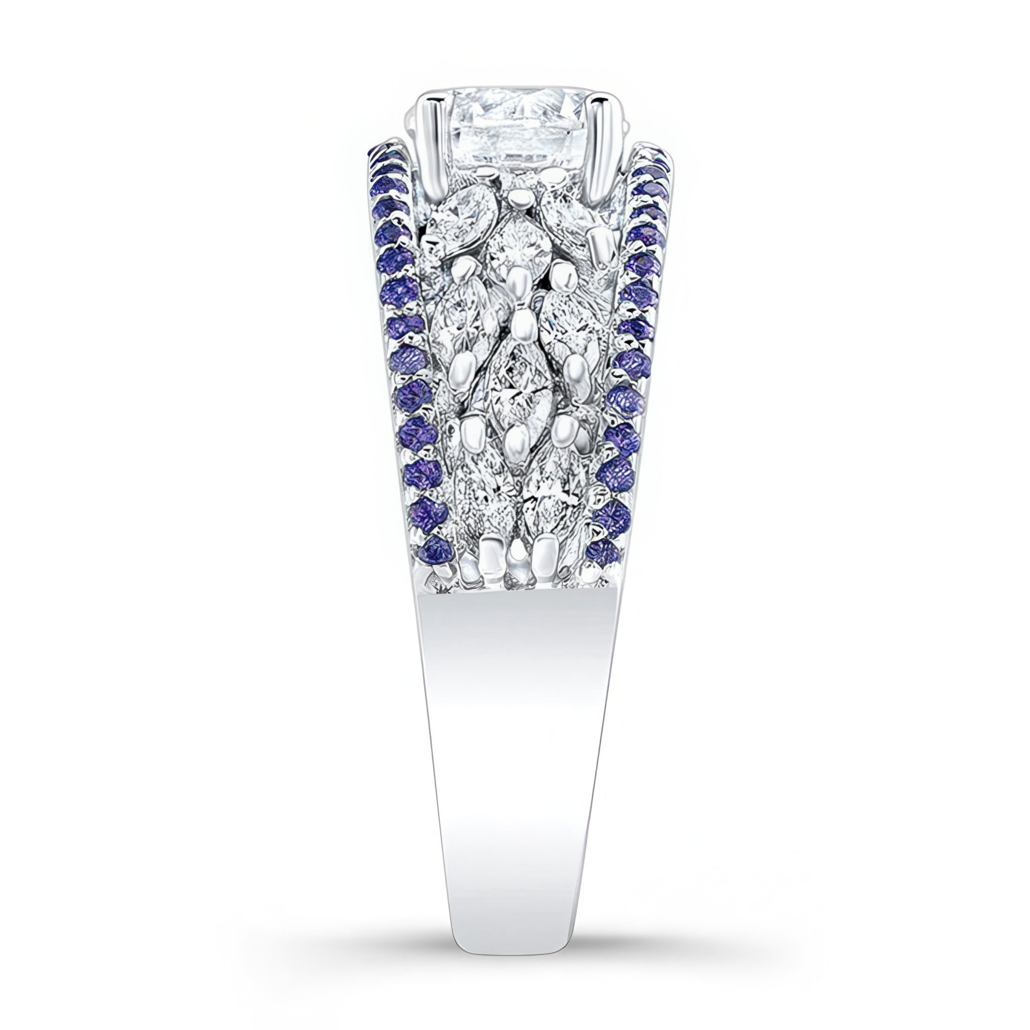 This vintage moissanite blue sapphire accent cluster ring features a prong set round center with a spray of marquise diamonds artfully cascading down the sides and a ridge of shared prong set blue sapphires on the shoulders for an elegant touch of glamour.