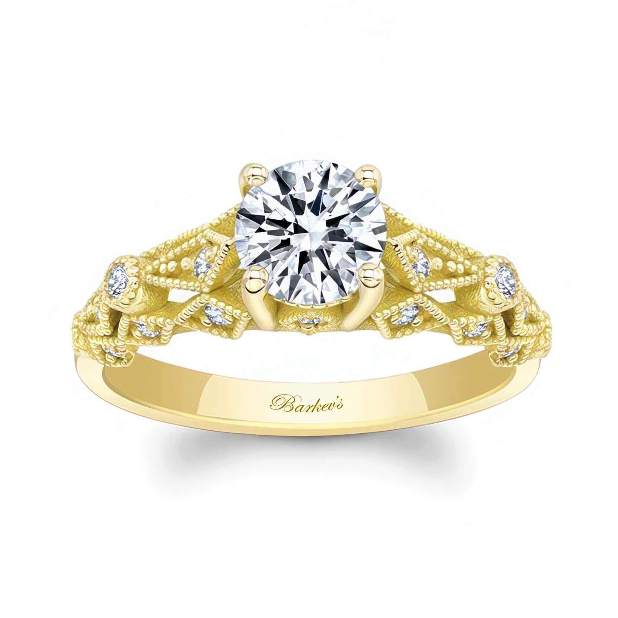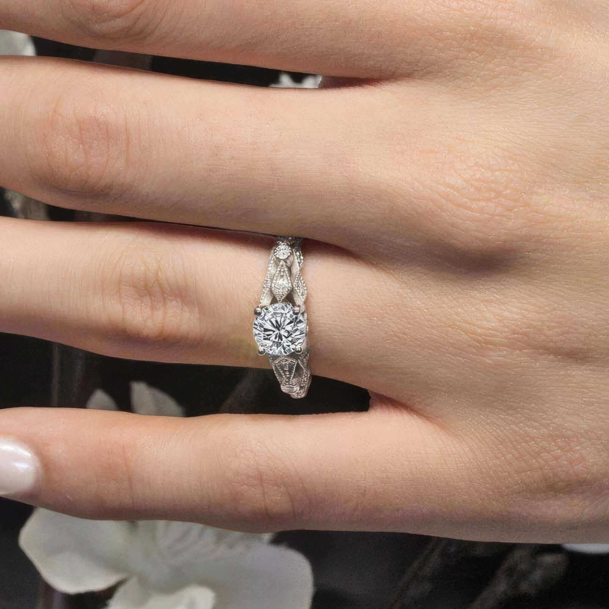This vintage moissanite ring features a prong set round center with a sprinkle of diamonds set on the intricately detailed shank for a look that's nothing short of stunning.