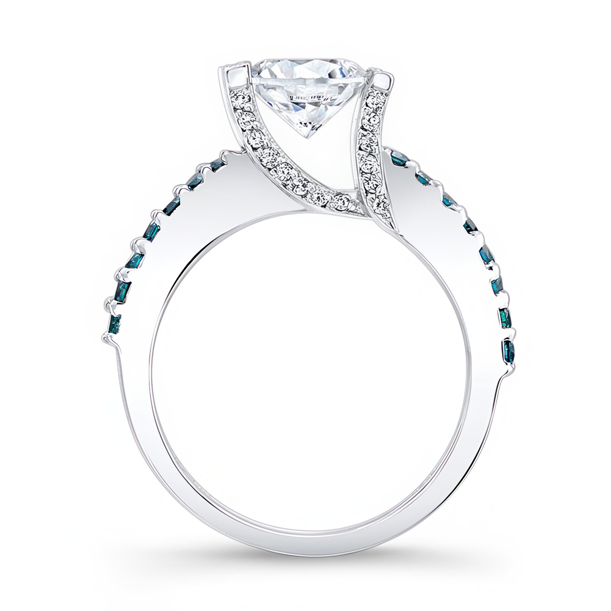 A vintage pave blue diamond accent moissanite ring sporting a channel set round center with pave set diamonds gracing the top and side walls and blue diamonds cascading down the shank adding a touch of drama.