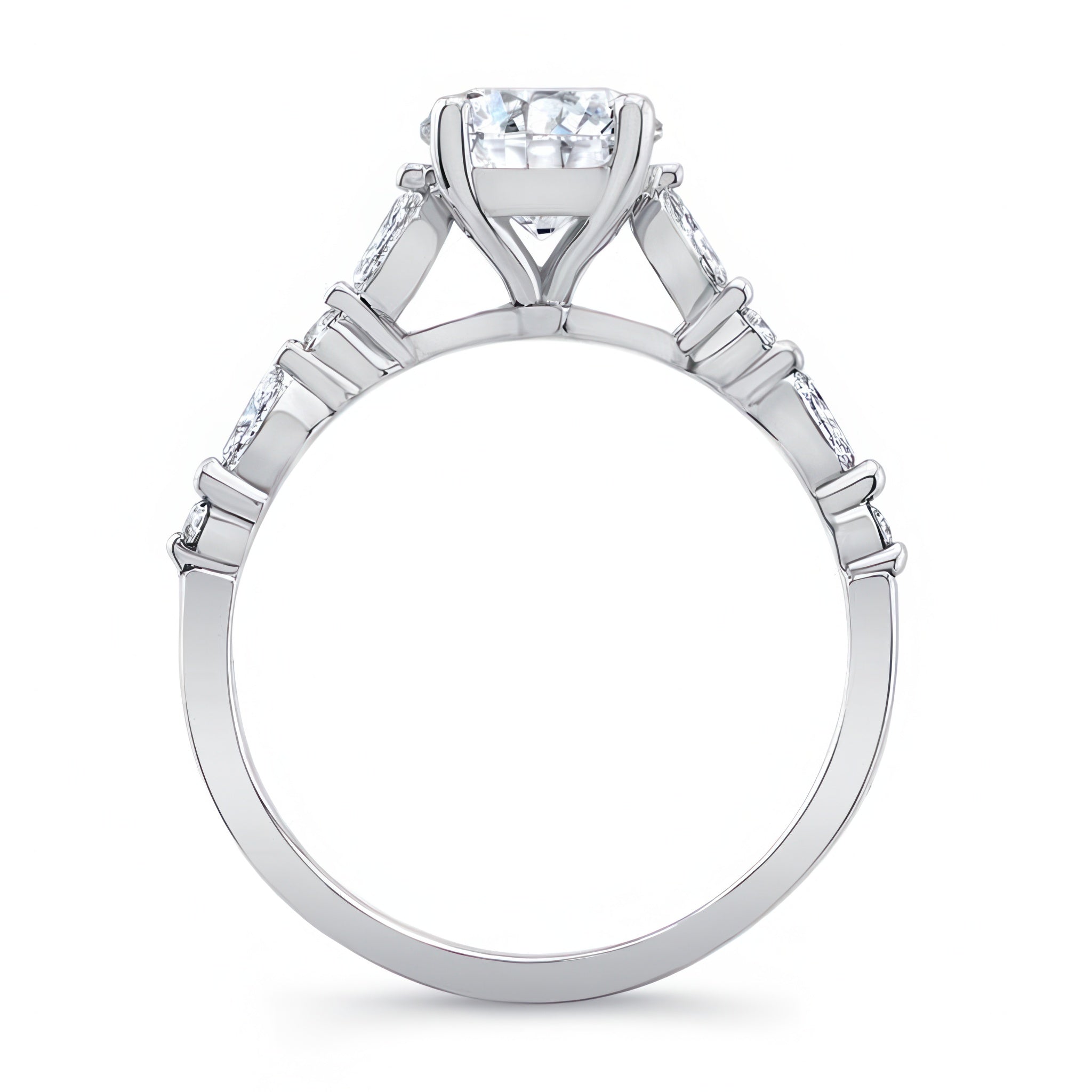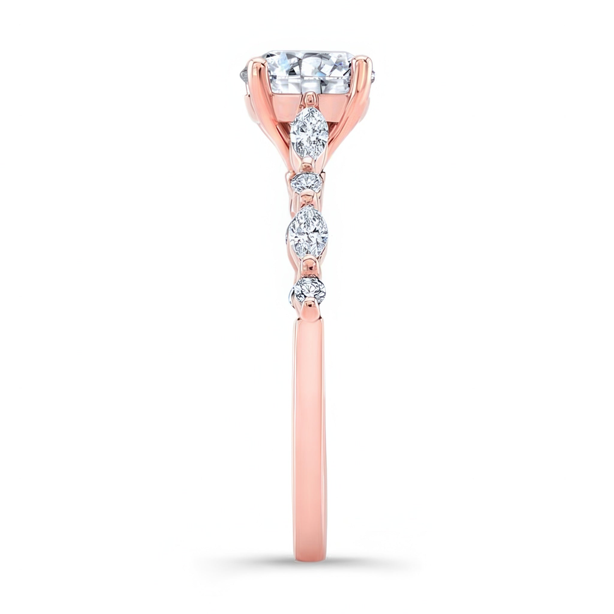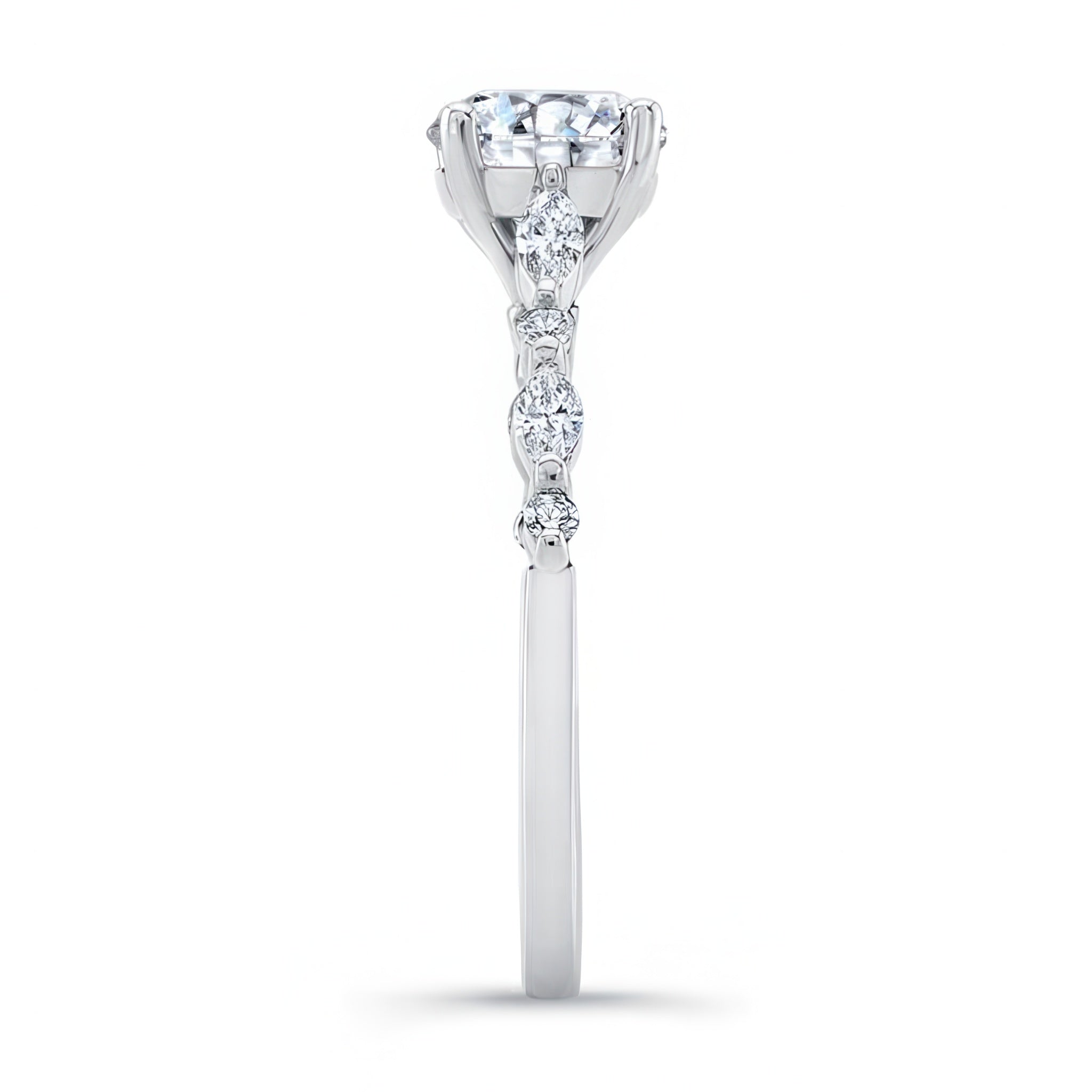 This delicate and chic vintage style moissanite ring sports a round center adorned on each side by a gentle set of alternating round and marquise diamonds.
