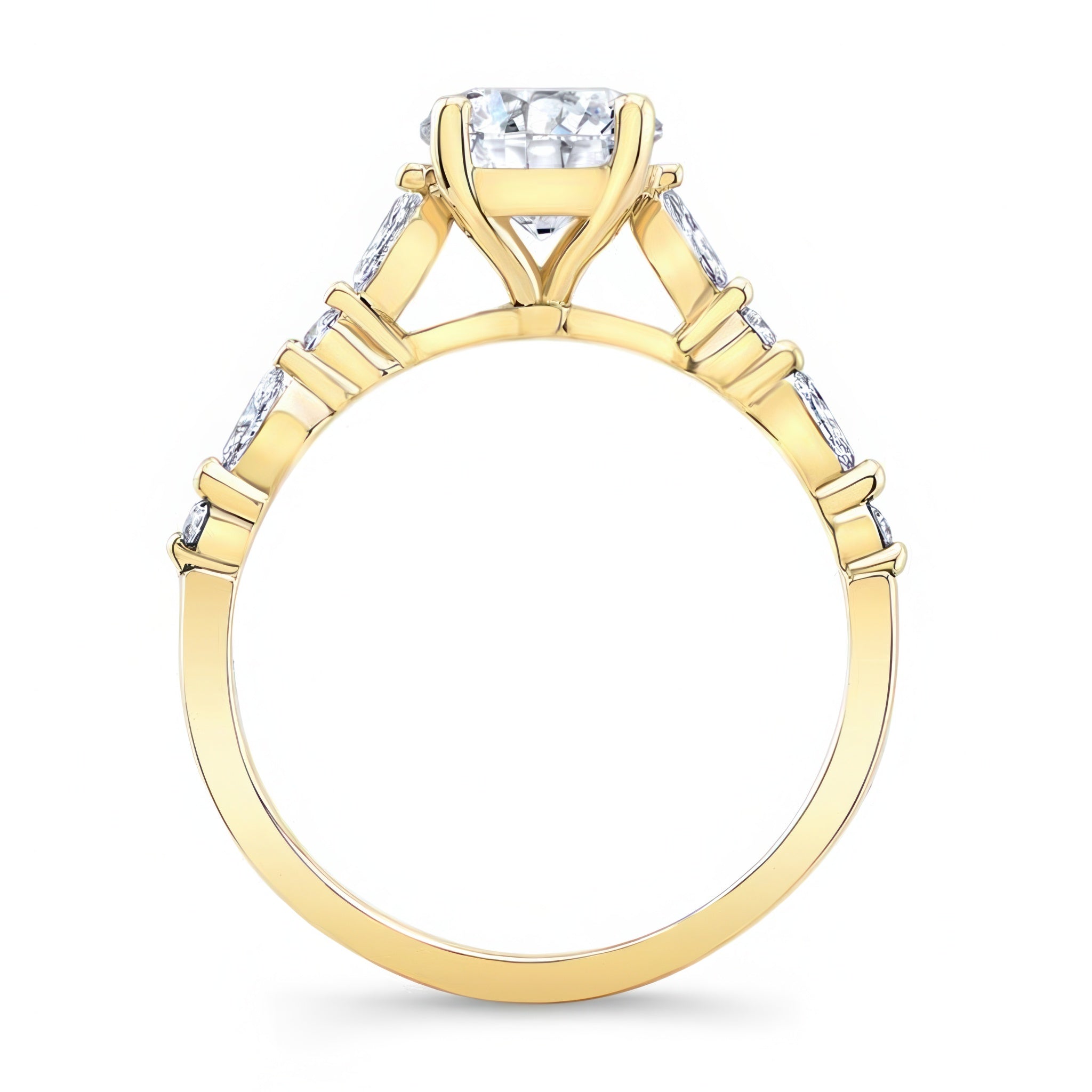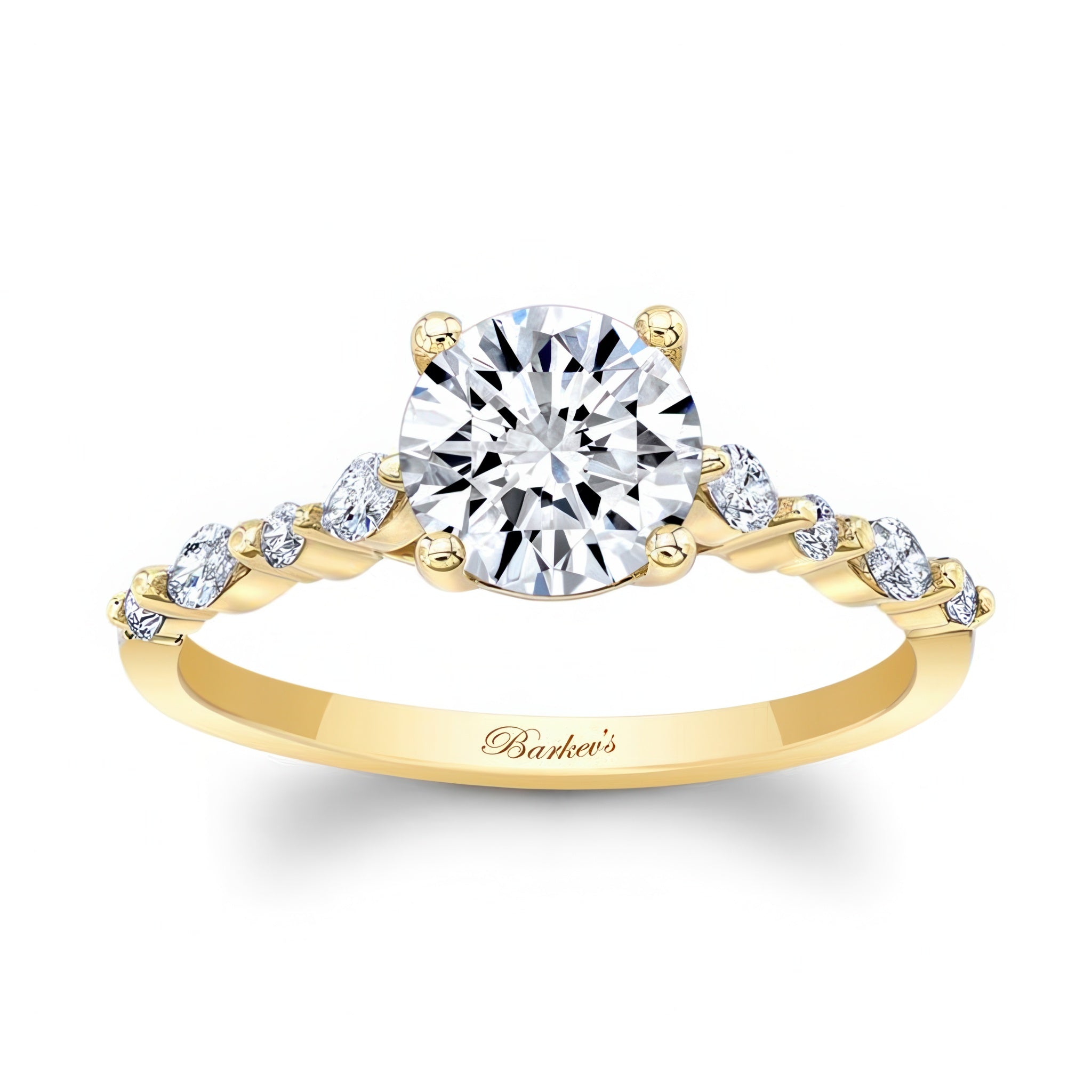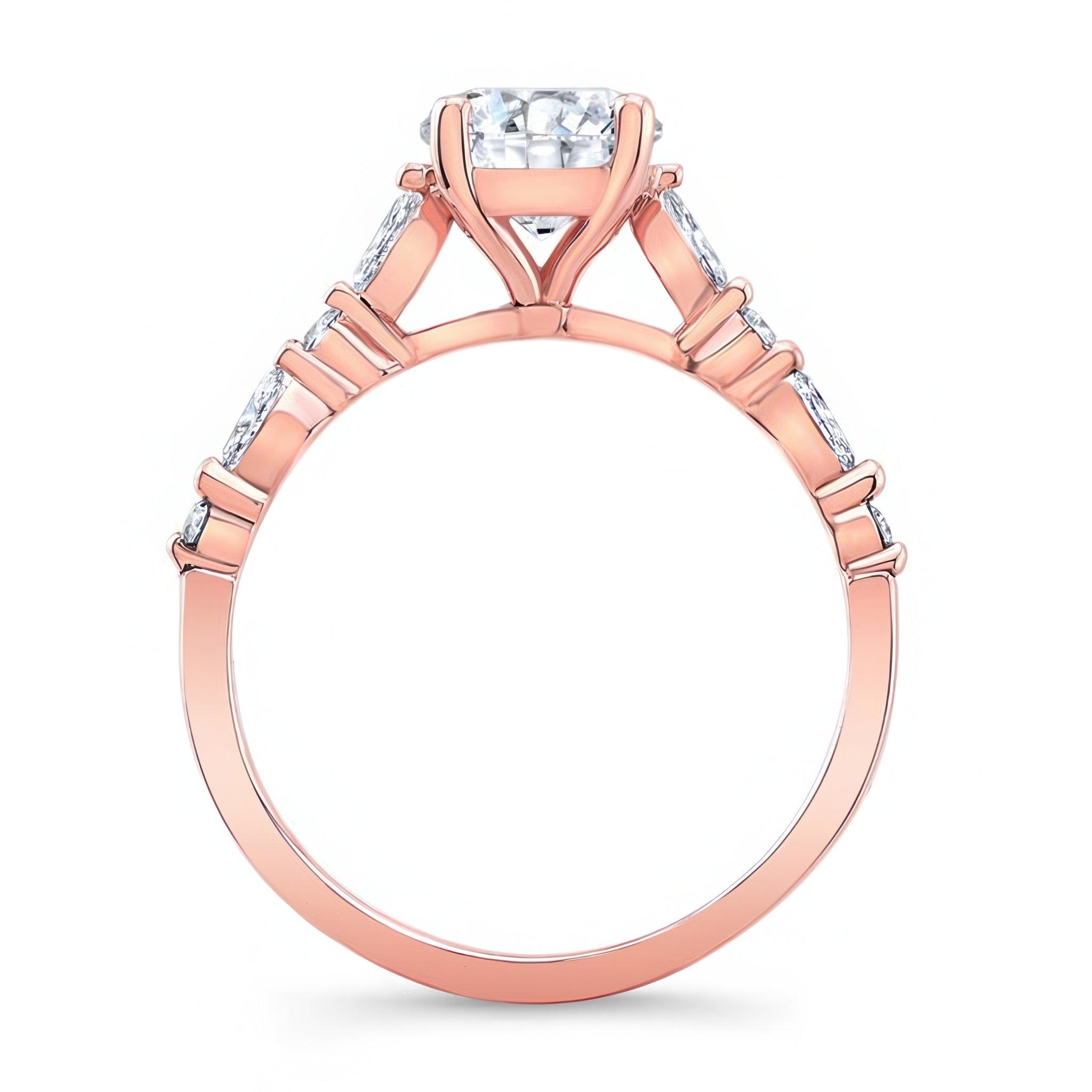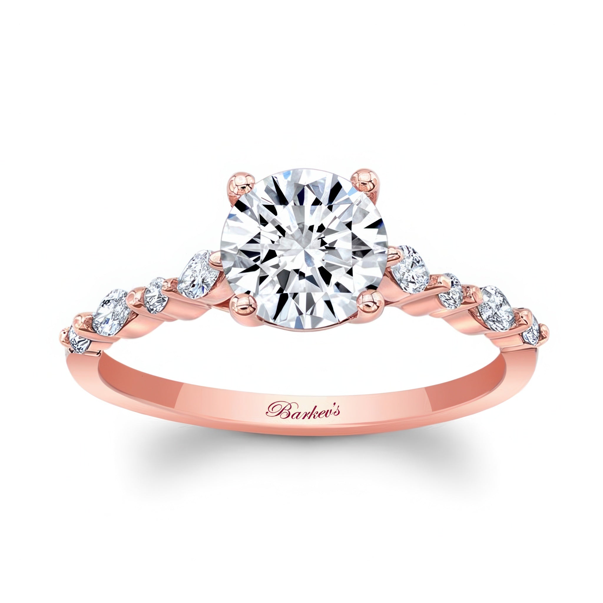 This delicate and chic vintage style moissanite ring sports a round center adorned on each side by a gentle set of alternating round and marquise diamonds.