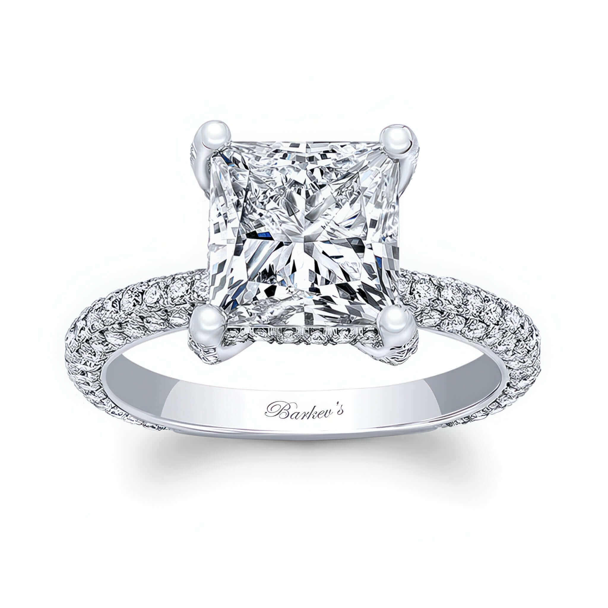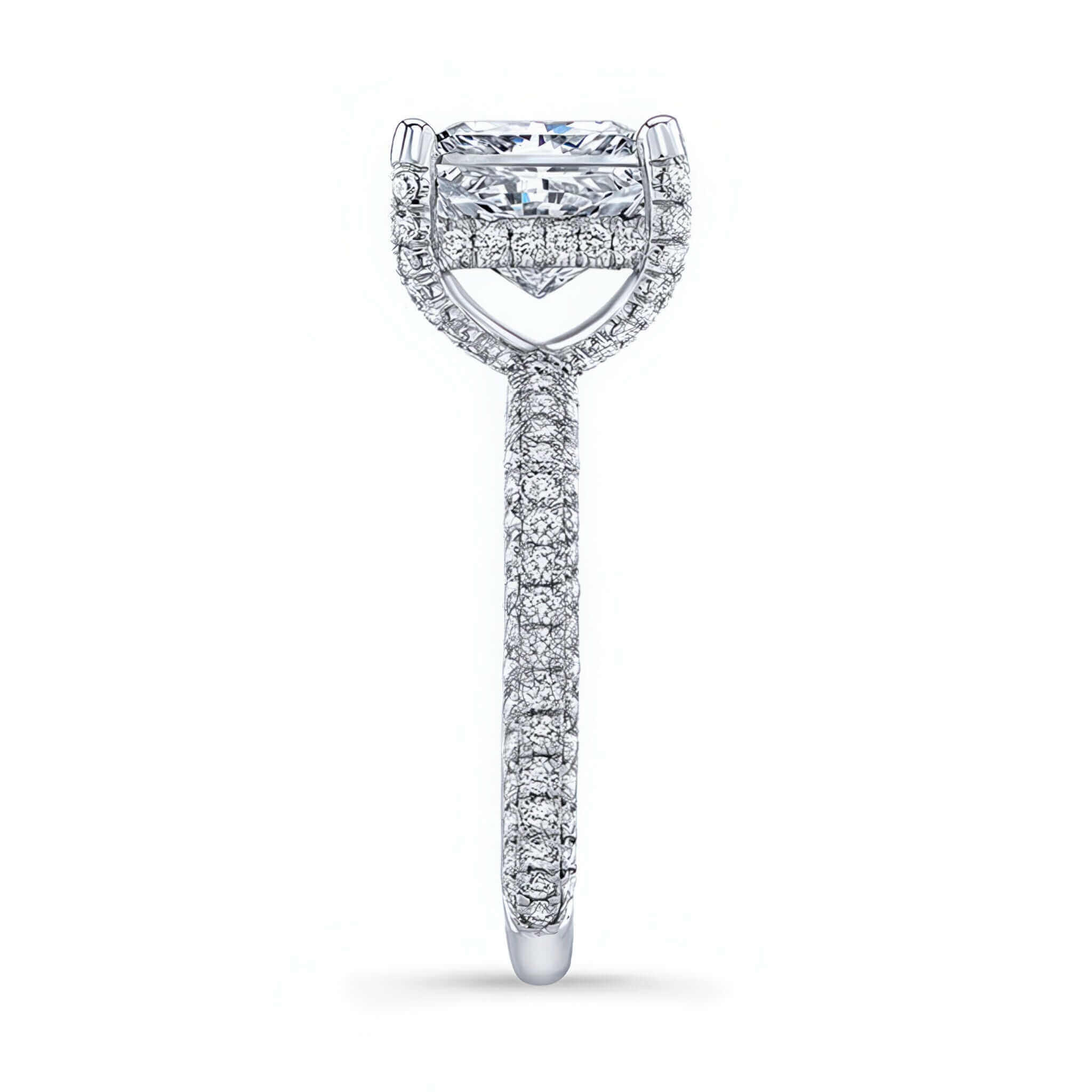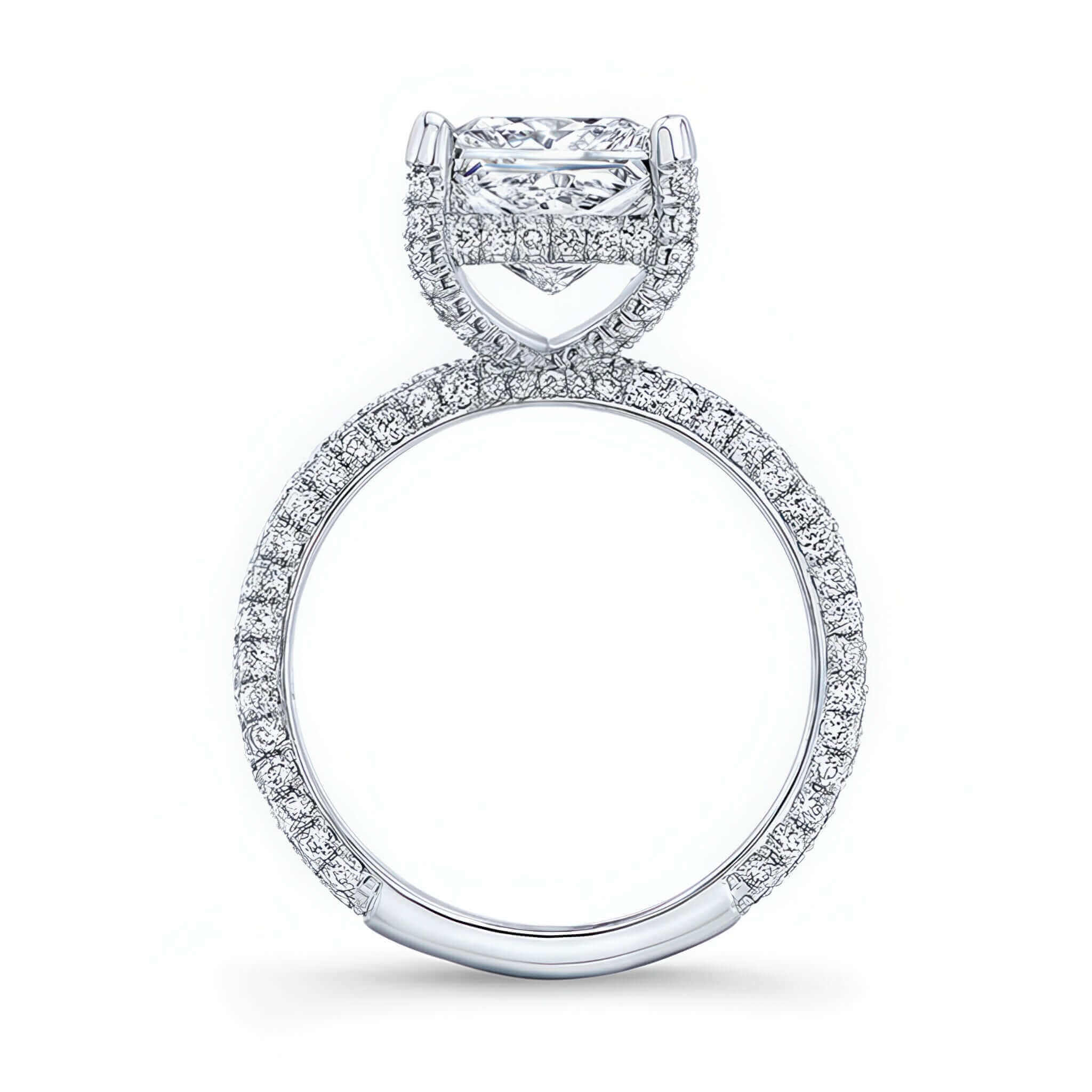 A stunning hidden halo moissanite engagement ring with an unexpected twist featuring a gorgeous princess cut center surrounded by hidden accents underneath. To add even more sparkle, both sides of the shank are encrusted with three rows of French pave diamonds for a true conversation starter to say the least.