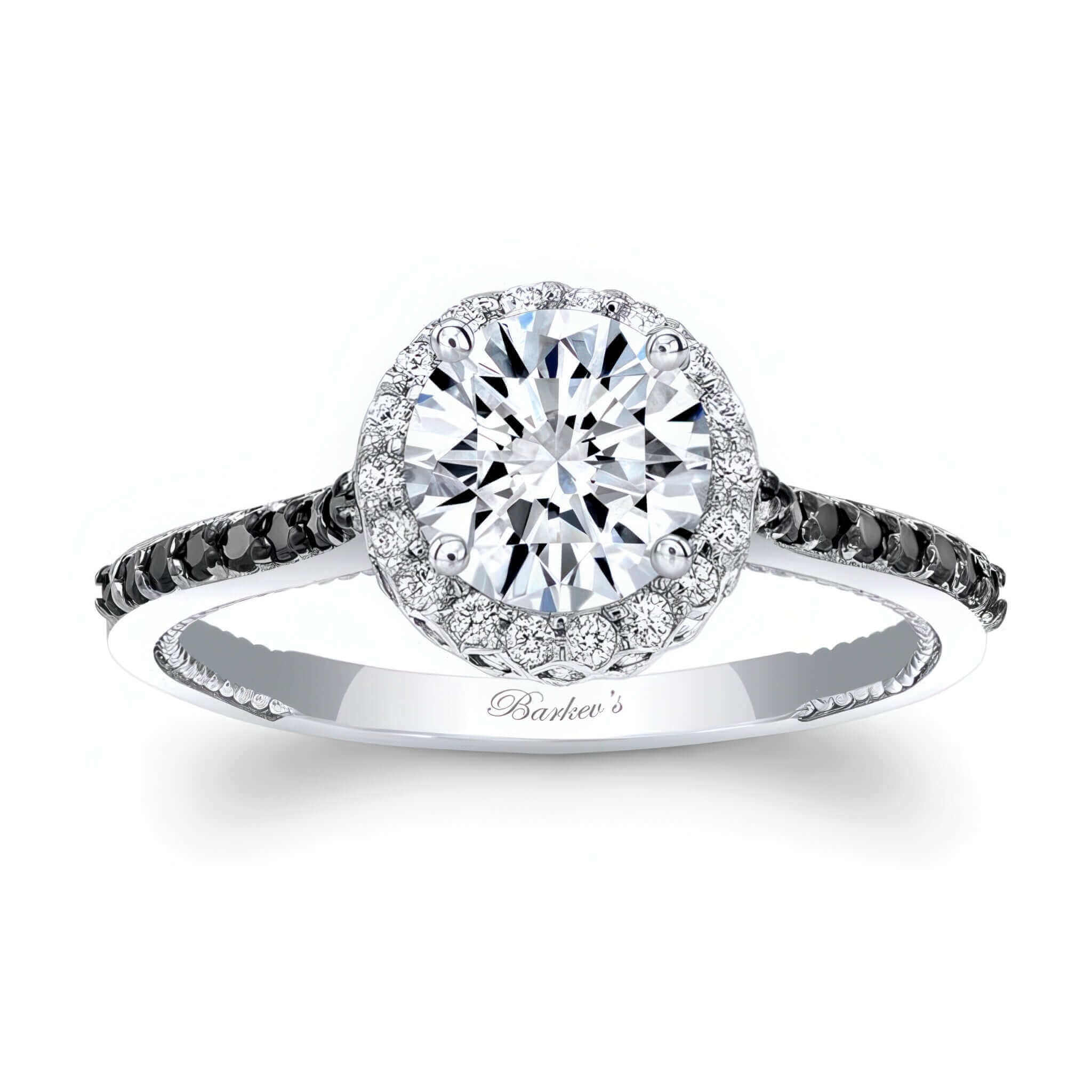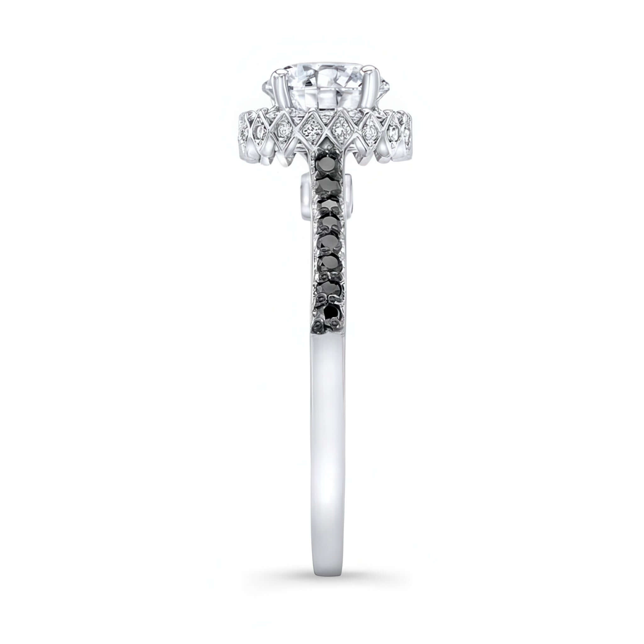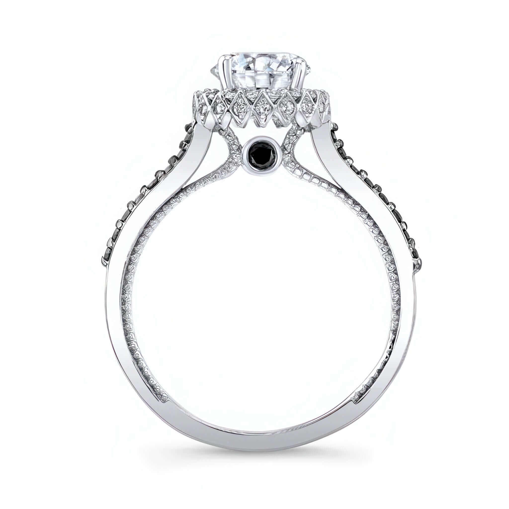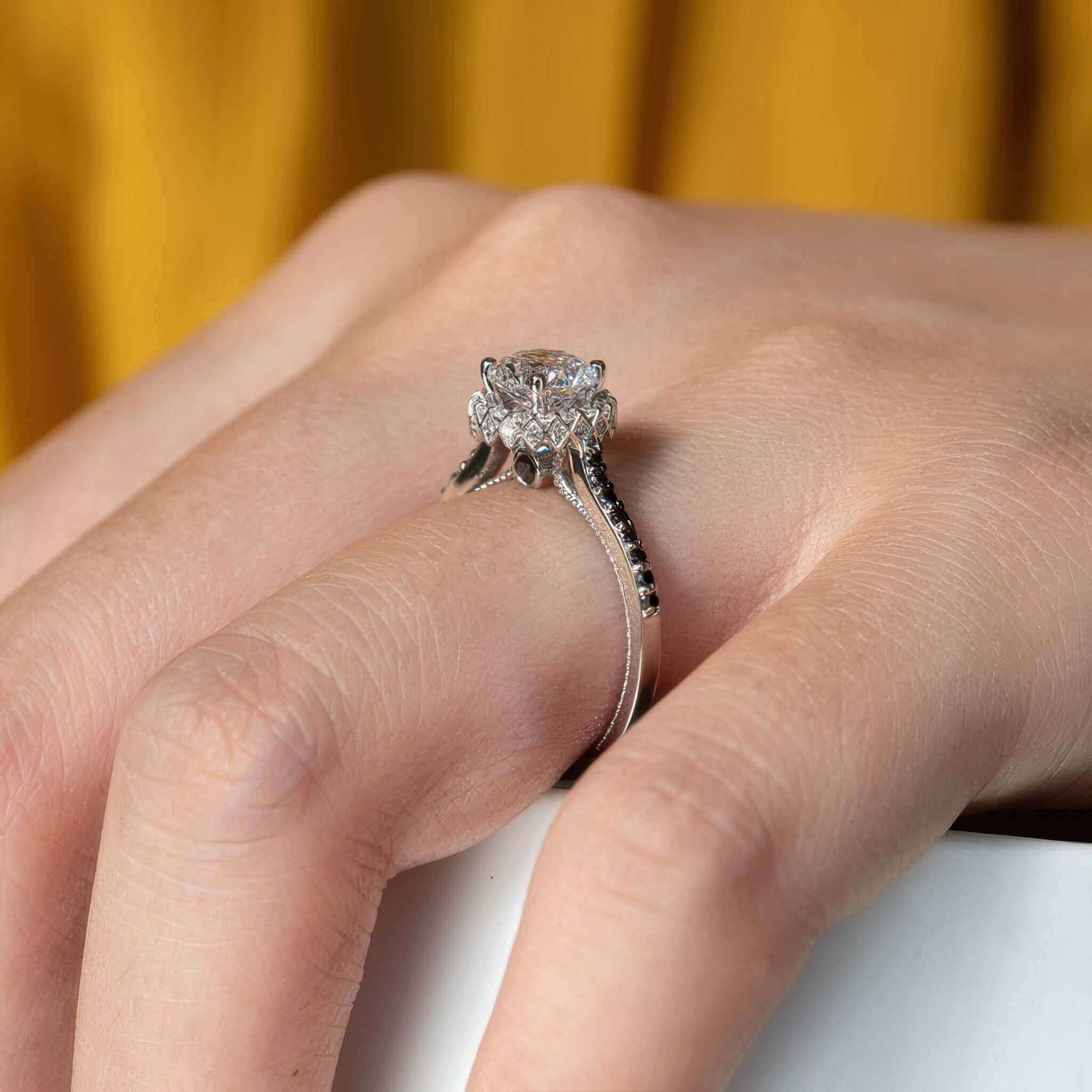 An exquisite round halo moissanite black diamond accent ring with a center surrounded by shared prong melees that continue down the shoulders. The profile view reveals a second hidden halo around the sides and two larger bezel set black diamonds sitting just beneath the center.