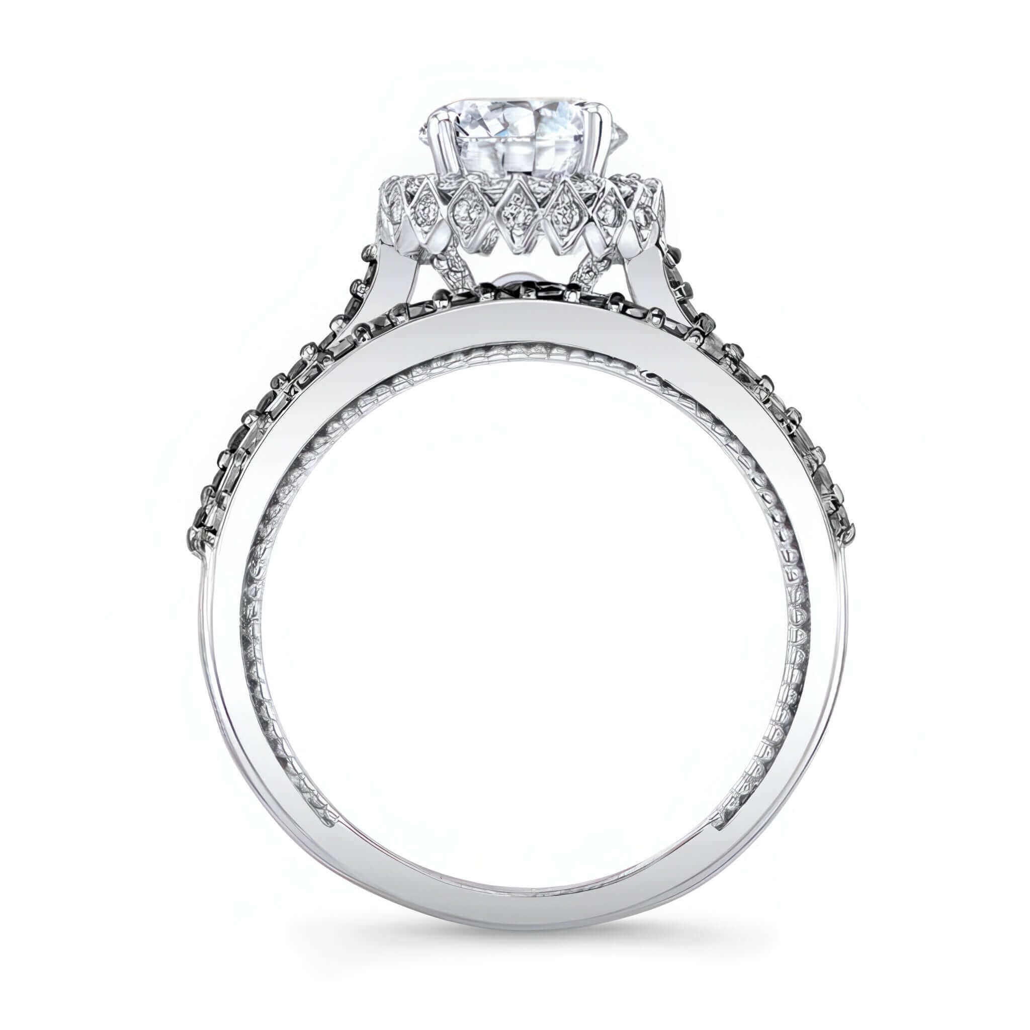 An exquisite round halo moissanite black diamond accent wedding set with a center surrounded by shared prong melees that continue down the shoulders. The profile view reveals a second hidden halo around the sides and two larger bezel set black diamonds sitting just beneath the center. A matching wedding band sits up closely on the side to emphasize the design.