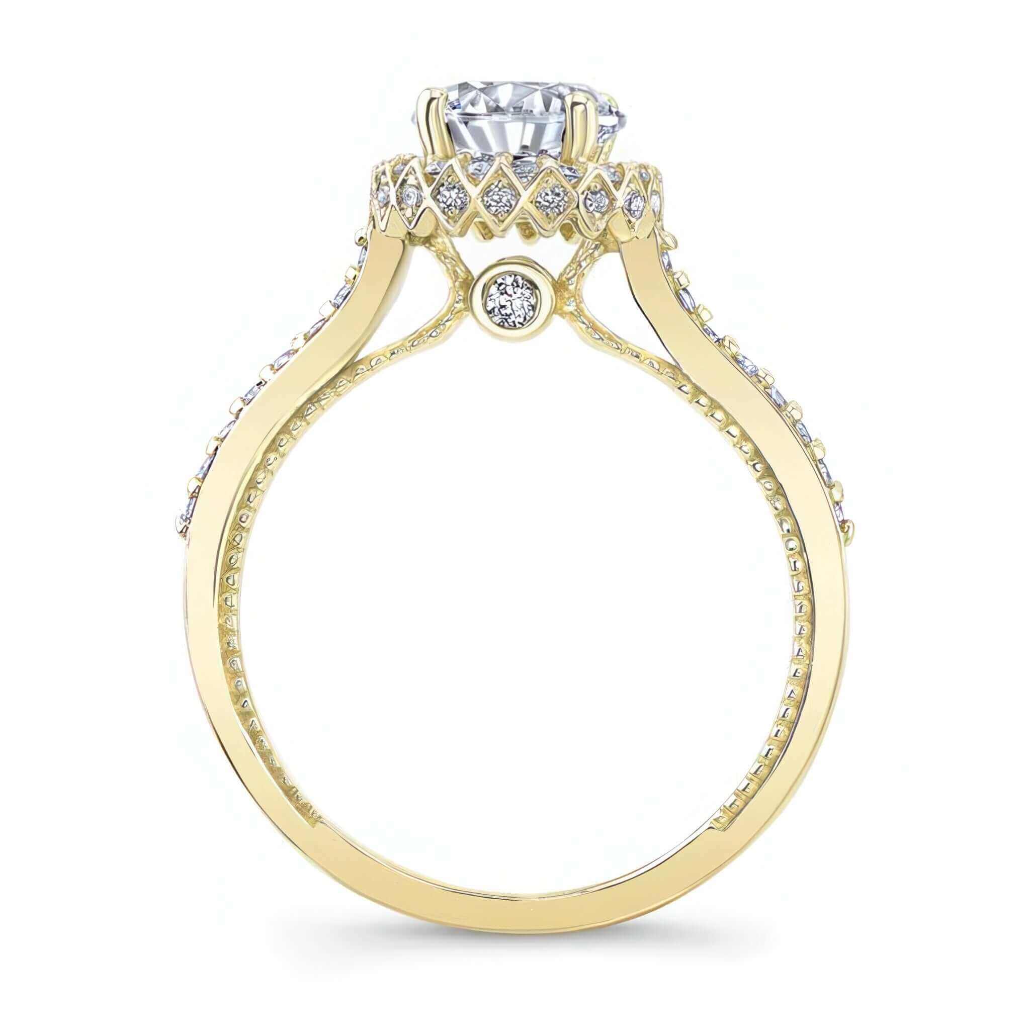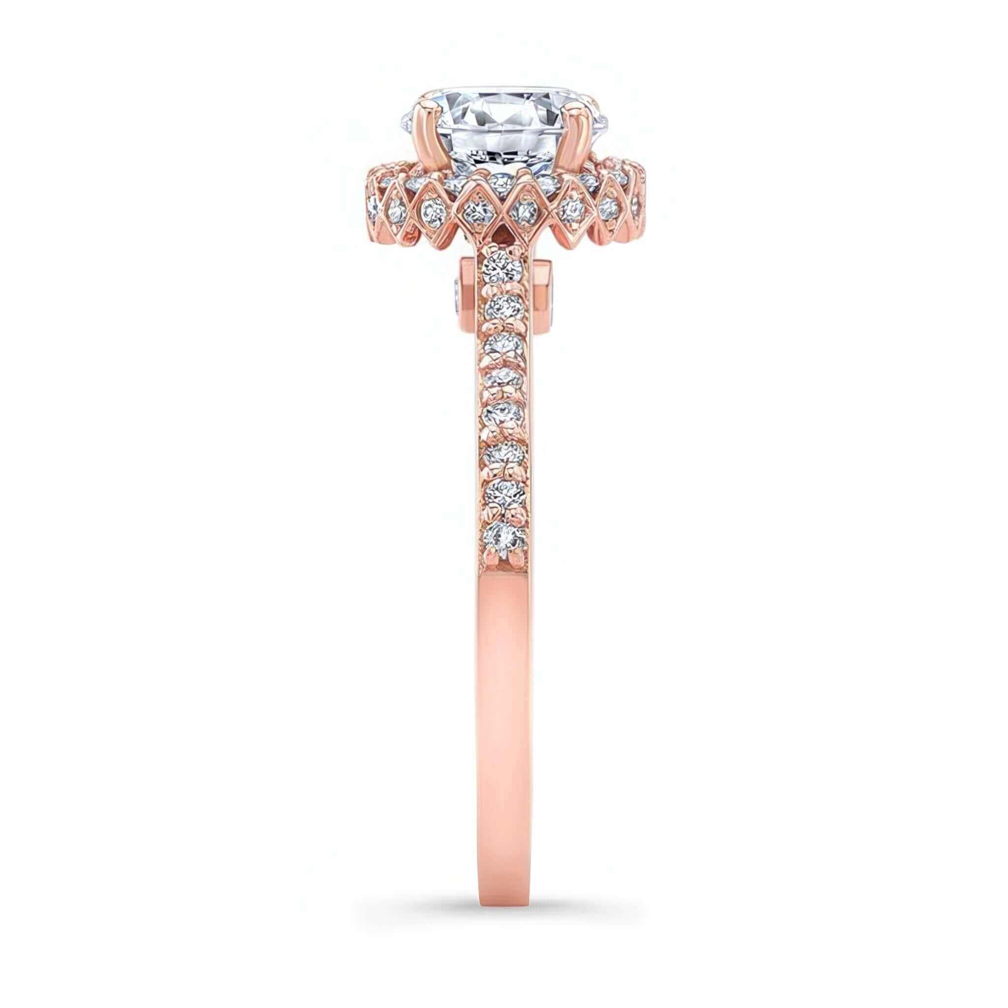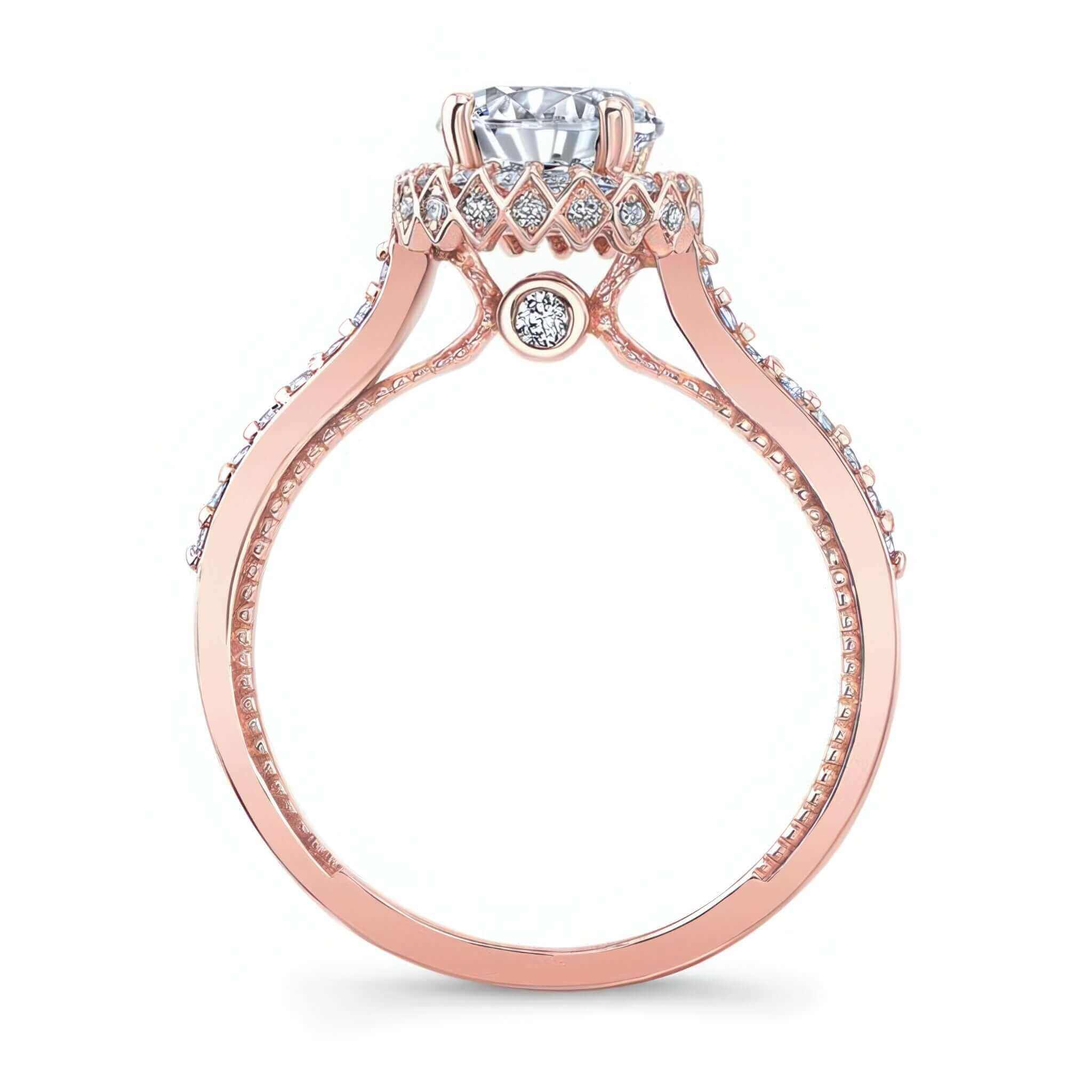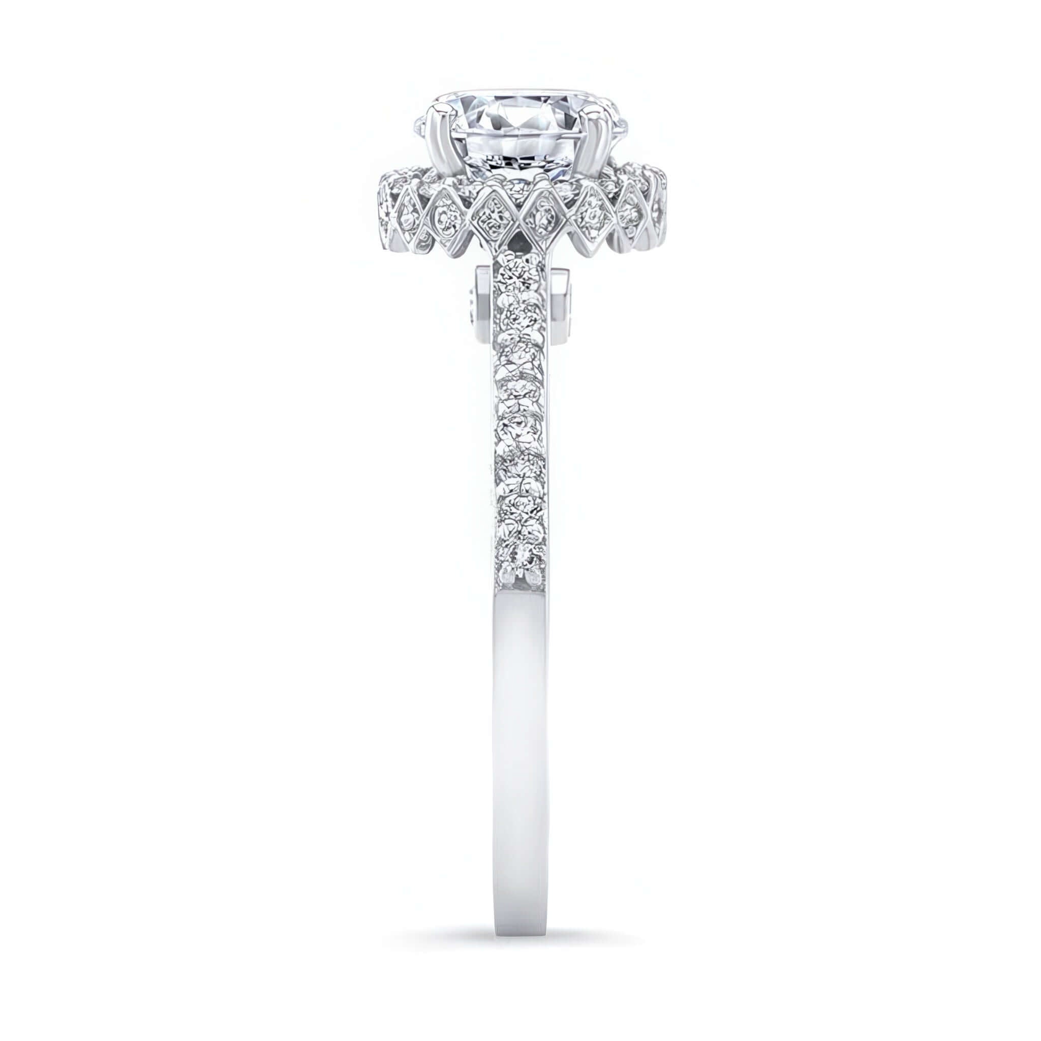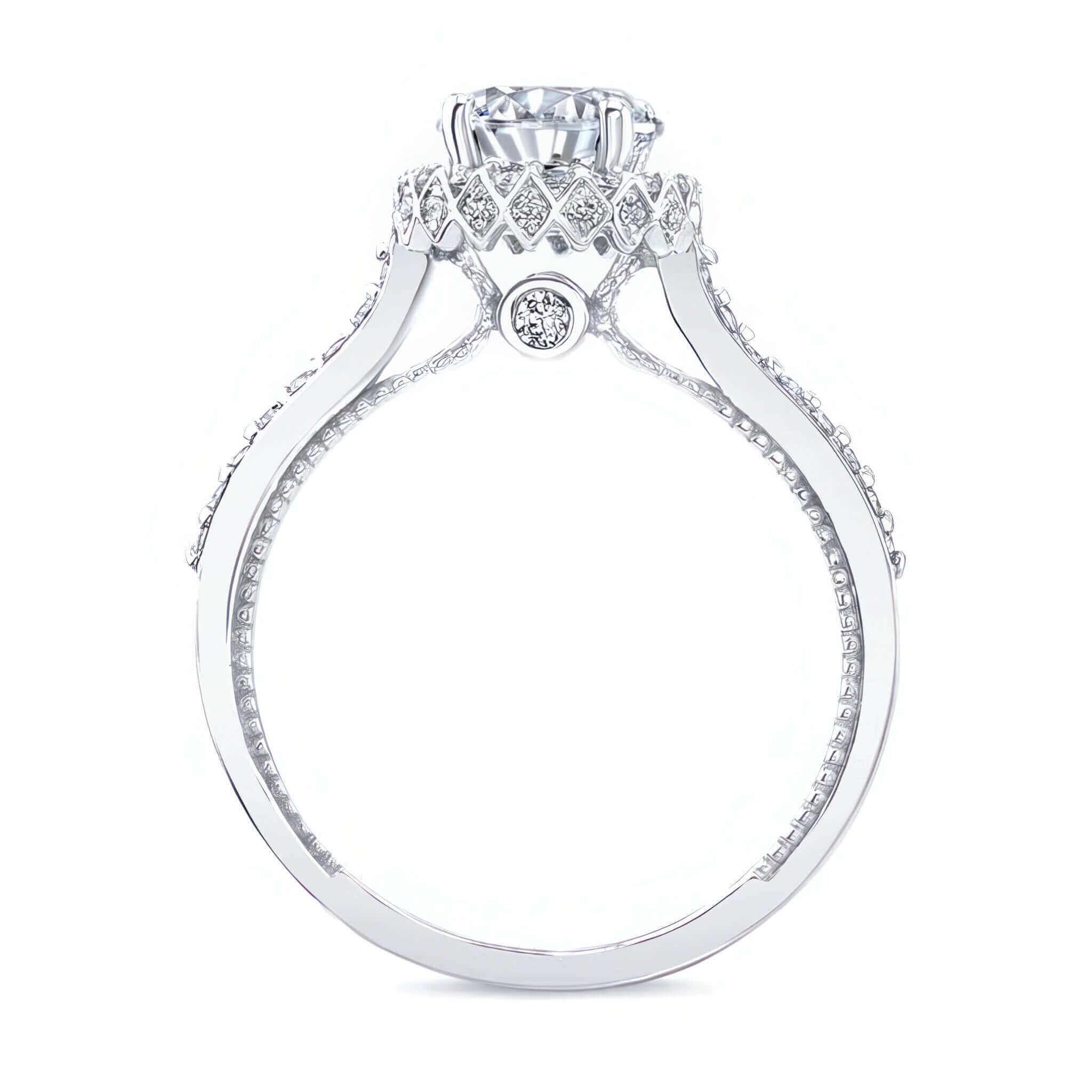 An exquisite round halo moissanite ring with a center surrounded by shared prong diamonds that continue down the shoulders. The profile view reveals a second hidden halo around the sides and two larger bezel set diamonds sitting just beneath the center.
