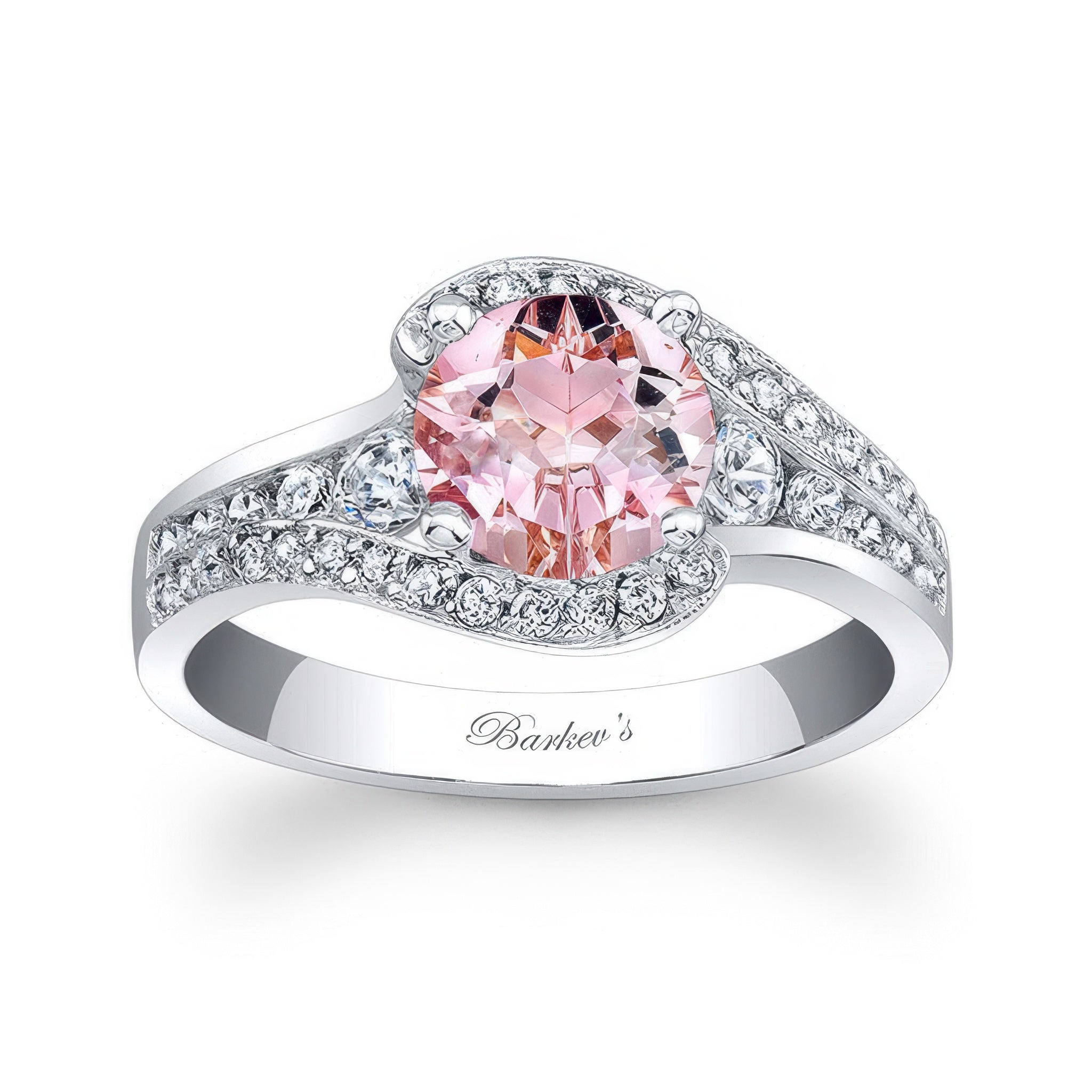 This unique morganite engagement ring features a prong set round morganite center. The shoulders split and curve up to the center with pave set diamonds, while channel set diamonds grace the sides.