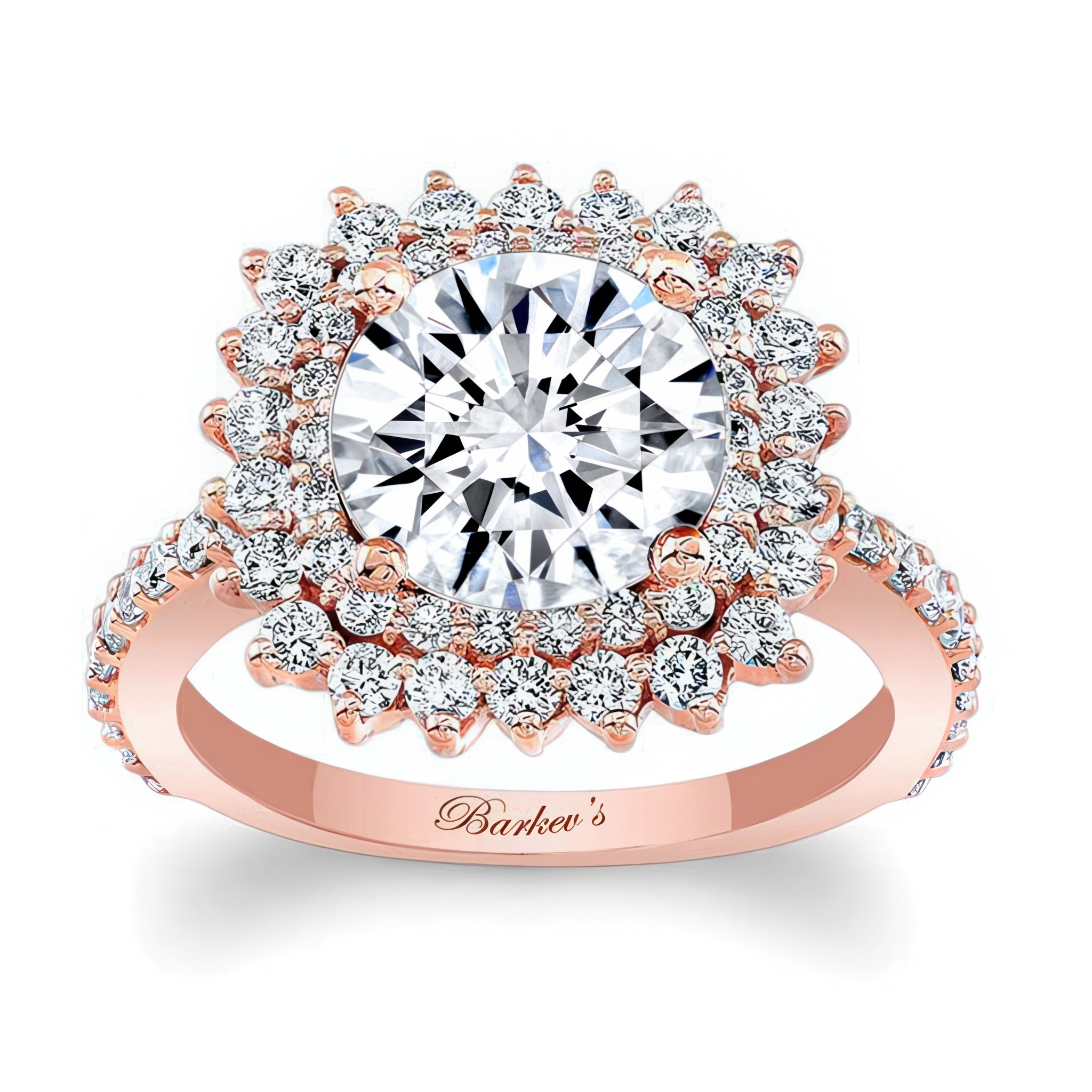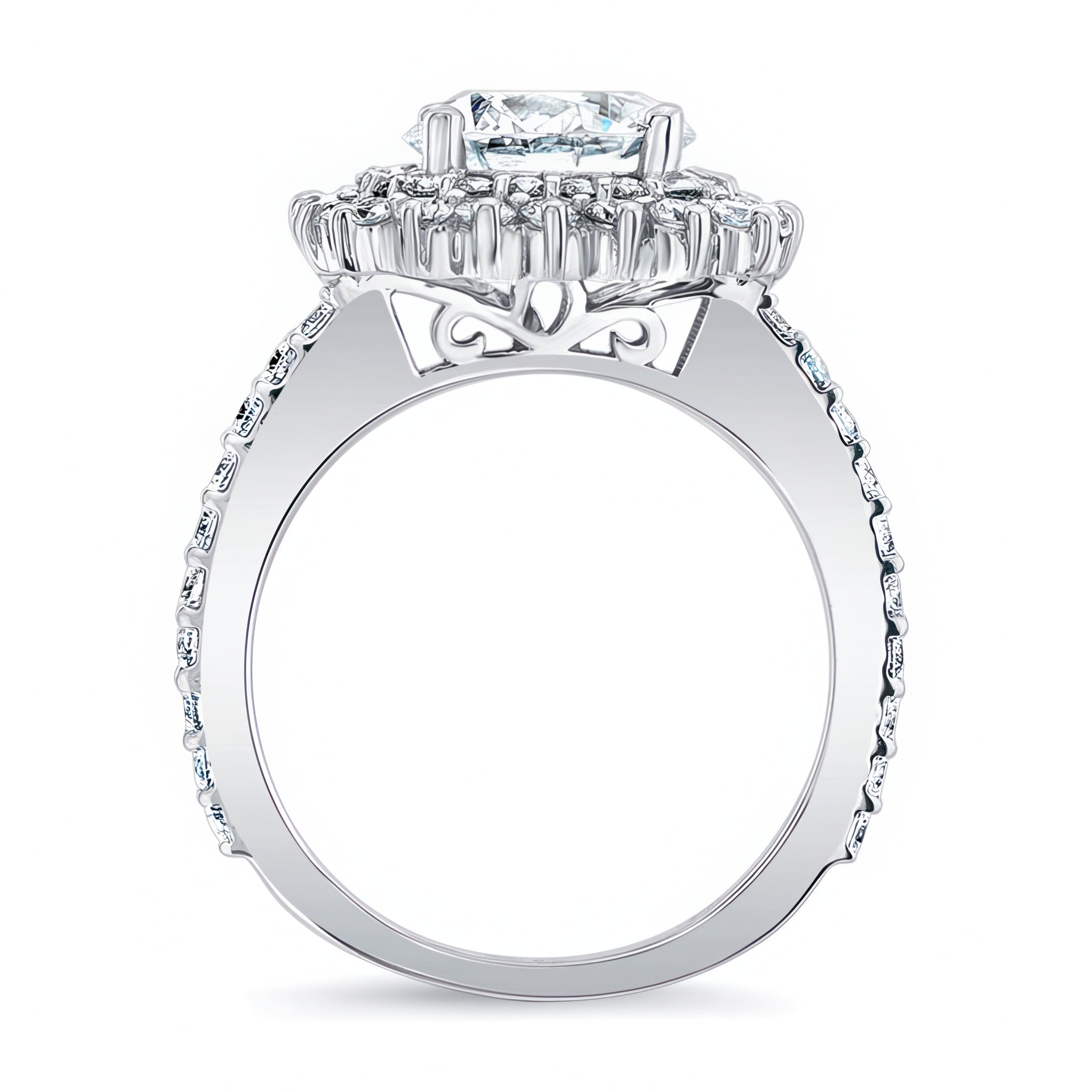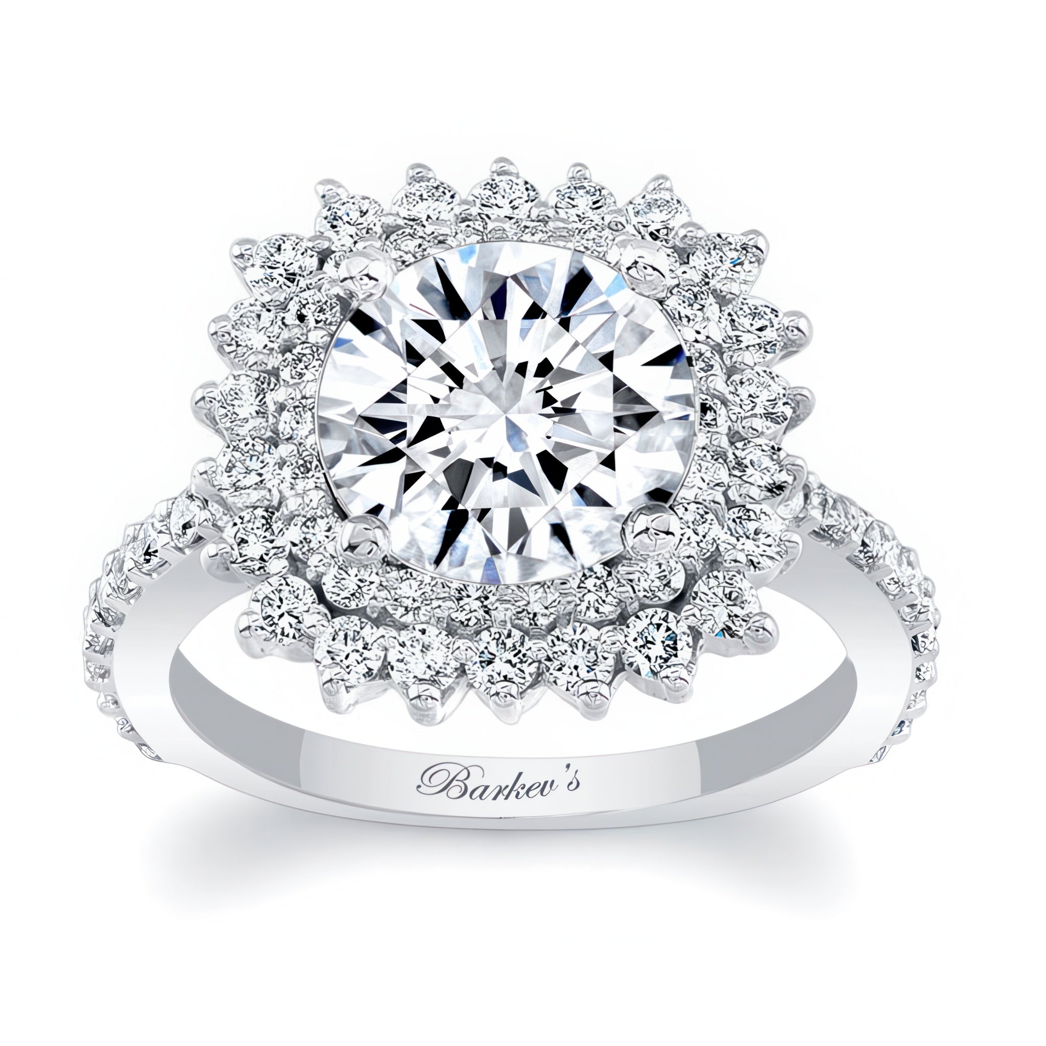 This 3 carat engagement ring features a prong set round center framed by a diamond halo forming a starburst pattern with shared prong set diamond melees running down the shoulders for an added touch of glamour.