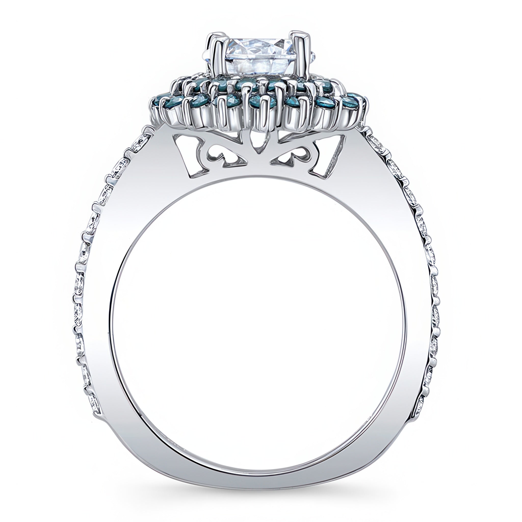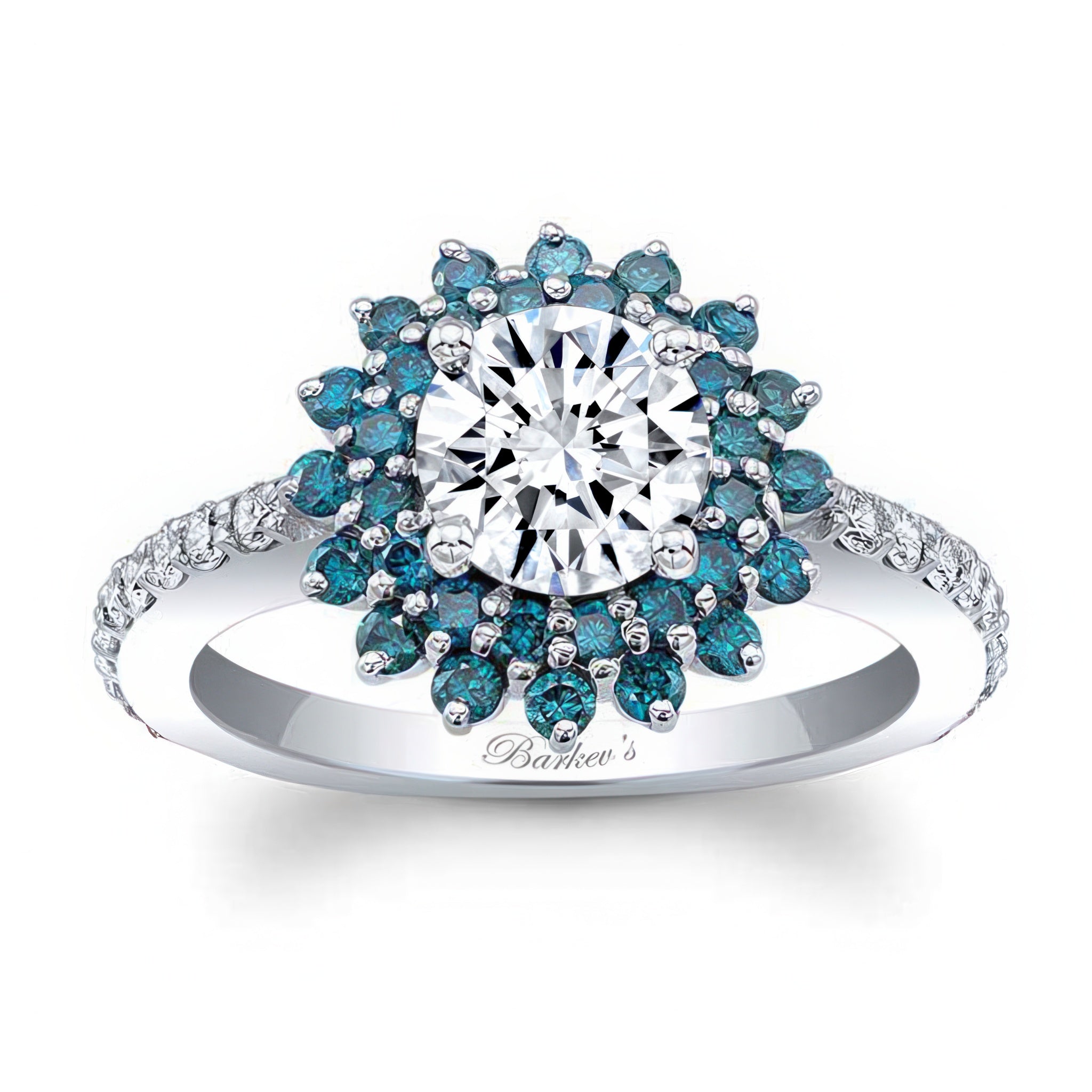 This unique blue diamond accent sunflower ring features a prong set round center encircled with two rows of halo blue diamond melees. The dainty shank is adorned with shared prong set diamonds running down the shoulders for an elegant finish.