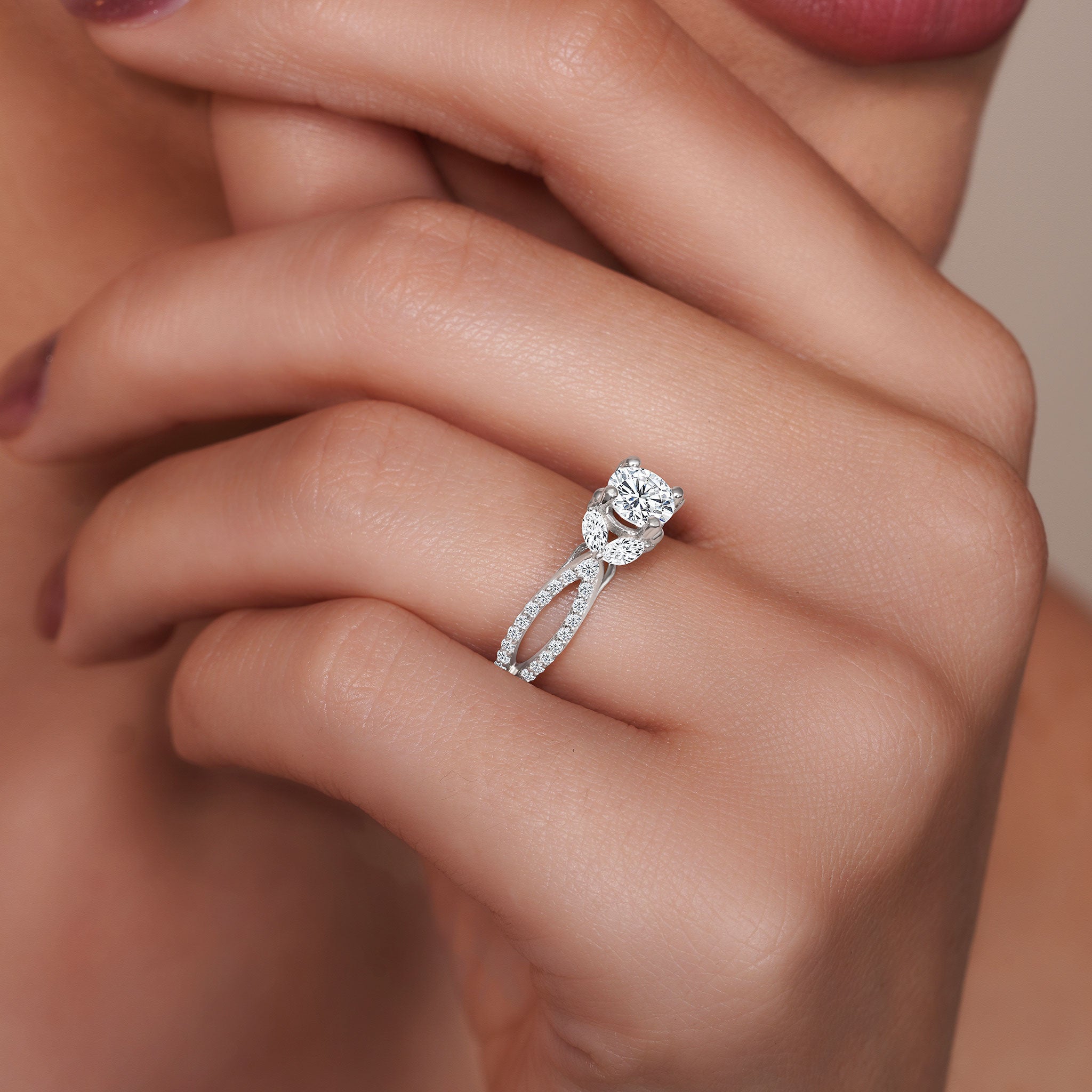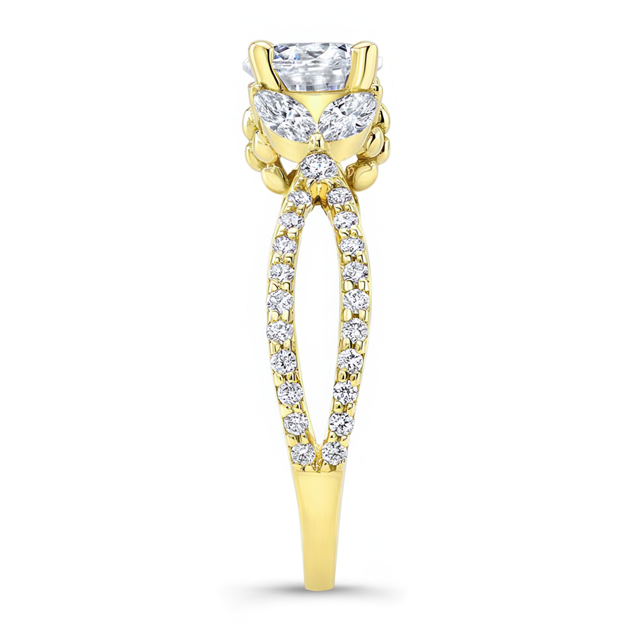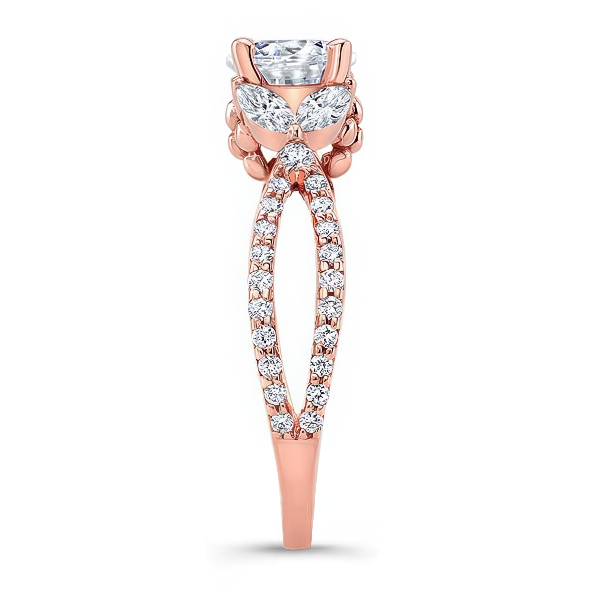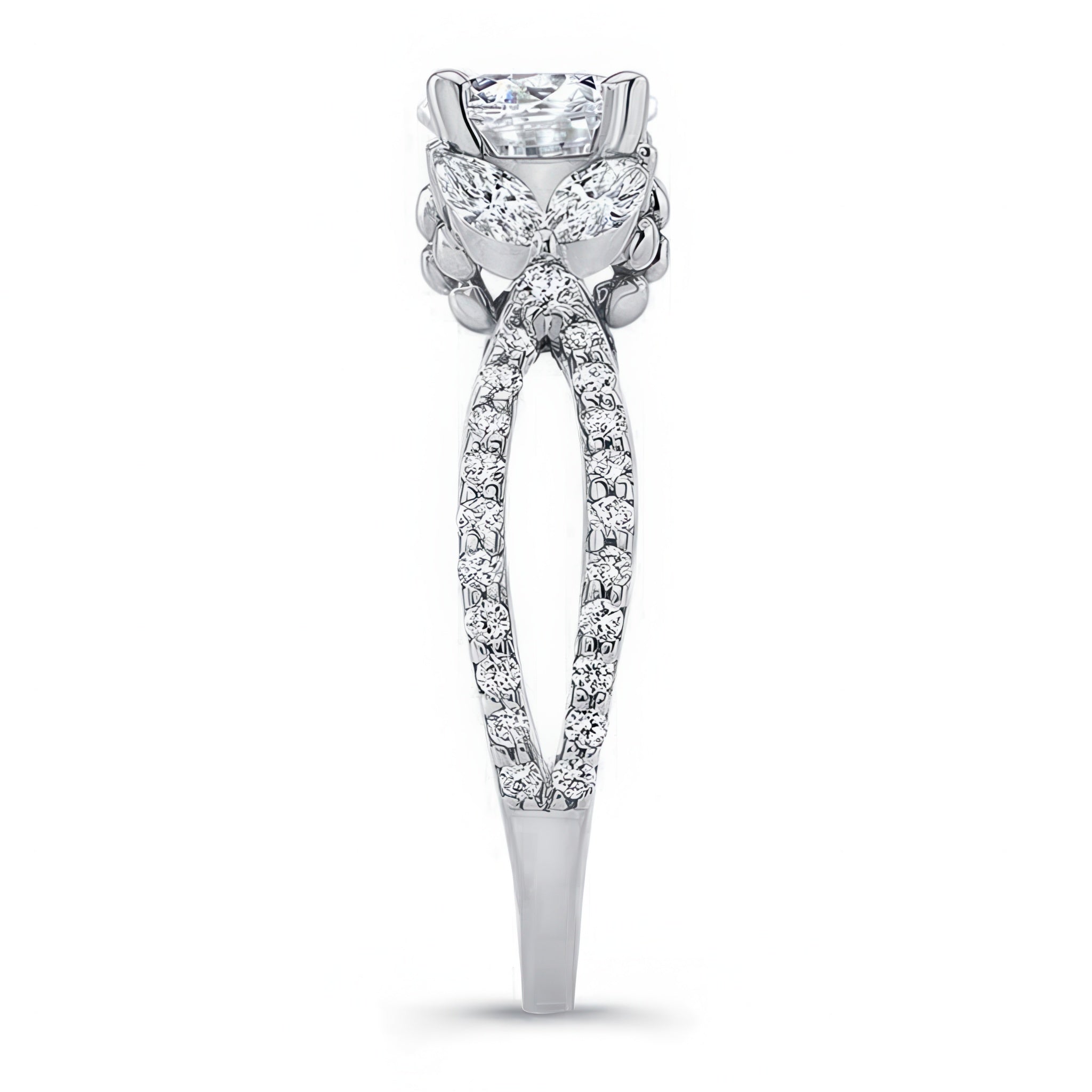 A stunning diamond leaf ring featuring shared prong set round and marquise diamonds forming a beautiful leaf design that frames the prong set round center. The open split shank is also adorned with brilliant shared prong set diamond melees for a stylish look that's absolutely timeless.