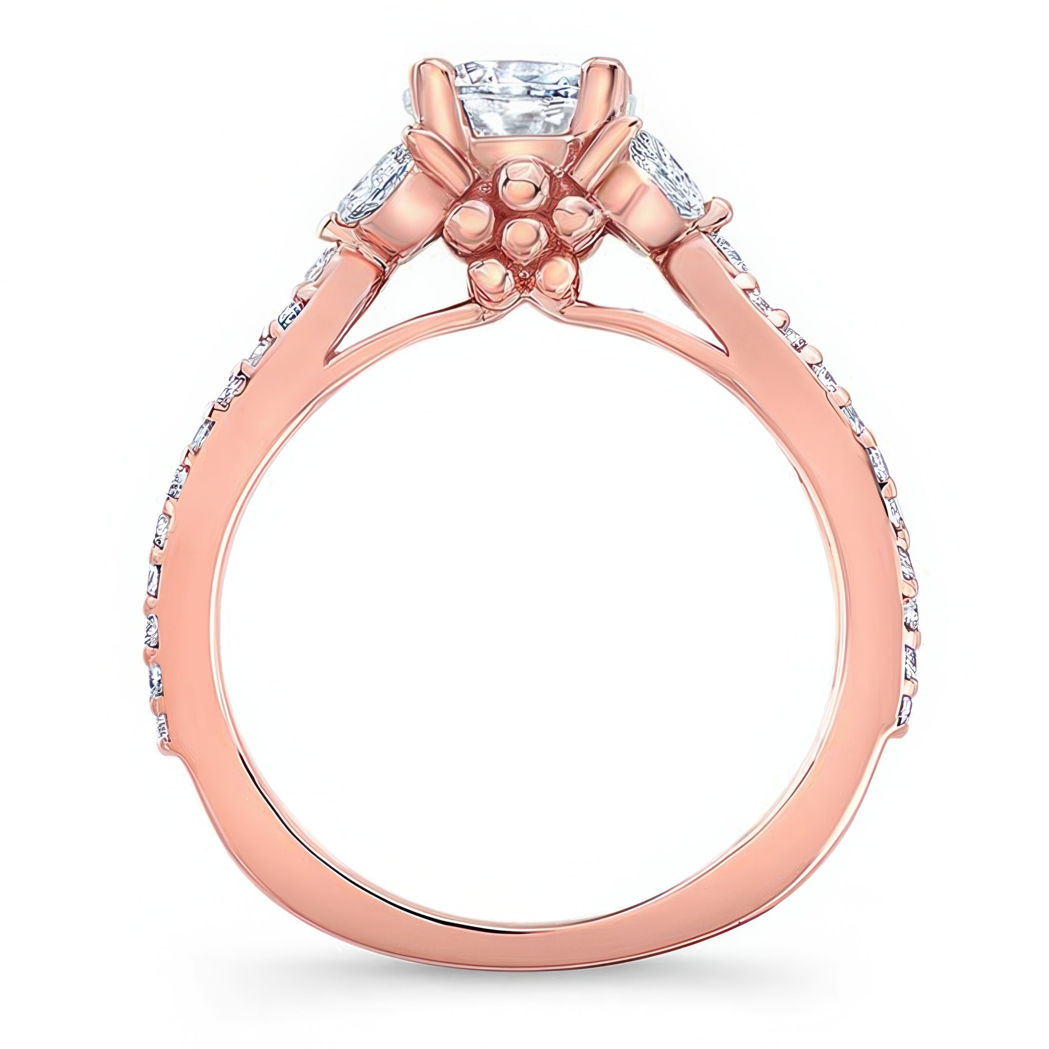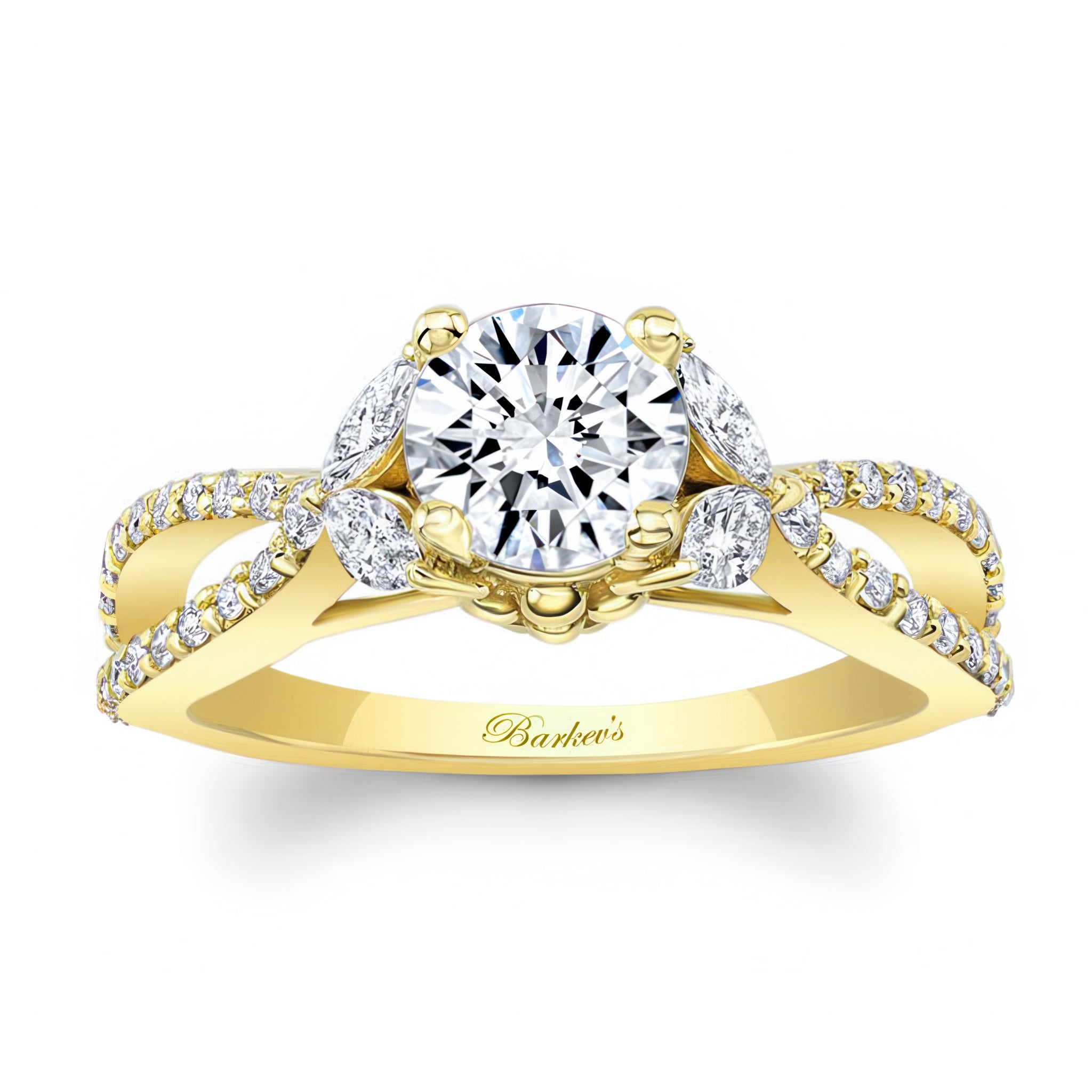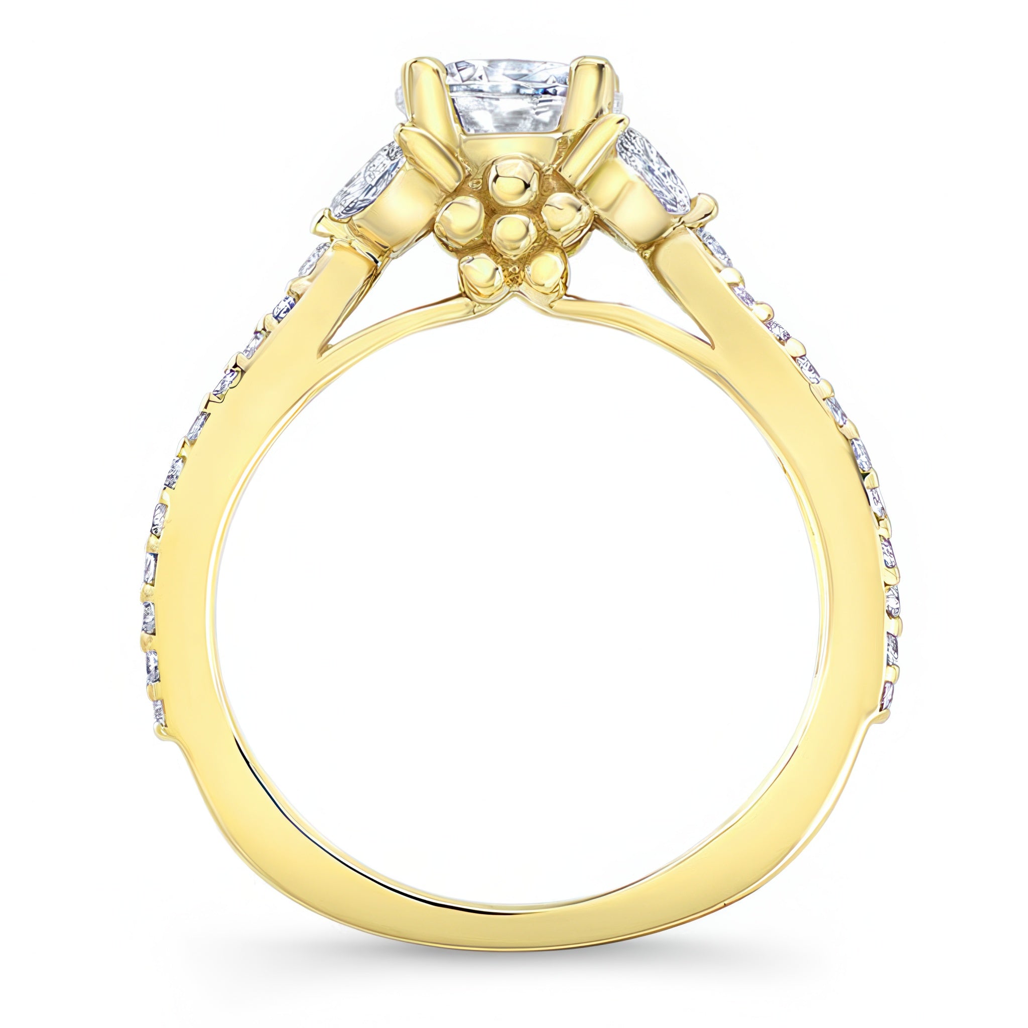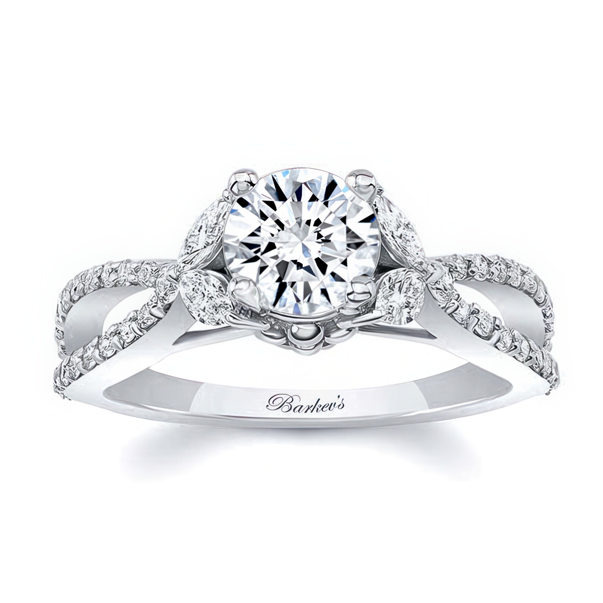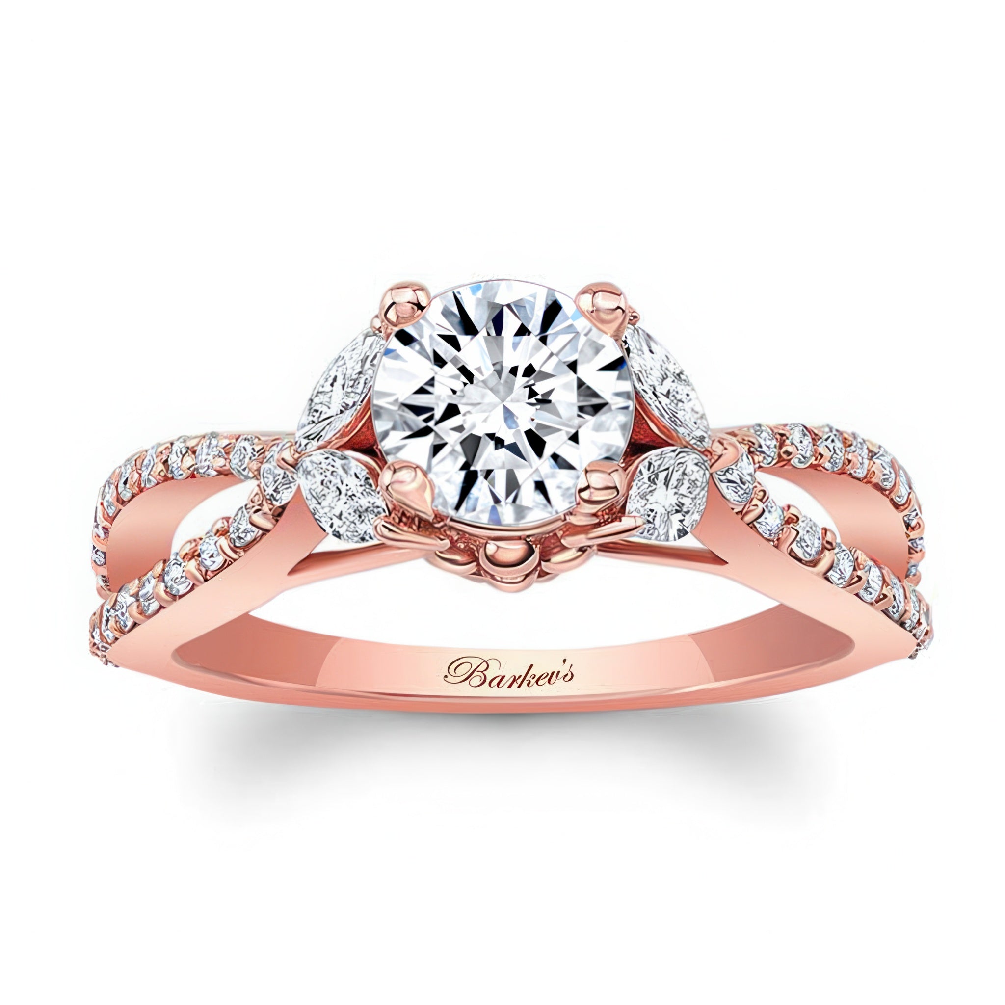 A stunning diamond leaf ring featuring shared prong set round and marquise diamonds forming a beautiful leaf design that frames the prong set round center. The open split shank is also adorned with brilliant shared prong set diamond melees for a stylish look that's absolutely timeless.