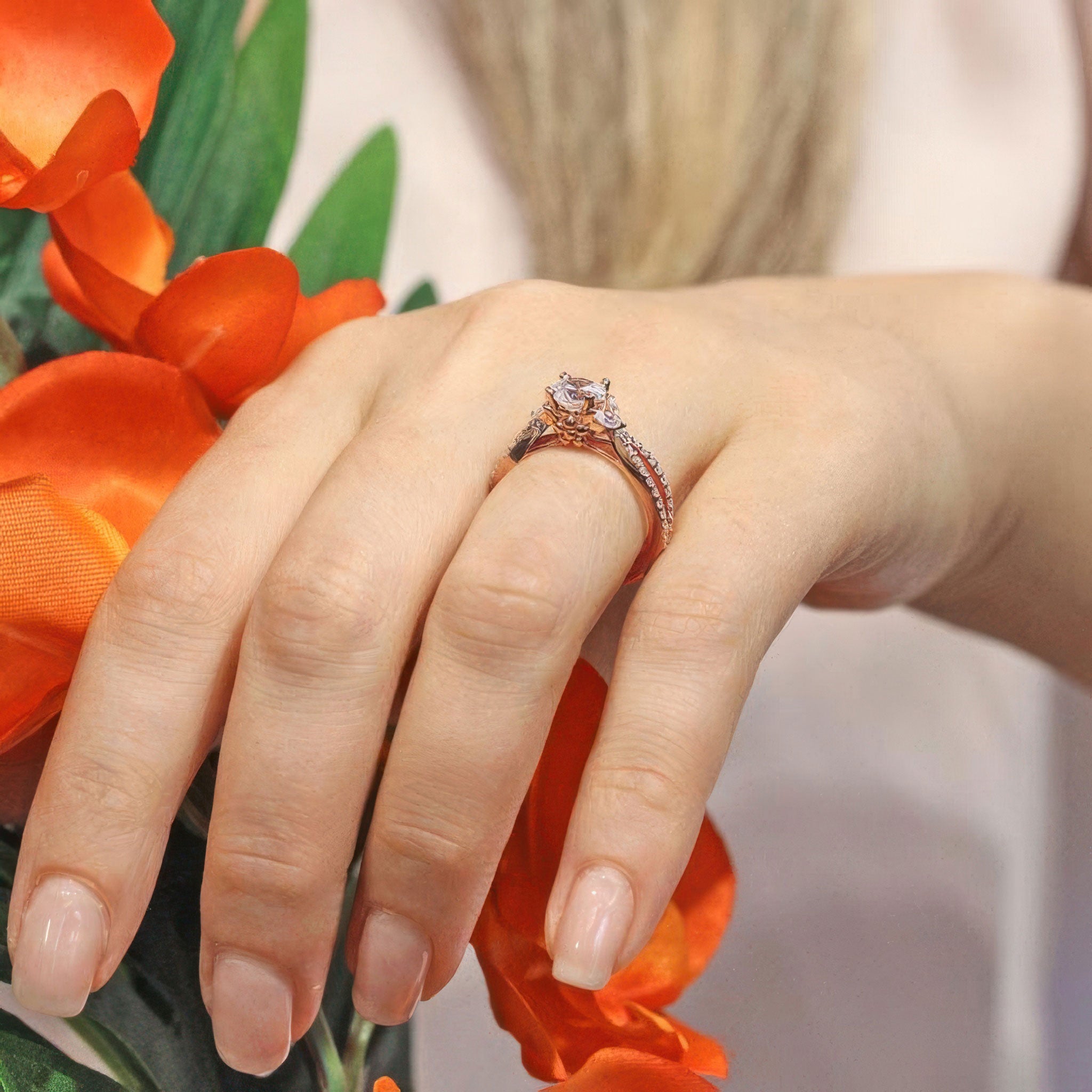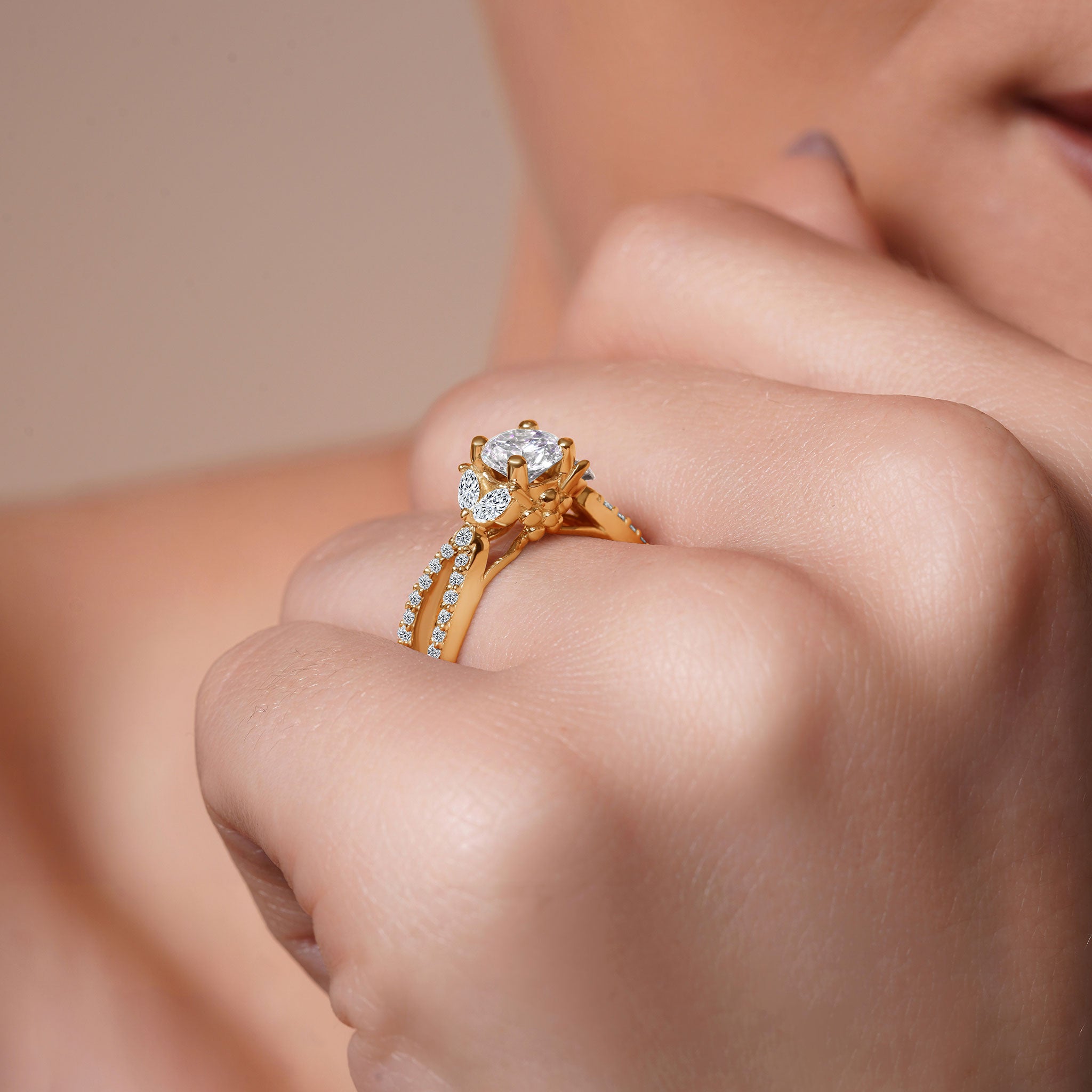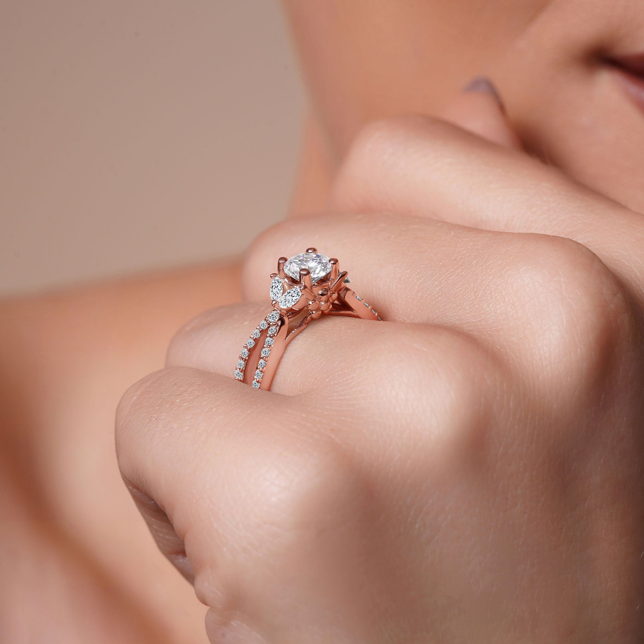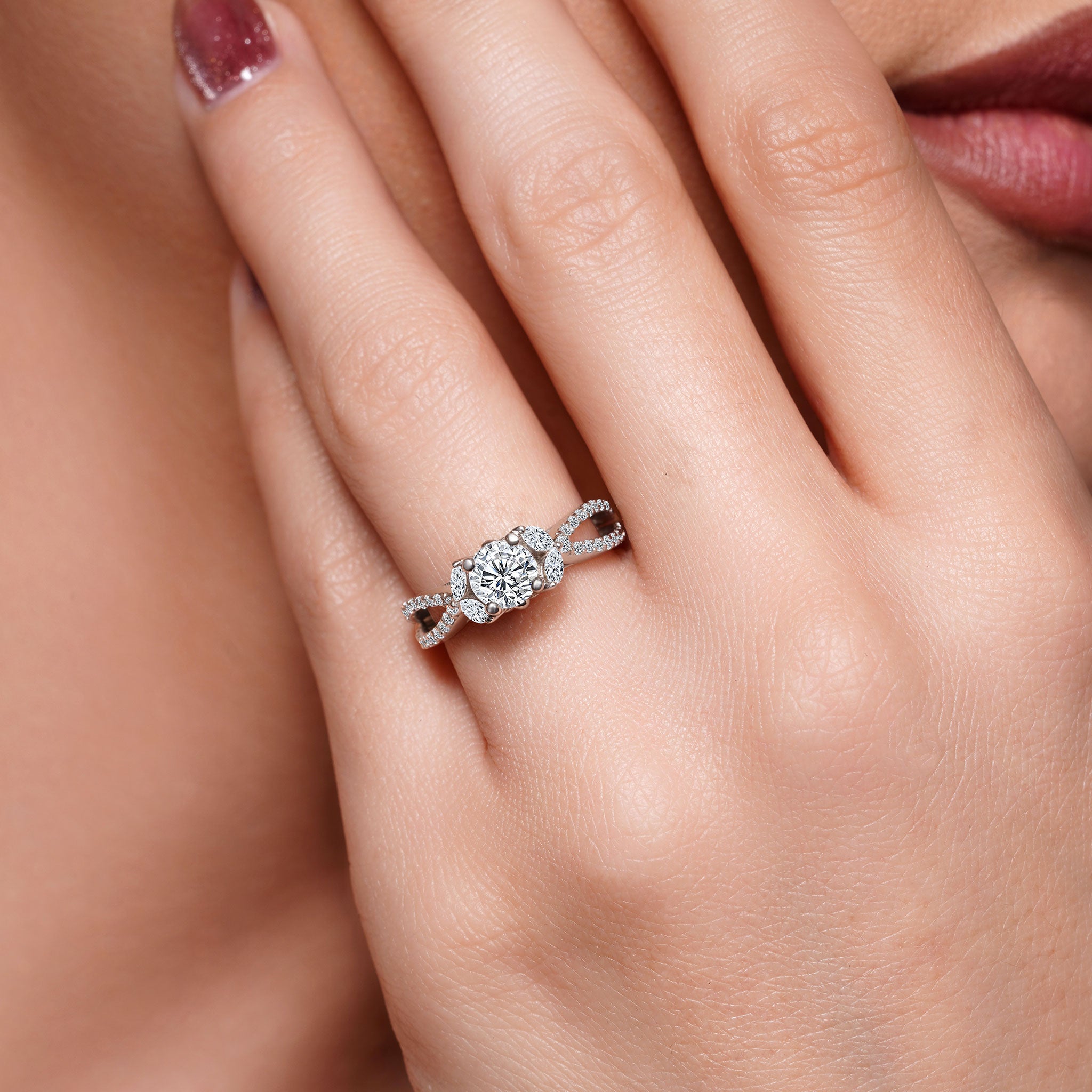 A stunning diamond leaf ring featuring shared prong set round and marquise diamonds forming a beautiful leaf design that frames the prong set round center. The open split shank is also adorned with brilliant shared prong set diamond melees for a stylish look that's absolutely timeless.